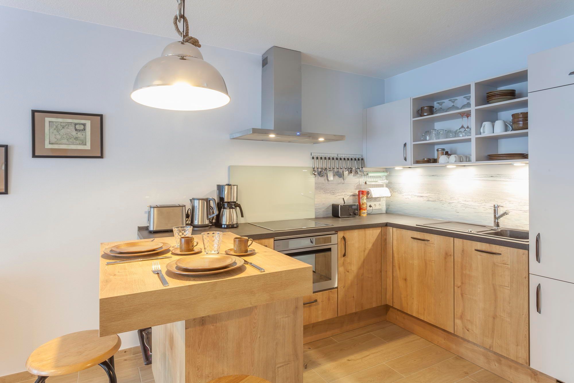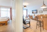 Das kombinierte Wohn- und Esszimmer verfügt über eine Ledersitzgarnitur, einen großformatigen Flachbild-TV, eine sehr gut ausgestattete Küchenzeile und eine vorgelagerte Terrasse, auf der man im wohnungseigenen Strandkorb seinen Morgenkaffee genießen oder an lauen Sommerabenden entspannt draußen sitzen kann.