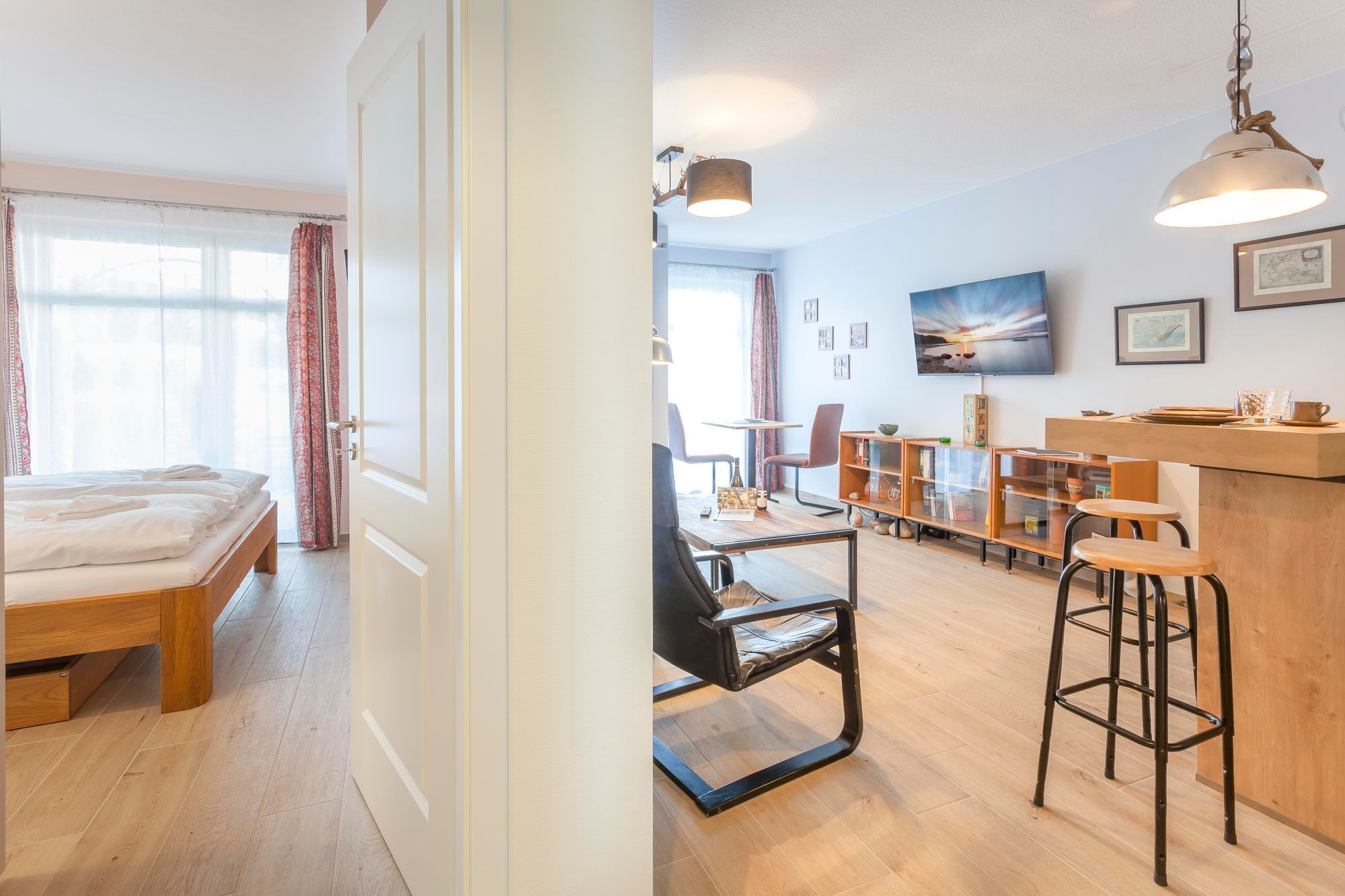 Das im seitlichen Erdgeschoss des Vorderhauses der Villa Louisa gelegene 2-Raum-Appartement ist rund 47 Quadratmeter groß, für zwei Personen ausgelegt und versprüht einen ganz besonderen Charme zwischen Bäderstil-Nostalgie und Moderne. Unter dem in heller Holzoptik gefliesten Boden verbirgt sich eine Fußbodenheizung, die rund ums Jahr für ein angenehmes Raumklima sorgt.