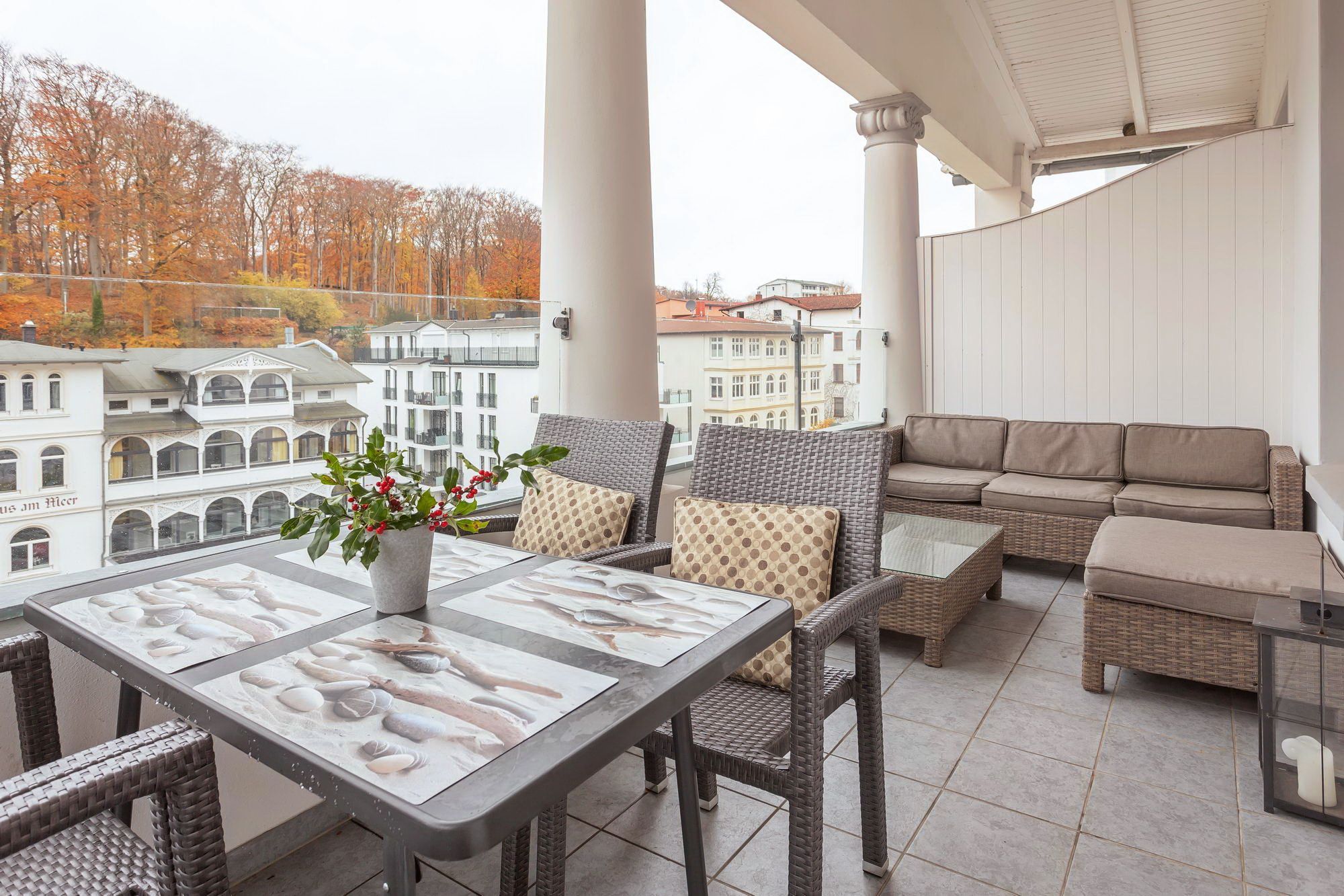 Von der Nachmittags- und Abendsonne beschienen, lädt Sie die große, möblierte Loggia ein, dem bunten Treiben an Sellins Flaniermeile, der Wilhelmstraße, zuzusehen. Dank der Überdachung sitzen Sie hier auch bei schlechterem Wetter geschützt und trocken. Drinnen im Wohnzimmer können Sie es sich auf der Couch gemütlich machen, die sich bei Bedarf in ein 140 x 200 cm großes Bett verwandeln lässt. Ein großer Flachbild-TV mit HDMI-Anschluss, eine Stereoanlage und natürlich auch kostenfreies W-LAN sorgen für die nötige mediale Unterhaltung.