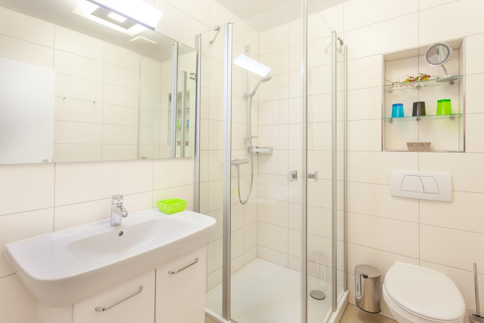 Während in der ganzen Wohnung freundlich-warme Design-Planken verlegt sind, was besonders die Allergiker freuen wird, ist das Badezimmer modern gefliest. Eine moderne Dusche mit Glaswand, WC und ein funktionaler Waschtisch inkl. Fön und Kosmetikspiegel stehen hier für Sie bereit.
