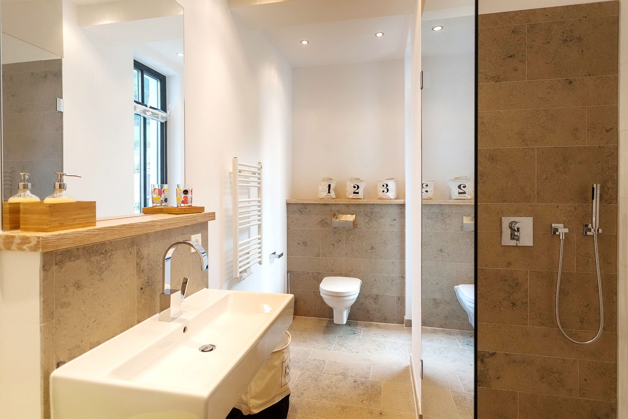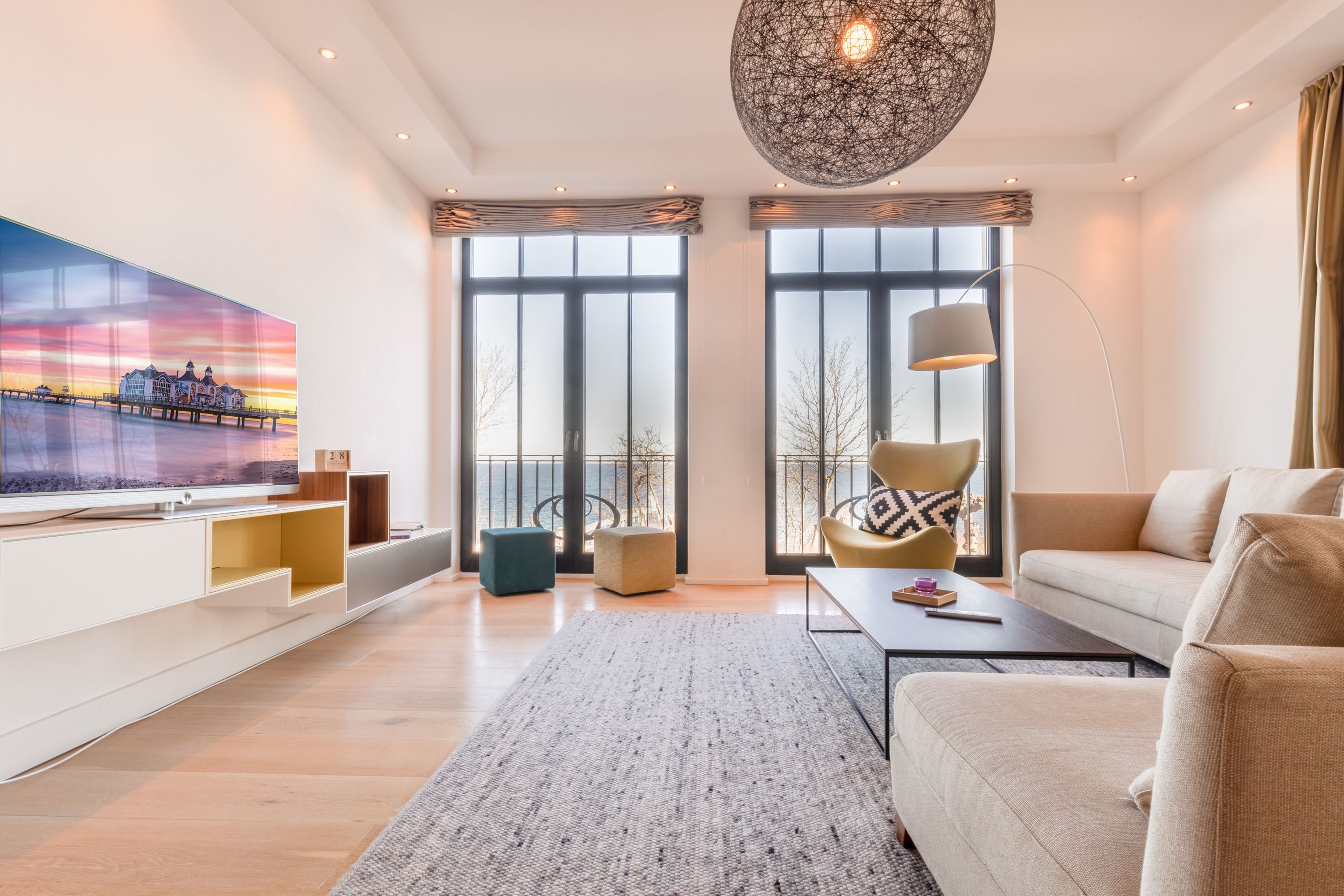Ihr riesiger, fast 70 Quadratmeter großer Wohn- und Essbereich mit Terrassen befindet sich im ersten Obergeschoss der Villa Philine. Ob trautes Kuscheln vor dem Kaminfeuer, spannende Fernsehabende oder Duelle am wohnungseigenen Kickertisch, relaxter Musikgenuss oder genussvolles Kochen für all Ihre Wünsche und Ideen wurde vorgesorgt. All das natürlich begleitet vom immer wieder aufs Neue faszinierenden Blick aufs Meer. Ein paar Treppenstufen tiefer finden Sie Ihre drei Schlafzimmer mit bequemen Doppelbetten von SCHRAMM, Loewe-TV und angeschlossenen Ensuite-Bädern, ausgestattet mit edlen Manufakturfliesen aus Naturstein, feinster Keramik sowie ebenerdigen Duschen bzw. Badewanne. Im Erdgeschoss befindet sich zudem Ihre private Sauna, in der Sie sich nach einem erlebnisreichen Tag auf der Insel Rügen entspannen und wärmen können.