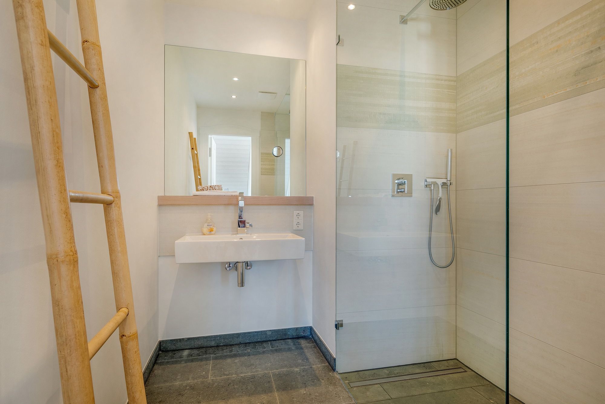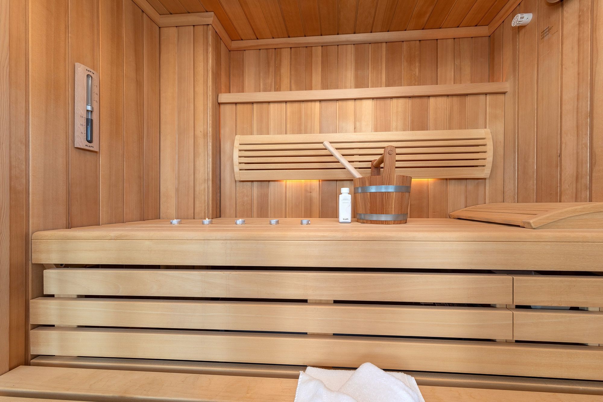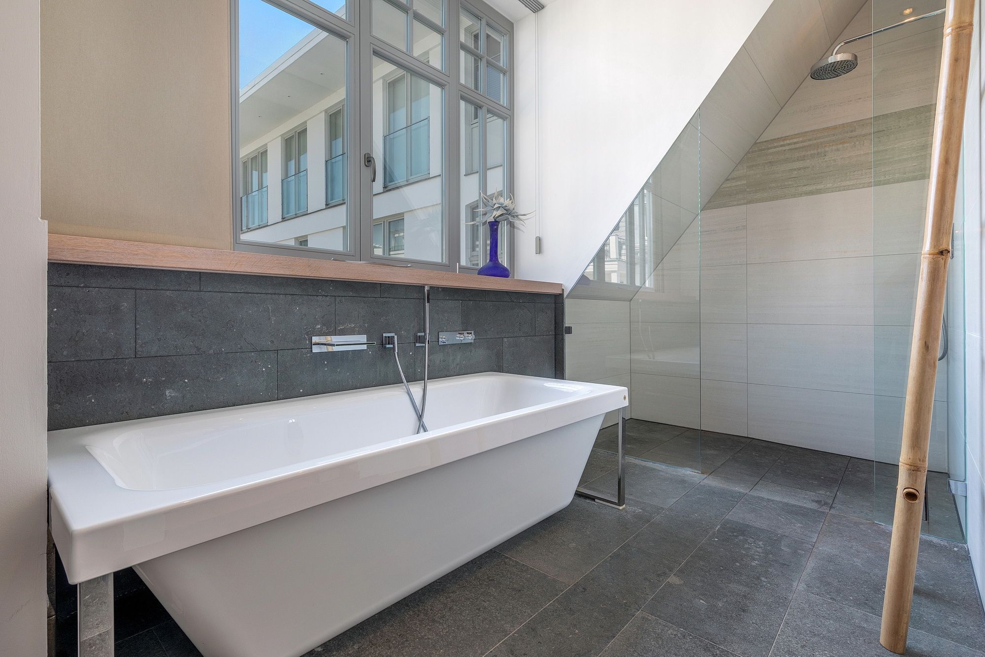 Zwei Schlafzimmer mit komfortablen Doppelbetten strahlen elegante Behaglichkeit aus. Die bodentiefen Fenster lassen viel Tageslicht ein, können aber selbstverständlich auch verdunkelt werden. Über eine Flügeltür gelangen Sie auf die nordöstlich ausgerichteten Balkone. Dem Schlafzimmer angeschlossen ist jeweils ein Ensuite-Bad, dessen dunkelgrauen Ceralith-Bodenplatten, die fugenlos wie aus einem Stück gegossen erscheinen, schon im ersten Moment von edlem Badevergnügen künden. Villeroy & Boch- Waschbecken mit Dornbracht Armaturen, das Wannenbad bzw. die großzügige, ebenerdige Dusche und die wohnungseigene Finnische Sauna sind Annehmlichkeiten, die man gern nutzt. Ein separates Gäste-WC im Eingangsbereich ist ebenfalls vorhanden.