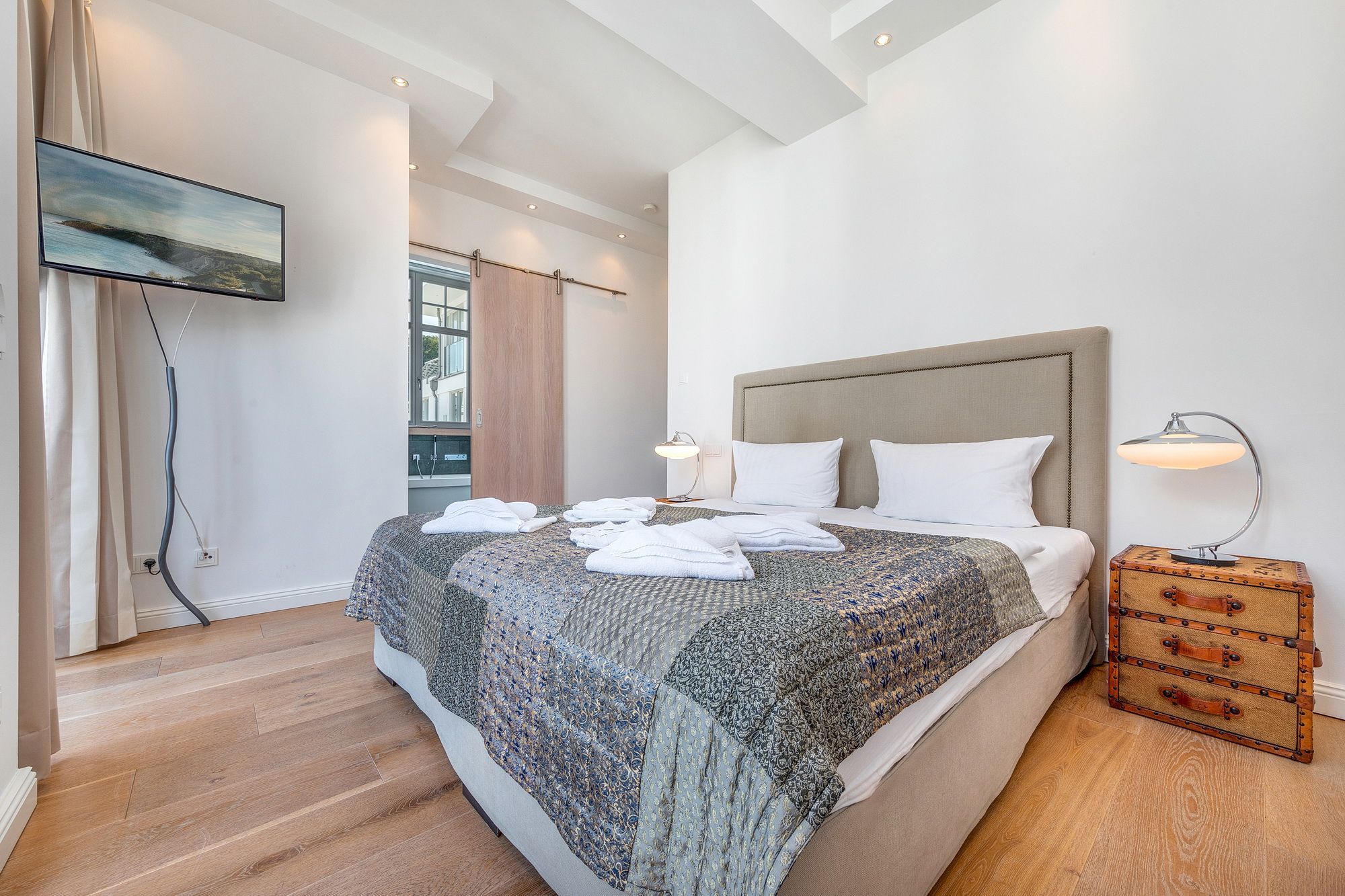 Eine geschwungene Treppe führt hinauf in die zweite Ebene der Wohnung. Hier verspricht Ihnen der Wohnbereich mit Kamin, Terrasse, einem 40-Zoll LED-Fernseher, HiFi-Anlage mit DVD/CD-Player, iPod-Docking-Station sowie kostenfreiem W-LAN schöne Stunden der Erholung. Und falls Sie sich mal nicht für einen Sender entscheiden können, dann stehen in den unteren Räumen natürlich ebenfalls TV-Geräte für Sie bereit.