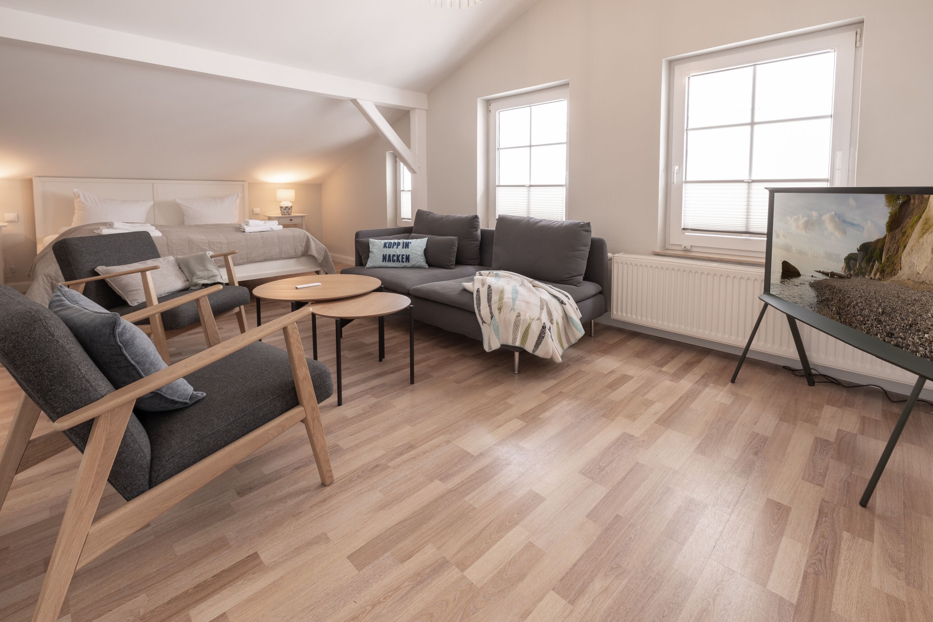 Die Ferienwohnung Wind & Wolke ist eine schnuckelige 2-Zimmer-Wohnung im Obergeschoss der Villa Granitz. Hell und freundlich wirkt sie und gefällt gleichwohl mit ihren romantischen Dachschrägen und dem sorgsam ausgesuchten Interieur. Alles wurde so arrangiert, dass auf den 50 Quadratmetern Wohnfläche ein hübsches Urlaubsdomizil mit genügend Platz für bis zu vier Personen entstanden ist. Im kombinierten Wohn- und Schlafraum laden bequeme Polstermöbel zum Relaxen ein. Im hinteren Bereich wartet ein großes Doppelbett auf Sie. Zwei weitere Betten befinden sich im separaten Schlafzimmer.