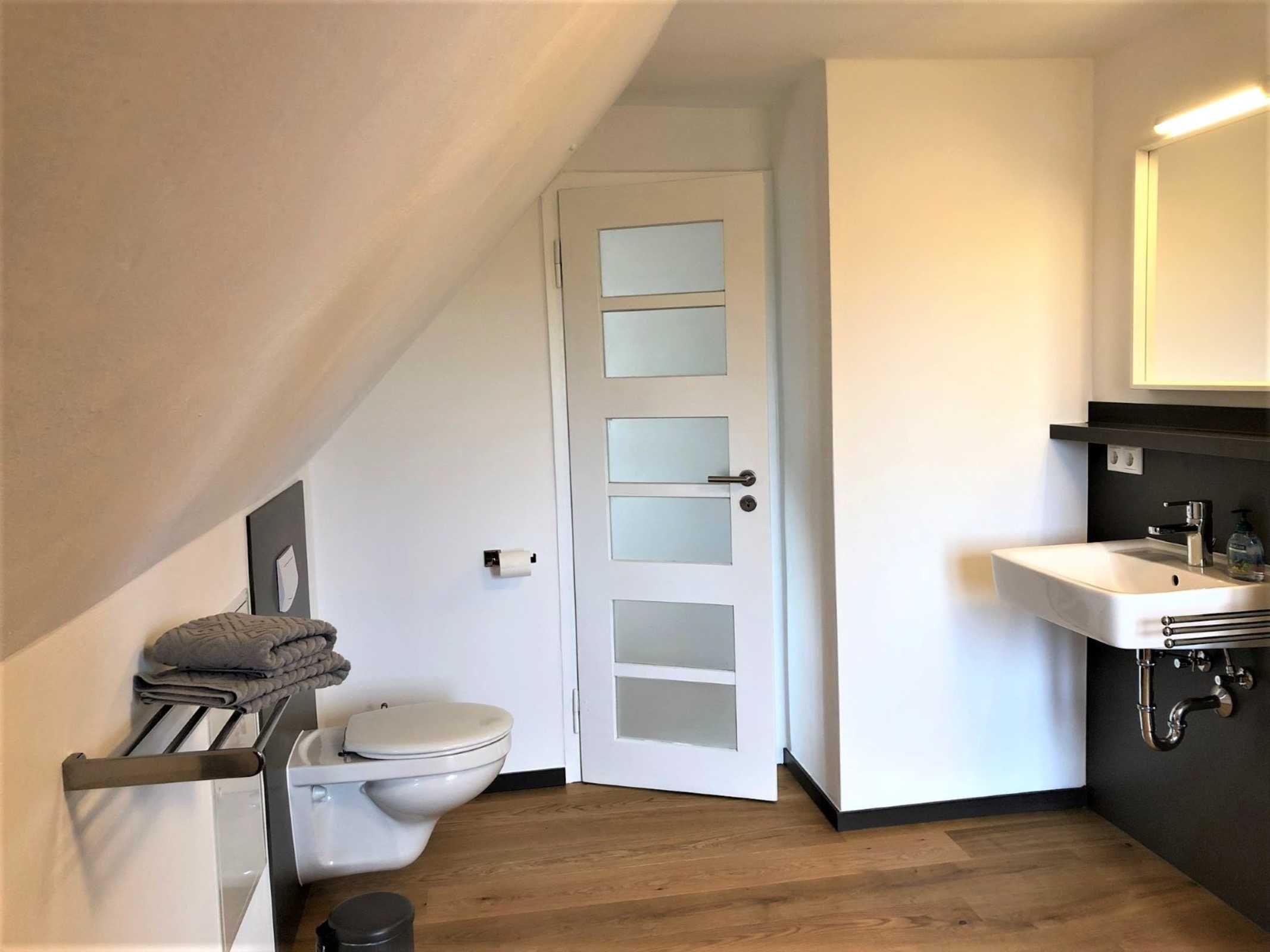 In dem ansprechenden, modernen Tageslicht-Badezimmer mit Blick auf das Haff im Obergeschoß befinden sich eine geräumige Dusche, Waschbecken und WC. Im Erdgeschoß gibt es zusätzlich ein Gäste WC mit einer Waschgelegenheit.
