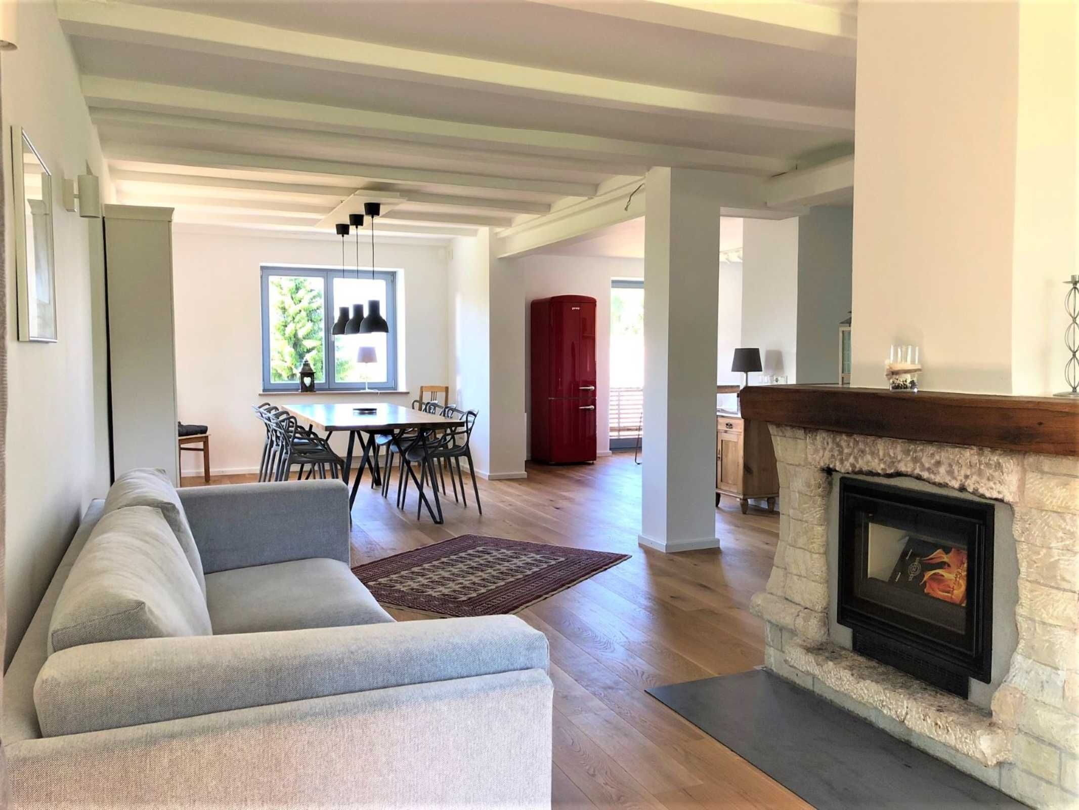 In dem offenen und lichtdurchfluteten Wohn- Ess- und Küchenbereich sorgen ein Kaminofen und ein Heizkamin an kühlen Tagen für eine wohlige Wärme. Ein großer Flachbild-TV und ein Bluetooth Lautsprecher sorgen für Entertainment. Ausreichend Infomaterial zu den Sehenswürdigkeiten in unserer Region, diverse Bücher und Gesellschaftsspiele für Groß & Klein sind vorhanden.