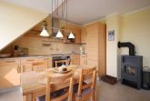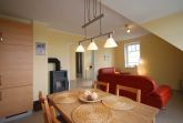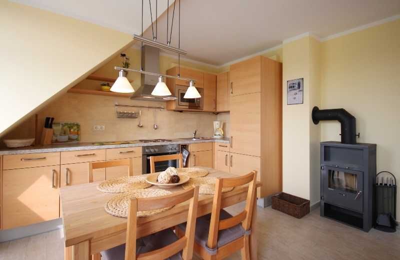 In einem Schlafzimmer befinden sich zwei Einzelbetten und ein TV-Gerät, im zweiten Schlafzimmer steht ein komfortables Doppelbett für Sie bereit. Im lichtdurchfluteten Wohn-Essraum ist eine voll ausgestattete Einbauküche mit einem Vier-Kochplatten-Herd. Für Gemütlichkeit sorgen die Fußbodenheizung und der Kamin (Kaminholz muss selbst organisiert werden). Ein Duschbad mit Badewanne gehört selbstverständlich auch zu der Ferienwohnung.