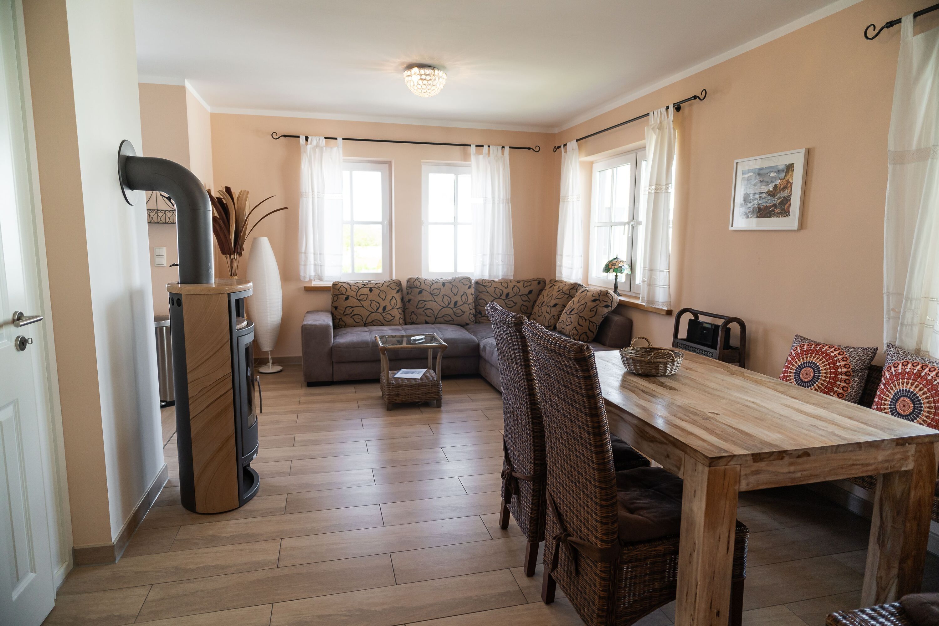 Das Mandelcreme-angehauchte Ambiente des Wohnraumes reizt mit vielen Holzelementen und ist ein Hingucker für Naturliebhaber. Die miteinander harmonierende Wohn- und Schlafbereiche ermöglichen Zugang zu den dazugehörigen möblierten Balkonen, die alle einen weiten Meerblick versprechen. Die einladenden Schlafbereiche im Obergeschoss sind einerseits mit Doppelbett und Kleiderschrank und andererseits mit Einzelbett und Klappcouch (90 x 200 cm / Schaumstoffmatratze) ausgestattet. Bei regnerischen Tagen ist durch eine gute Multimediaausstattung in Form von einem TV-Flatscreen, einem Radio, einem CD-Player und einer kleinen Spielesammlung für angenehme Abwechslung gesorgt.