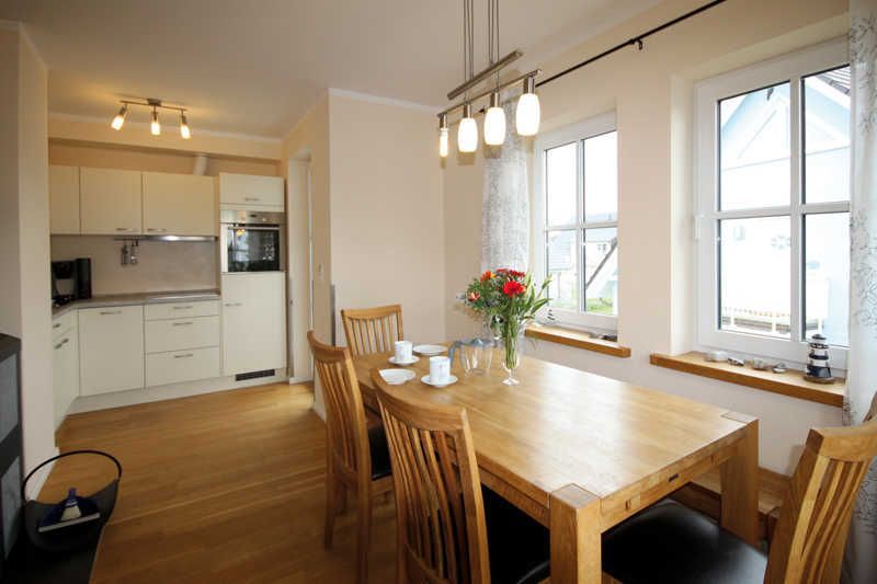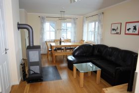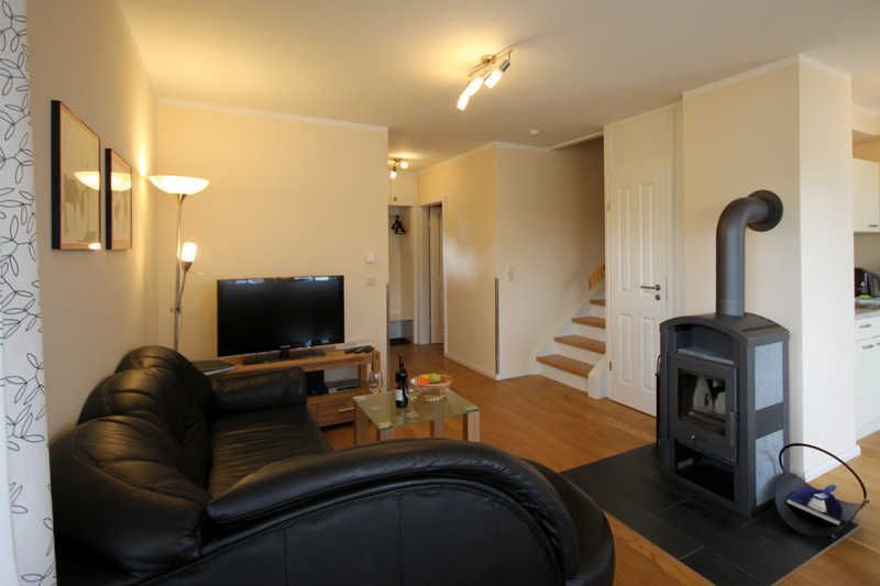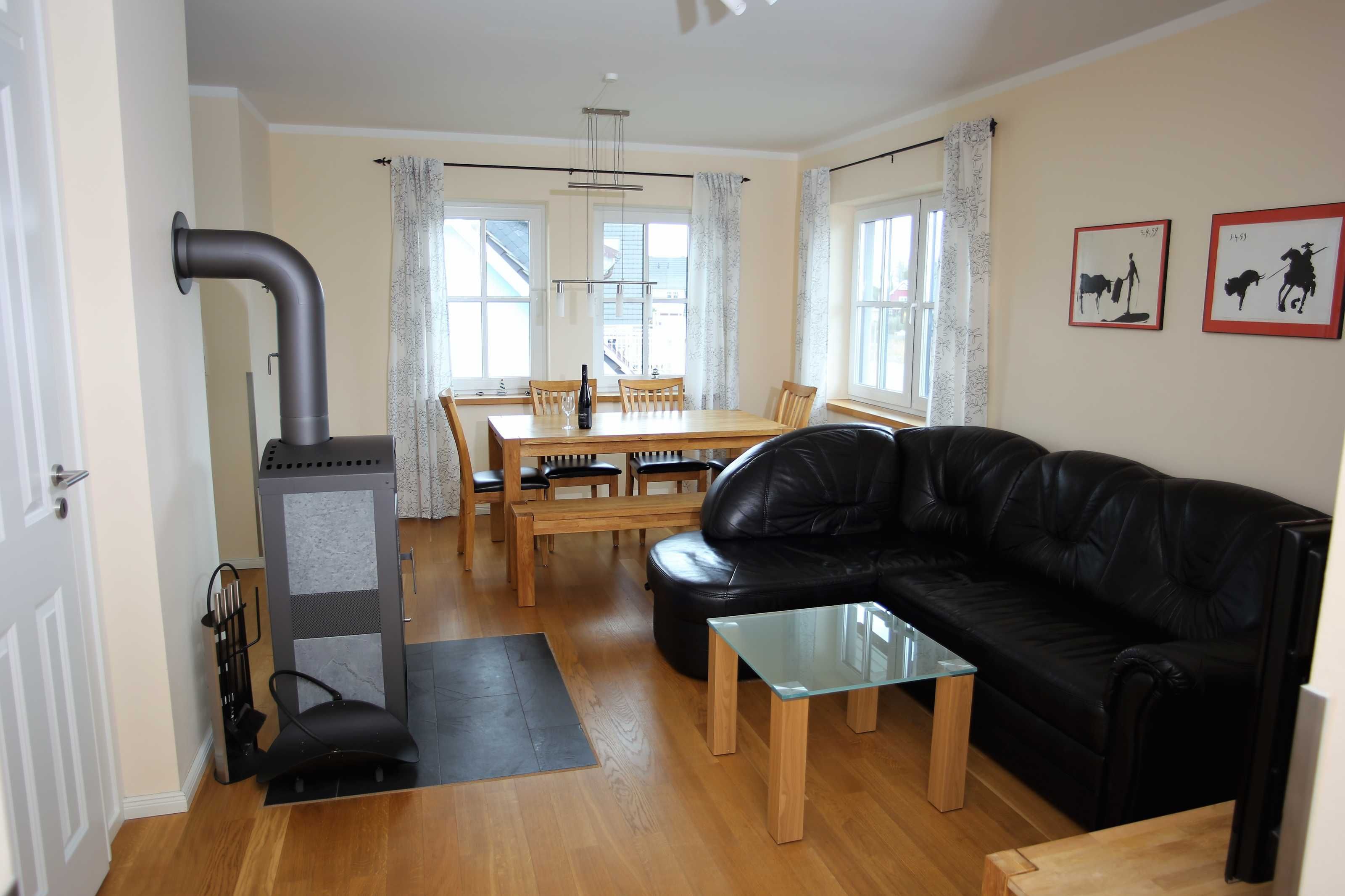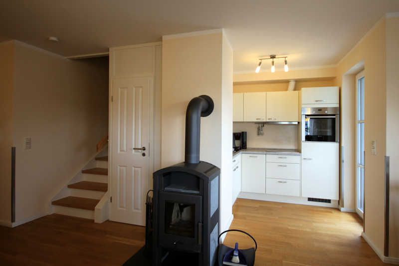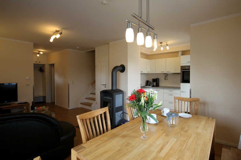 Das offene Wohn-/ Esszimmer empfängt Sie mit einem rustikalem Kaminofen (Brennholz muss selbst organisiert werden), einer ausziehbarer Eckcouch und einem großem Esstisch mit Stühlen und Sitzbank . Ein Flatscreen-TV und ein Musikradio gehören zum technischen Zubehör des Raums. Die Einbauküche ist voll ausgestattet mit Geschirrspüler, Kühl-/Gefrierkombi, Ceranfeld, Backofen, Kaffeemaschine, Wasserkocher und Toaster. Das Bad besticht mit einer ebenerdigen Dusche. Ein kleiner separater Abstellraum bietet Platz für Ihre Koffer und andere Mitbringsel.