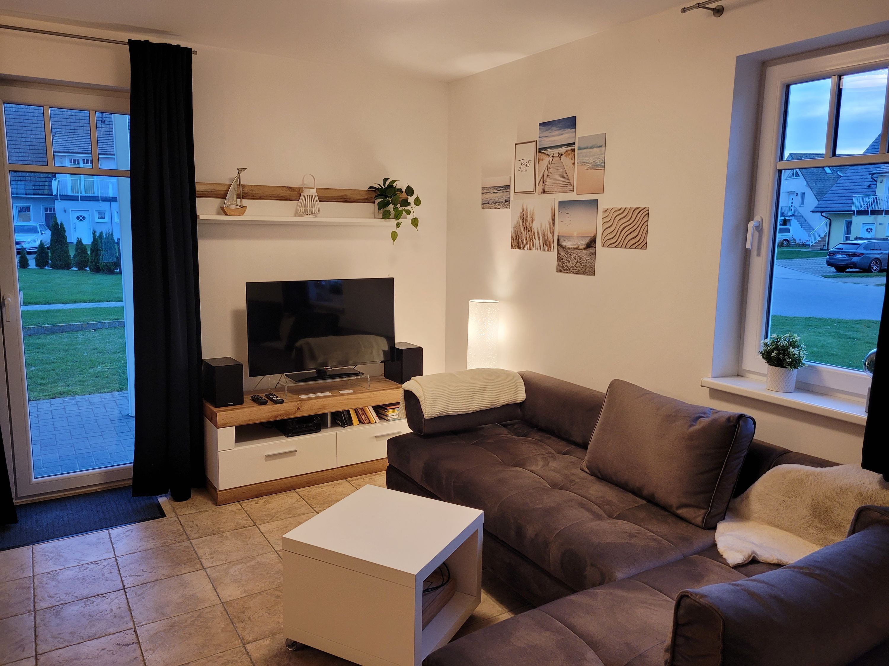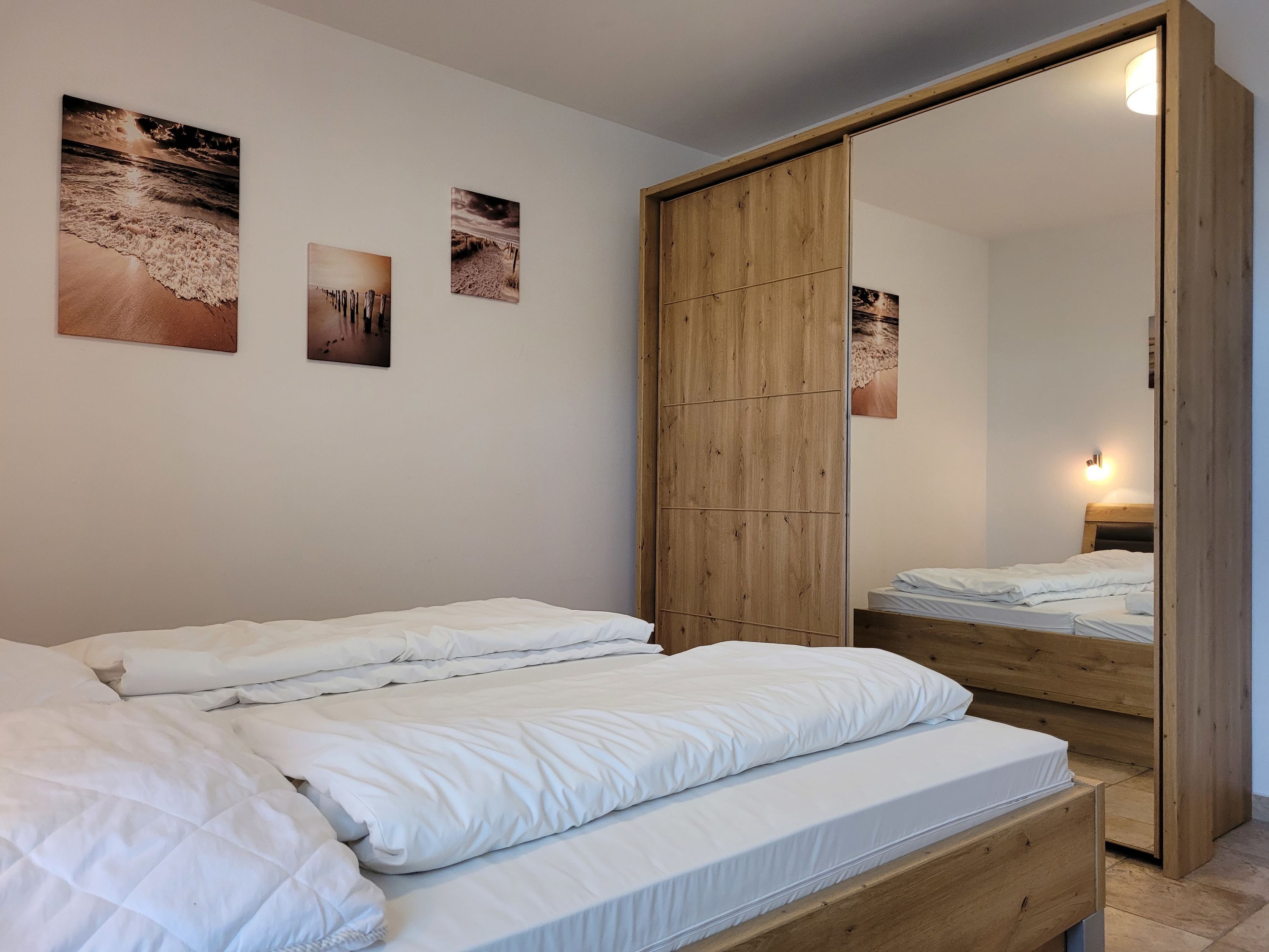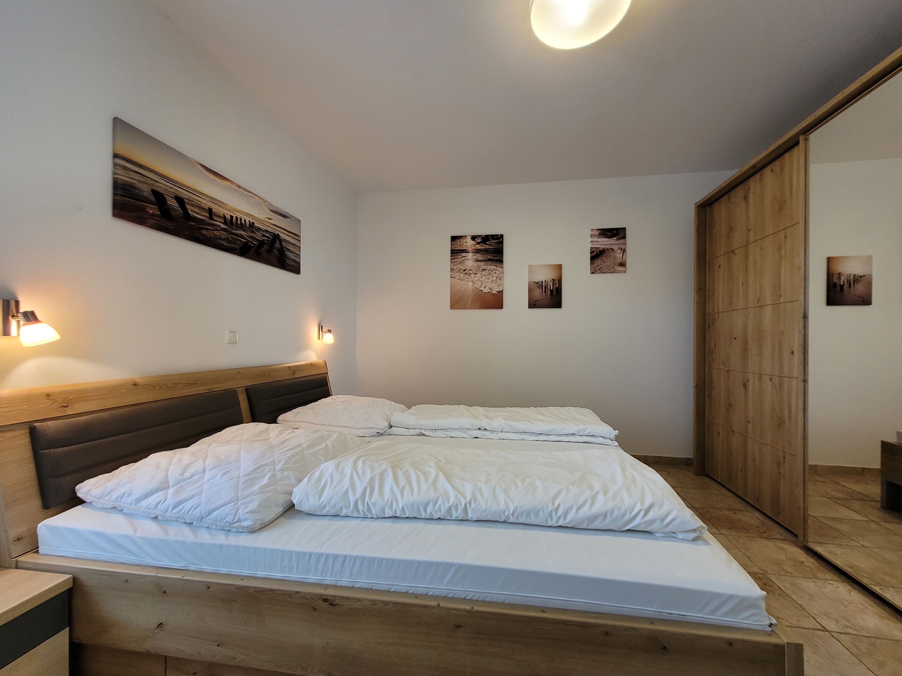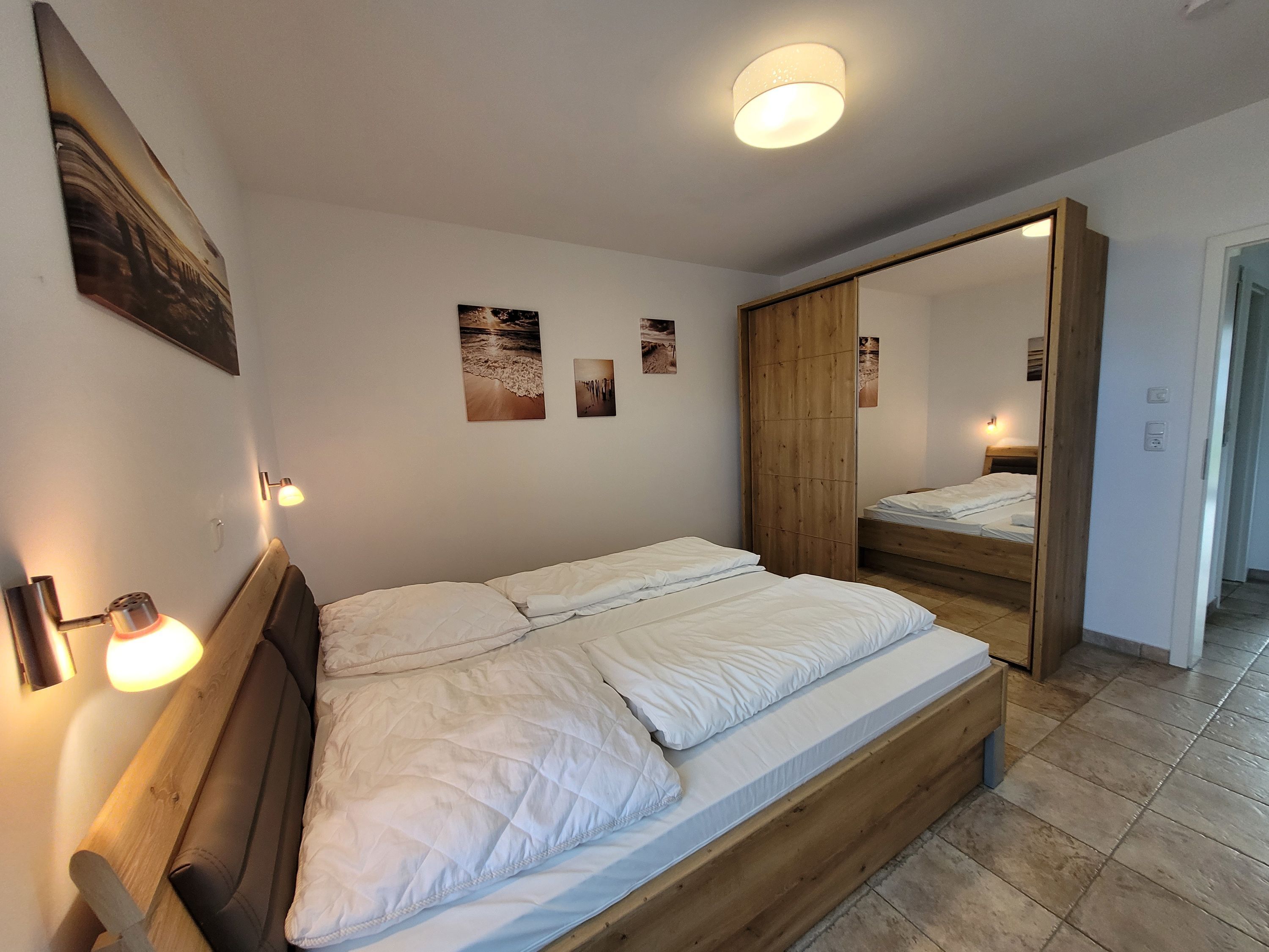 Das Wohnzimmer mit großer (Schlaf-)Couch, Flat-TV und gemütlichem Essbereich lädt zum Kochen und Verweilen ein. Die integrierte Einbauküche ist mit Geschirrspüler, Vier-Platten-Herd (kein Backofen), Dunstabzugshaube, Kühlschrank mit Gefrierfach, Kaffeemaschine, Eierkocher, Wasserkocher, Toaster und Mikrowelle ausgestattet. So lässt es sich gut gesättigt in den Tag/Abend starten. Das größere Schlafzimmer empfängt Sie mit einem Doppelbett (180 x 200 cm / getrennte Matratzen) und einem geräumigen Kleiderschrank für Ihr Gepäck. Das kleinere Schlafzimmer besitzt ein Doppelbett mit den Maßen 140 x 200 cm und weiteren Stauraum. Die Wohnung ist mit Fußbodenheizung ausgerüstet. Zudem befindet sich im Duschbad ein separater Handtuchtrockner. Vom Wohnbereich aus gelangen Sie auf die Terrasse. Mit den vorhandenen Balkonmöbeln lässt es sich hier ebenfalls gut frühstücken.