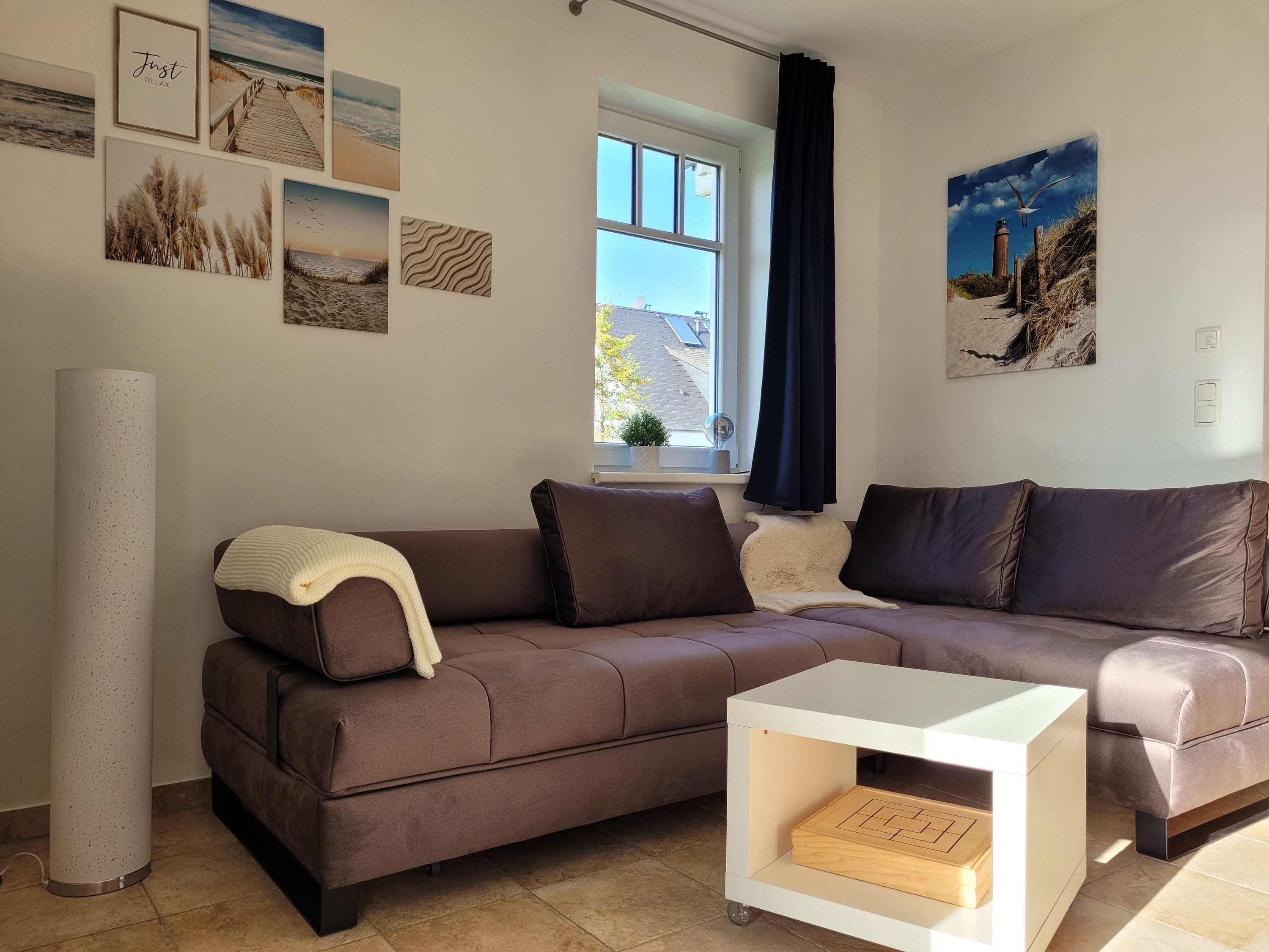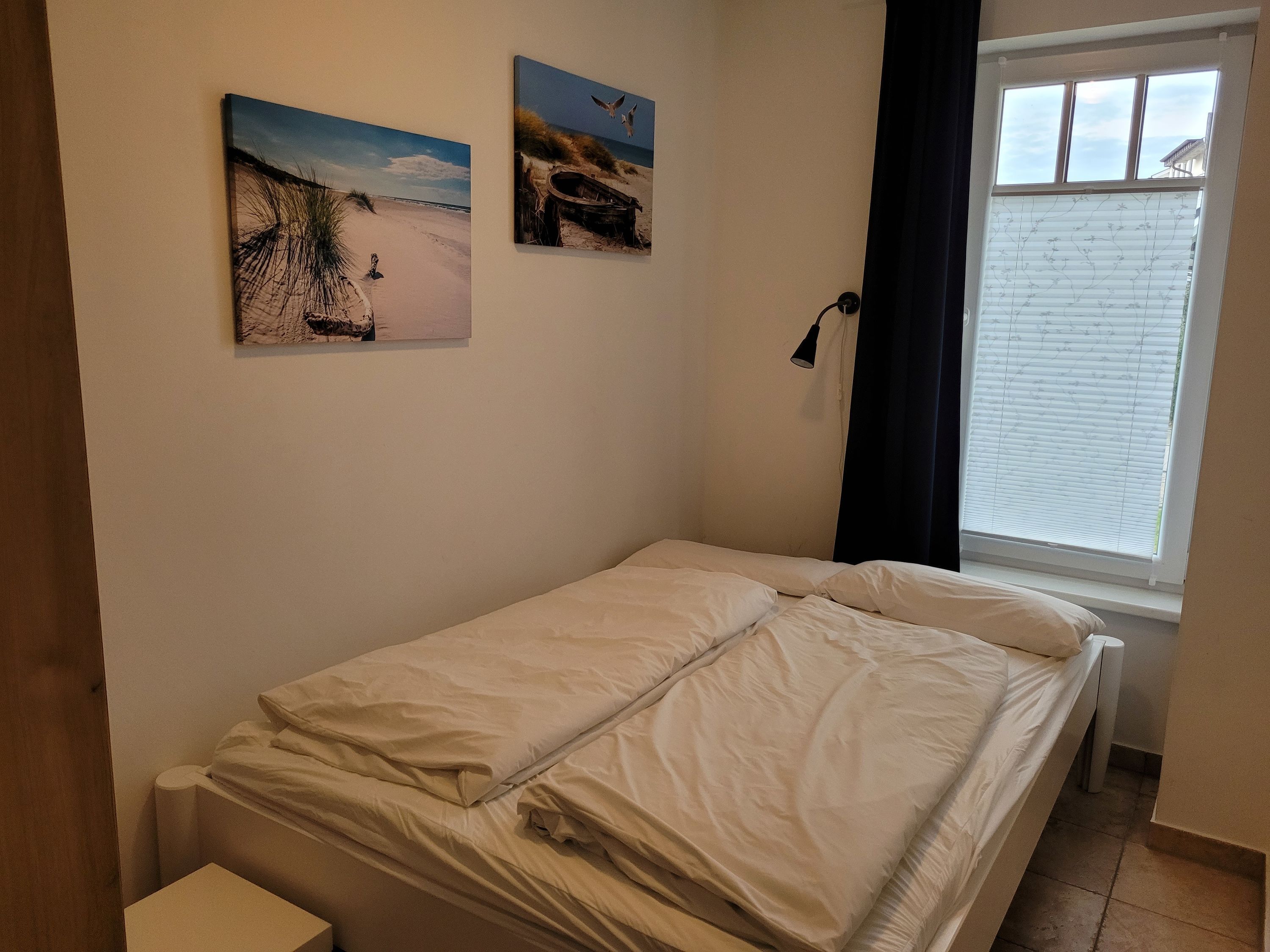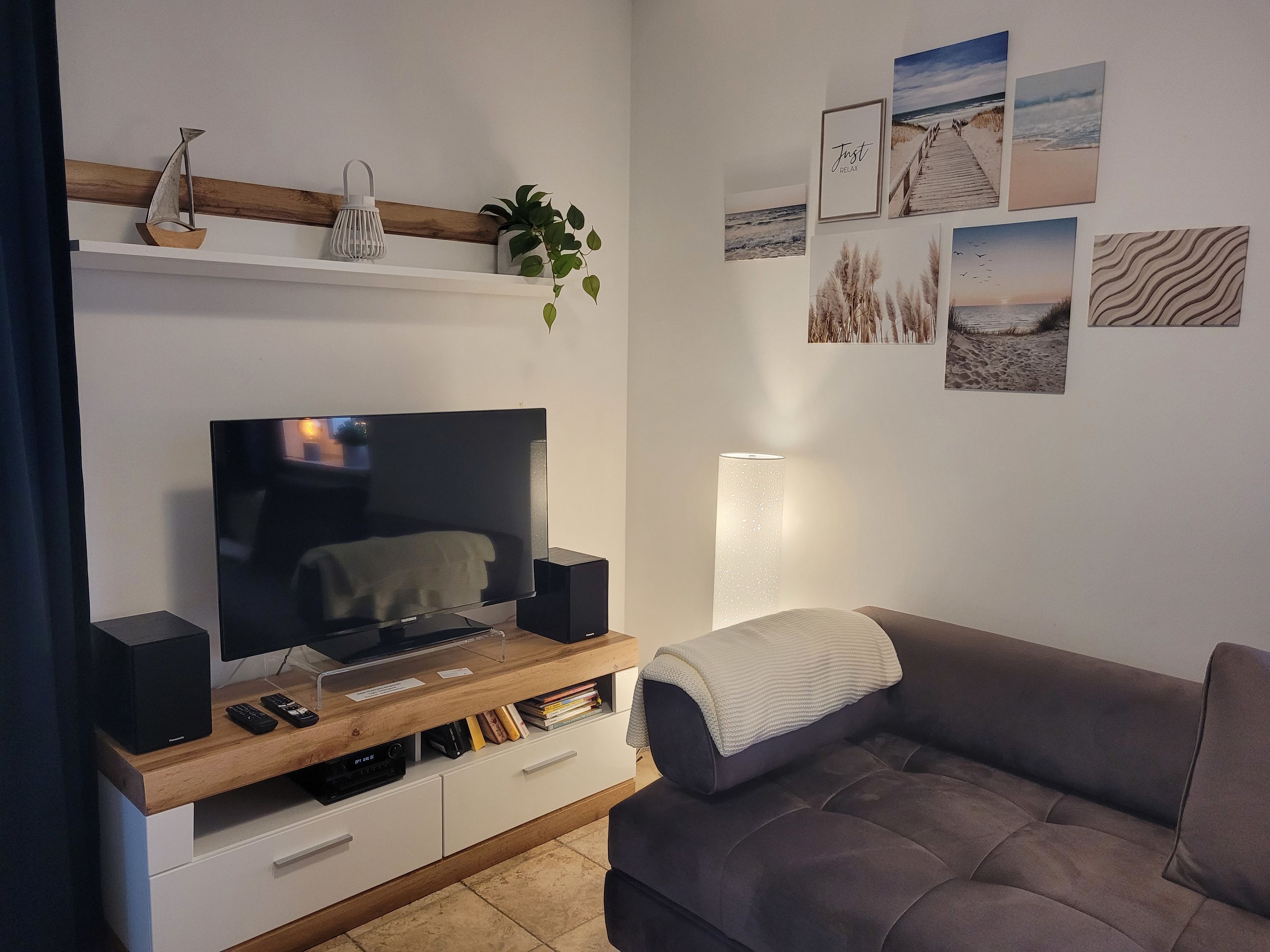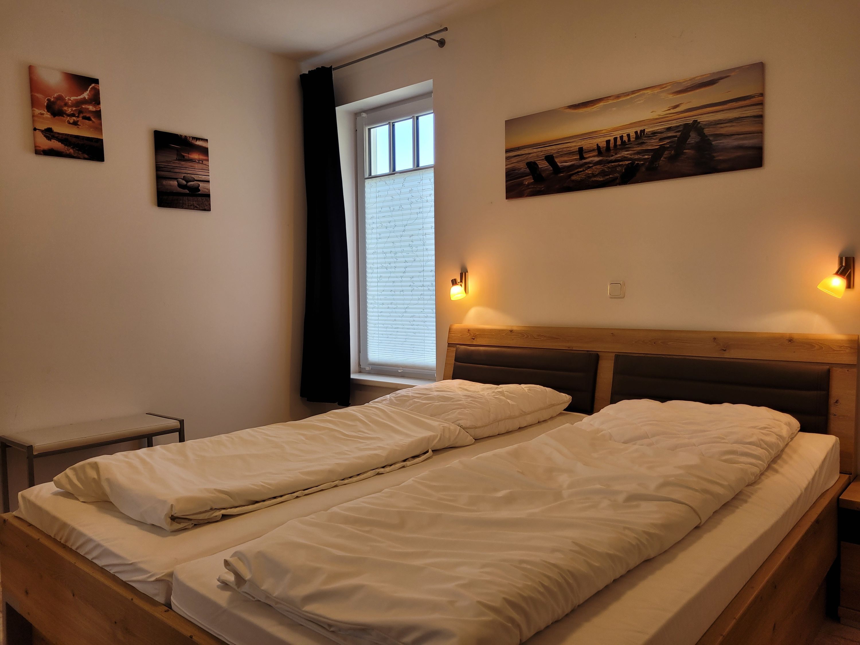 Das Wohnzimmer mit großer (Schlaf-)Couch, Flat-TV und gemütlichem Essbereich lädt zum Kochen und Verweilen ein. Die integrierte Einbauküche ist mit Geschirrspüler, Vier-Platten-Herd (kein Backofen), Dunstabzugshaube, Kühlschrank mit Gefrierfach, Kaffeemaschine, Eierkocher, Wasserkocher, Toaster und Mikrowelle ausgestattet. So lässt es sich gut gesättigt in den Tag/Abend starten. Das größere Schlafzimmer empfängt Sie mit einem Doppelbett (180 x 200 cm / getrennte Matratzen) und einem geräumigen Kleiderschrank für Ihr Gepäck. Das kleinere Schlafzimmer besitzt ein Doppelbett mit den Maßen 140 x 200 cm und weiteren Stauraum. Die Wohnung ist mit Fußbodenheizung ausgerüstet. Zudem befindet sich im Duschbad ein separater Handtuchtrockner. Vom Wohnbereich aus gelangen Sie auf die Terrasse. Mit den vorhandenen Balkonmöbeln lässt es sich hier ebenfalls gut frühstücken.