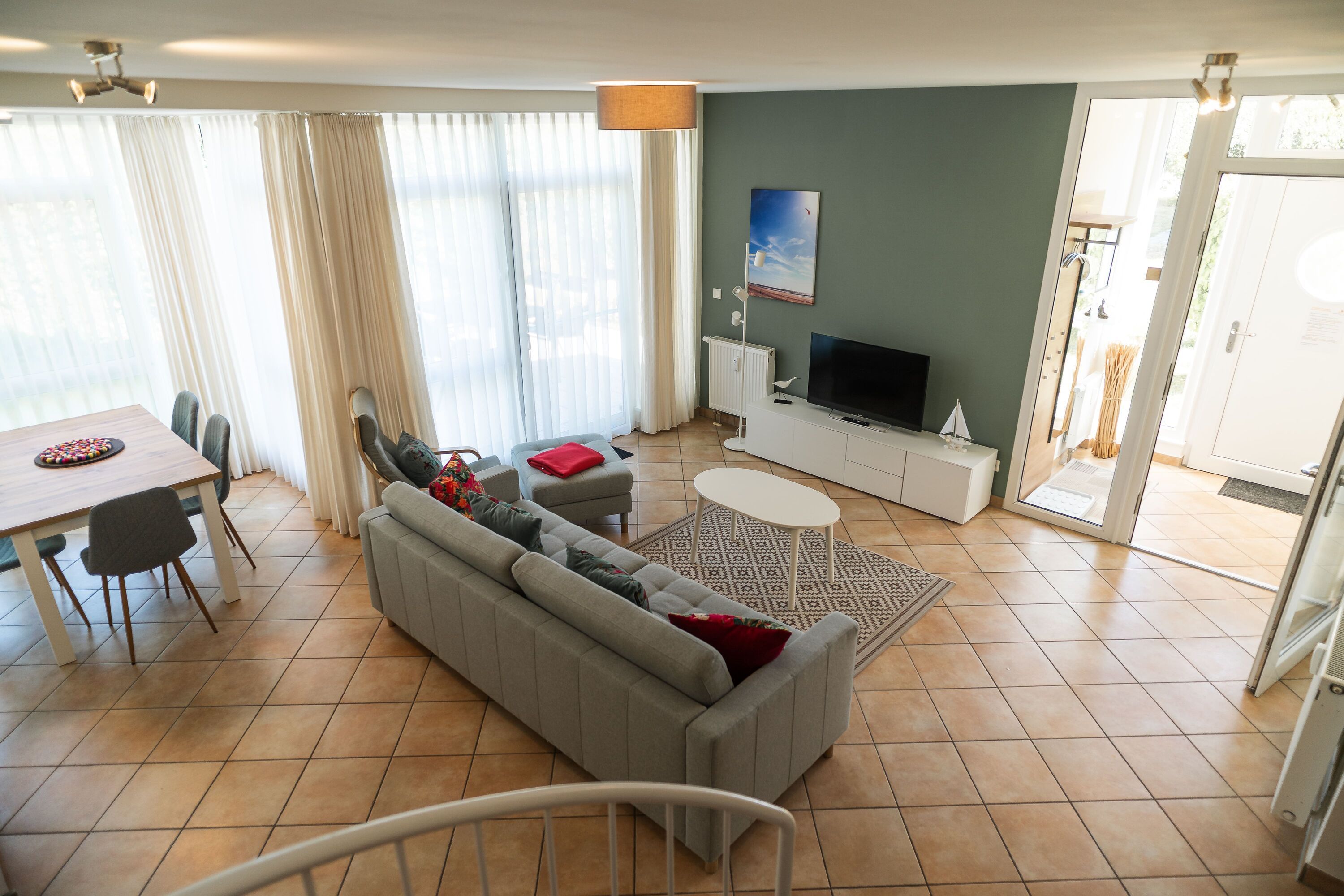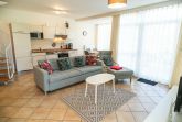 Wohnraum mit Schlafcouch und Couchtisch, Esstisch mit 6 Stühlen, Flachbild - TV, Stereoanlage, Einbauküche mit Geschirrspüler, Kühlschrank mit Gefrierfach, Kaffeemaschine, Wasserkocher, Toaster, 4-Platten-Herd (Ceran) mit Backofen, Mikrowelle, Gäste-WC
