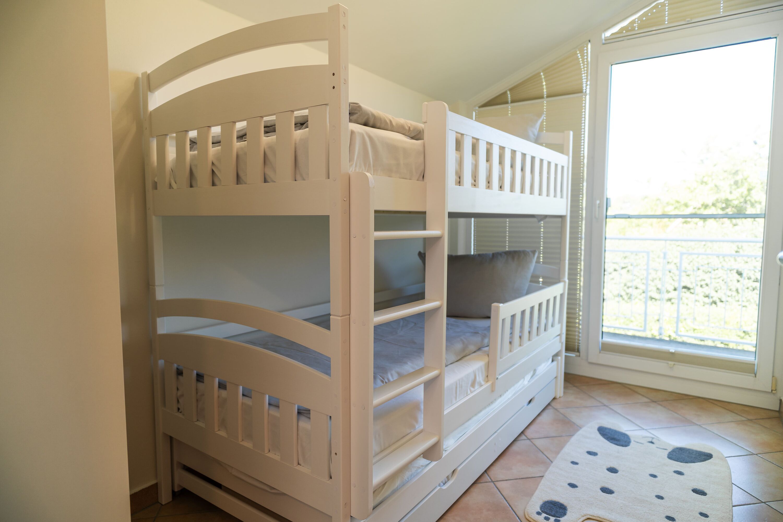 Schlafzimmer mit Doppelbett und Kleiderschrank, Kinderzimmer mit Etagenbett mit drei Betten und Kleiderschrank, Badezimmer mit Badewanne und bodentiefer Dusche, Fußböden gefliest