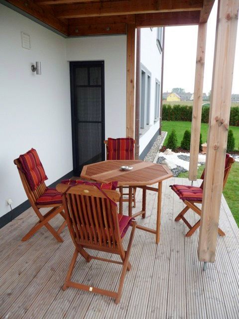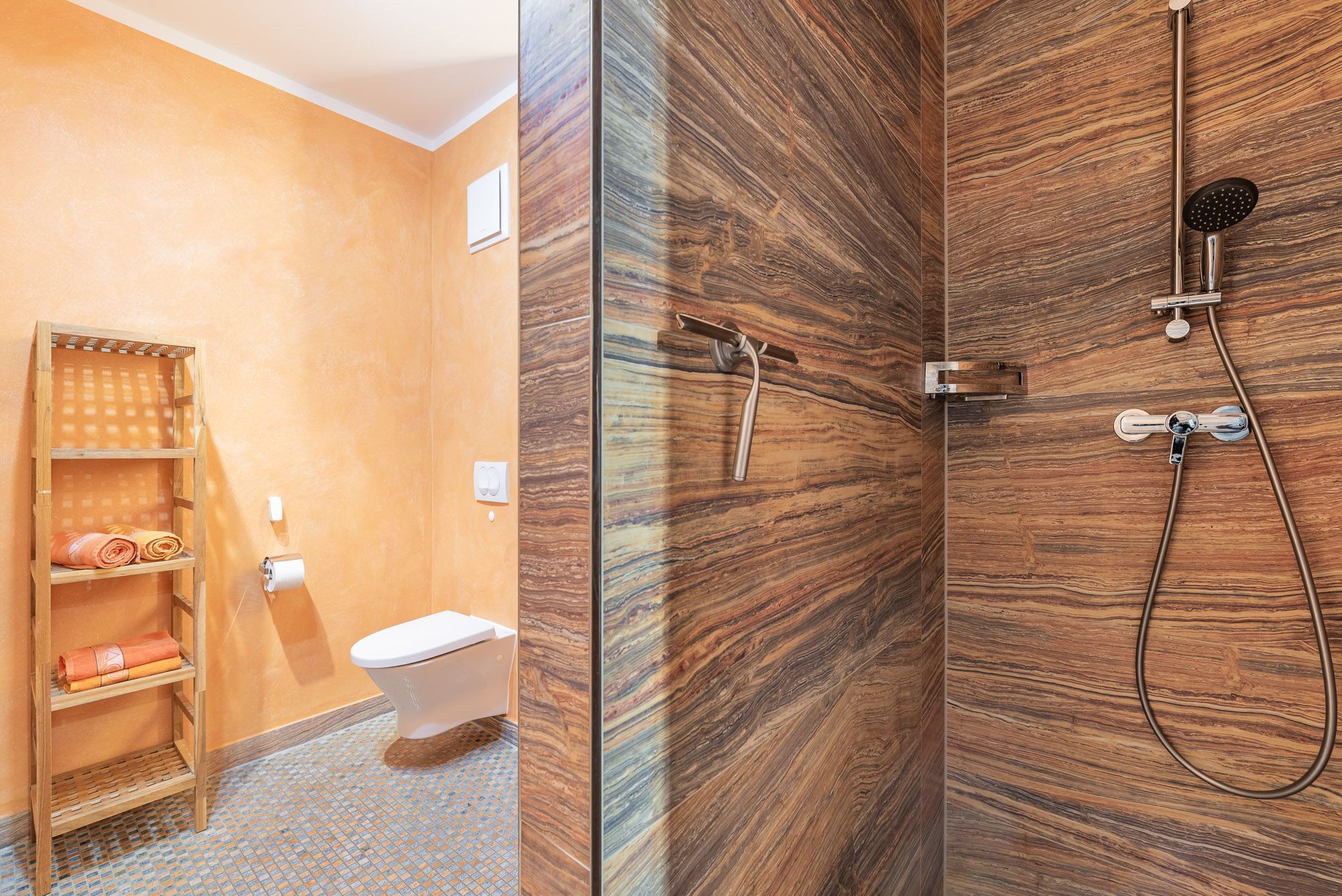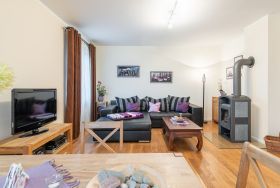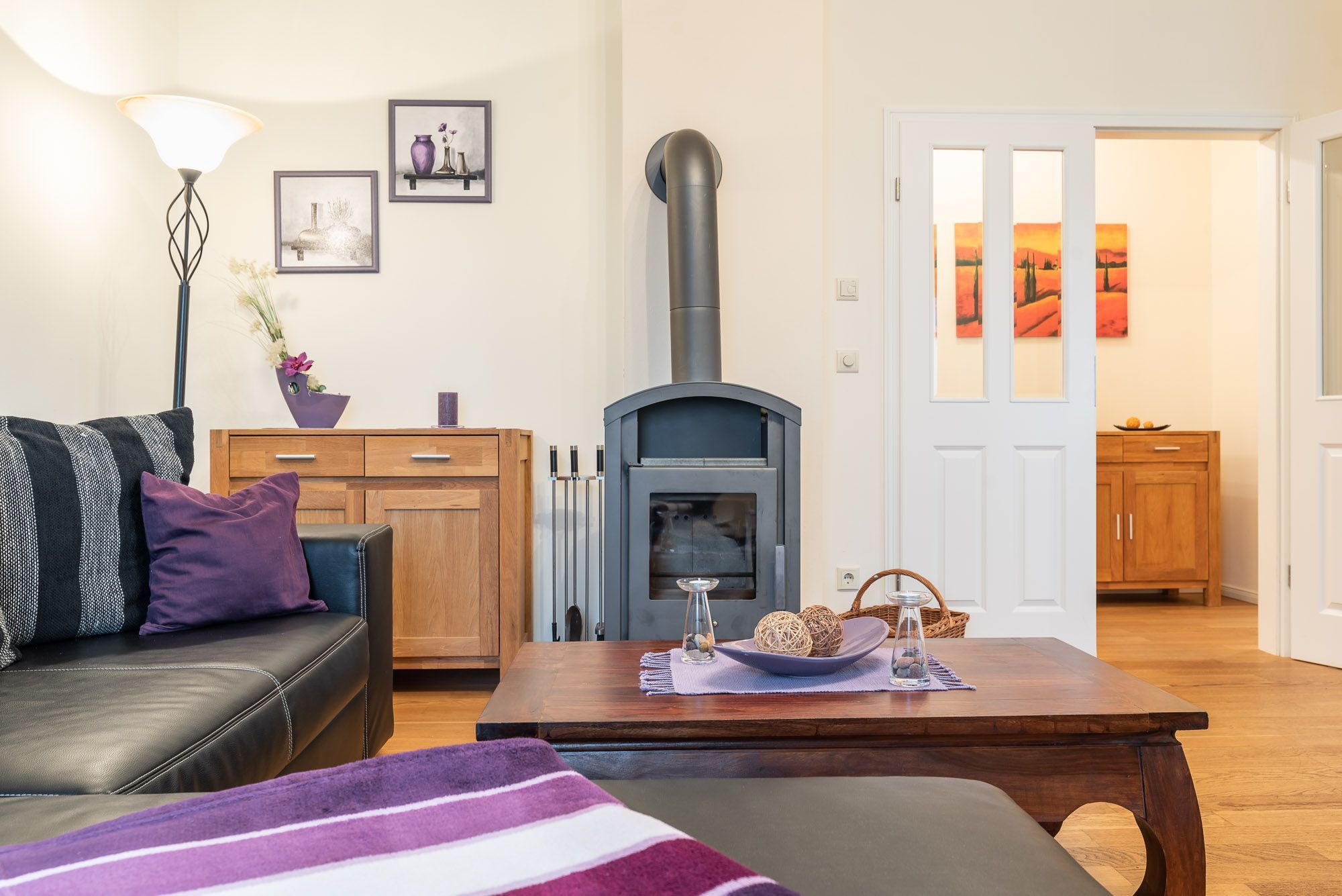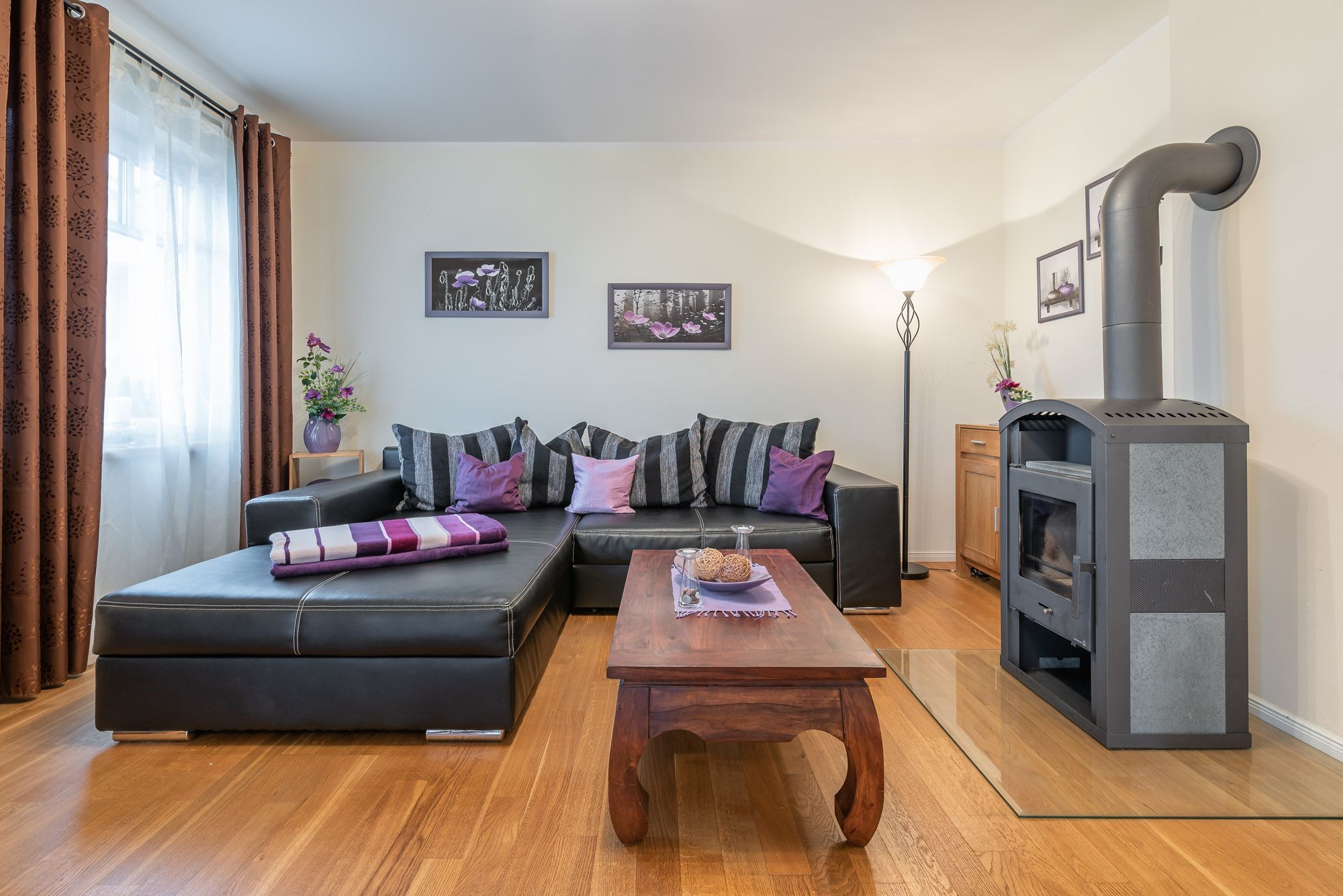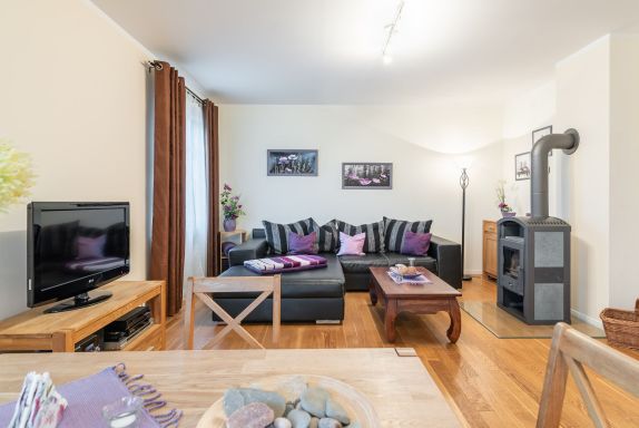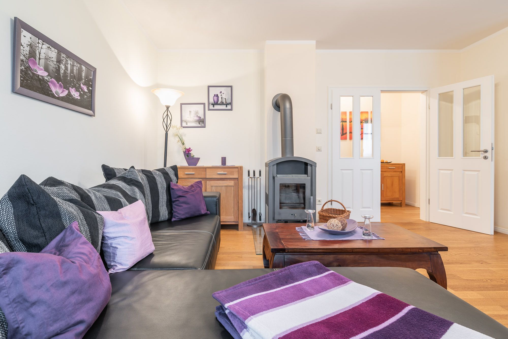 Der weite Wohn-/Essbereich empängt Sie mit einer geräumigen Ledercouch, einem Esstisch mit vier Stühlen, einem Flatscreen-TV inklusive Radio und einem gemütlichen Kaminofen (Kaminholz muss selbst organisiert werden.) Die Küche ist voll ausgestattet mit Geschirrspüler, Kühlschrank mit Gefrierfach, Kaffeemaschine, Wasserkocher, Toaster und Mikrowelle. Das Schlafzimmer besticht mit einem großen Doppelbett (durchgehenden Matratze ) und einem geräumigen Kleiderschrank in warmen Erdtönen. Highlight des Badezimmers ist die geräumige ebenerdige Dusche mit angrenzendem deckenhohen Spiegel. Von Schlafzimmer und Wohnzimmer aus haben Sie möglichkeit die Außenterrasse zu betreten. Bei schönem Wetter laden die Balkonmöbel mit Blick ins Grüne zum Verweilen und Entspannen ein.