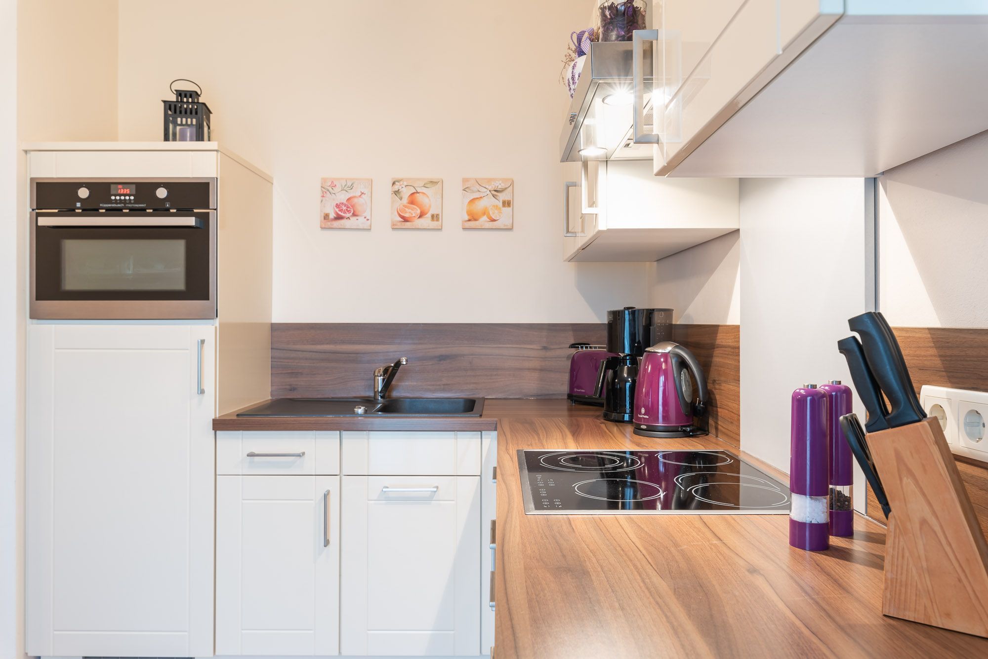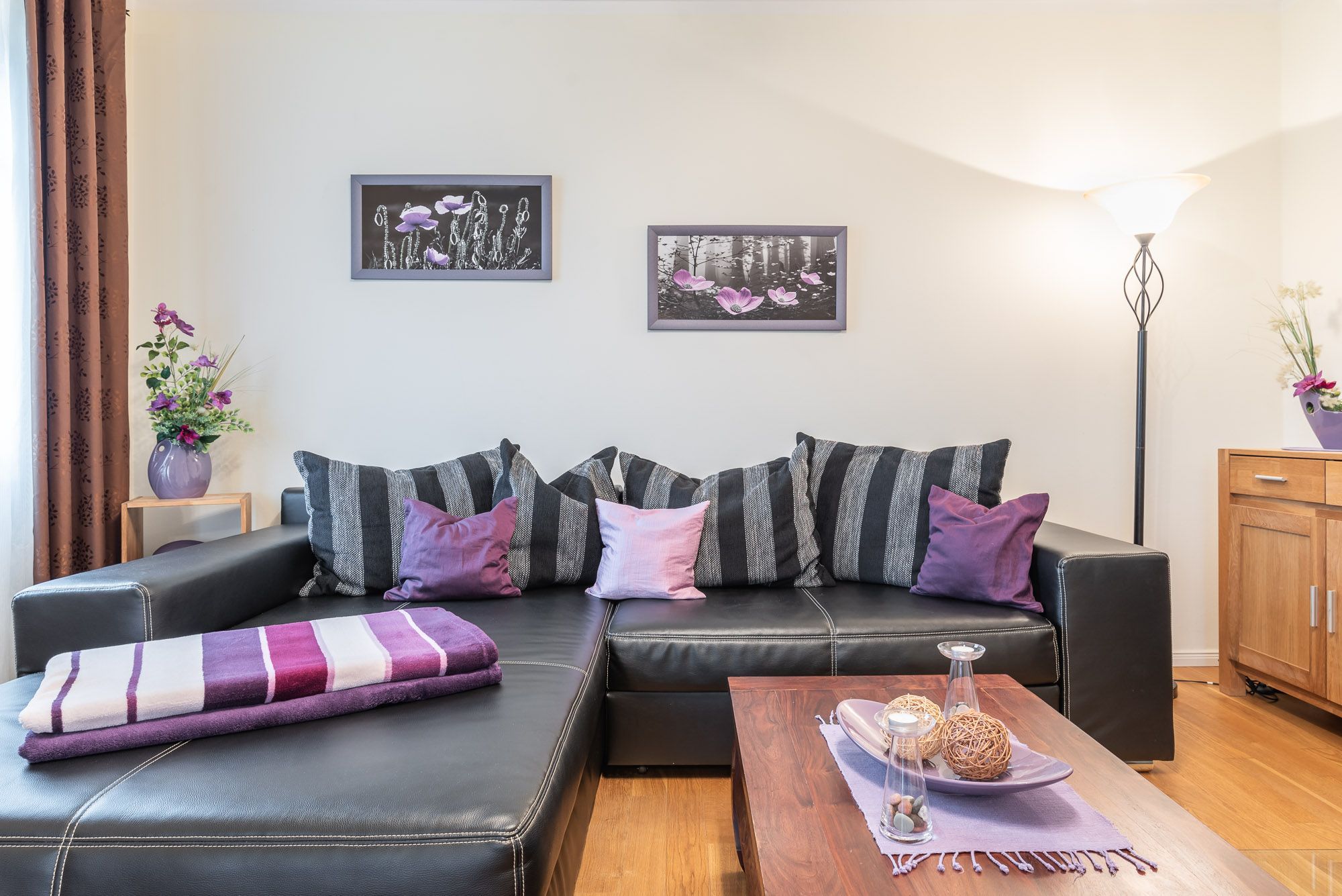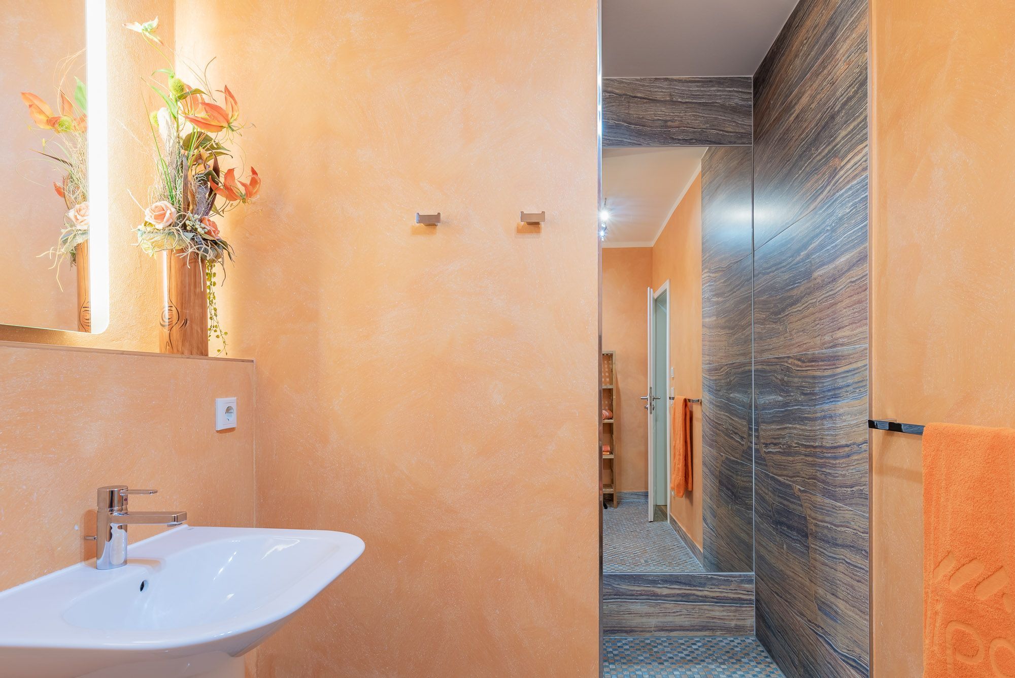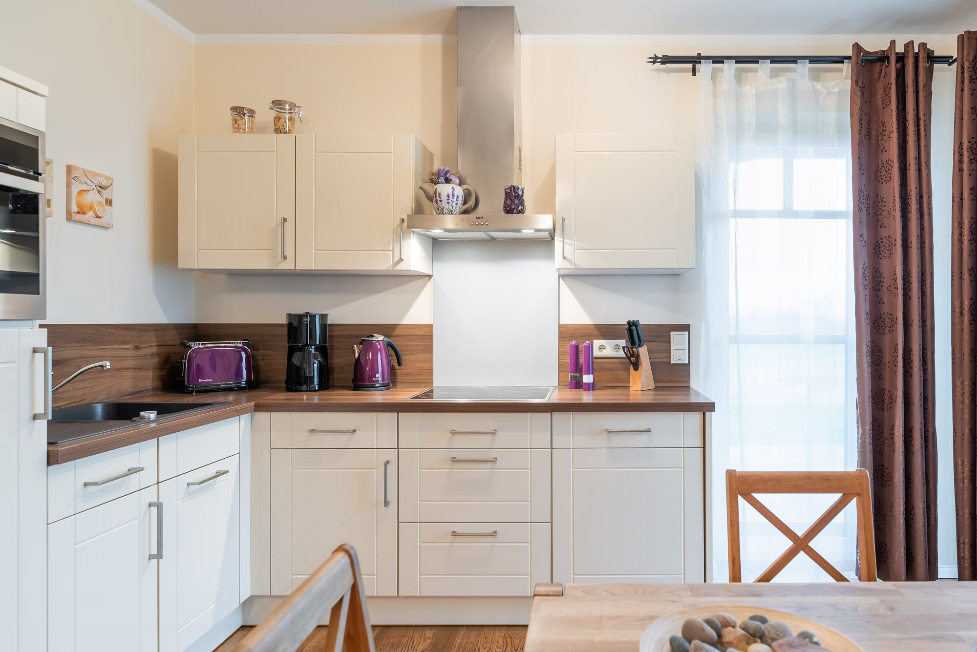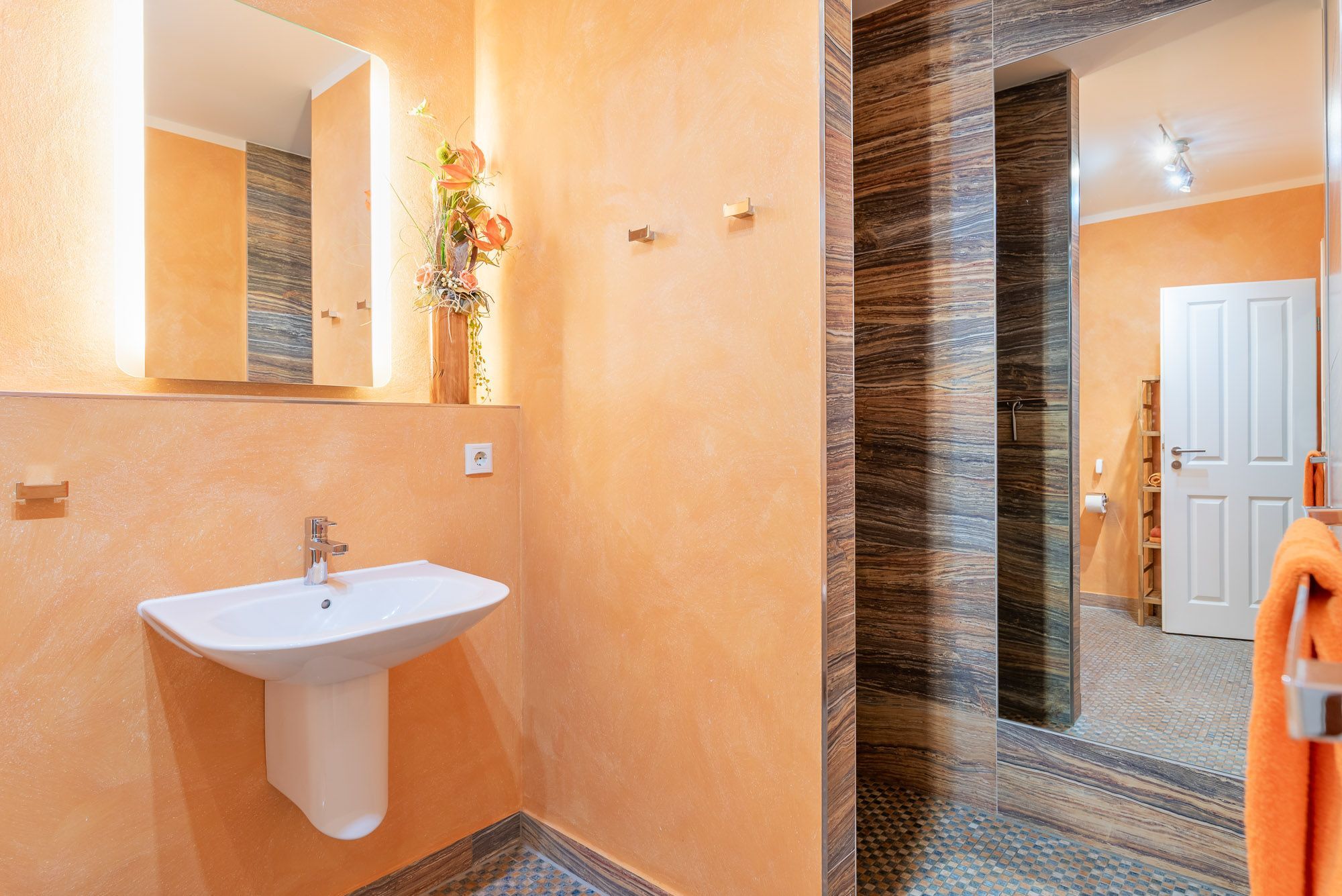 Der weite Wohn-/Essbereich empängt Sie mit einer geräumigen Ledercouch, einem Esstisch mit vier Stühlen, einem Flatscreen-TV inklusive Radio und einem gemütlichen Kaminofen (Kaminholz muss selbst organisiert werden.) Die Küche ist voll ausgestattet mit Geschirrspüler, Kühlschrank mit Gefrierfach, Kaffeemaschine, Wasserkocher, Toaster und Mikrowelle. Das Schlafzimmer besticht mit einem großen Doppelbett (durchgehenden Matratze ) und einem geräumigen Kleiderschrank in warmen Erdtönen. Highlight des Badezimmers ist die geräumige ebenerdige Dusche mit angrenzendem deckenhohen Spiegel. Von Schlafzimmer und Wohnzimmer aus haben Sie möglichkeit die Außenterrasse zu betreten. Bei schönem Wetter laden die Balkonmöbel mit Blick ins Grüne zum Verweilen und Entspannen ein.