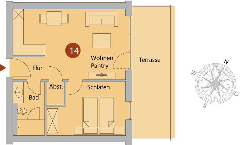 Strandnahe 2-Raumwohnung für max. 3 Erw. und 1 Kleinkind, Balkon mit seitlichem Meerblick im 1. OG.