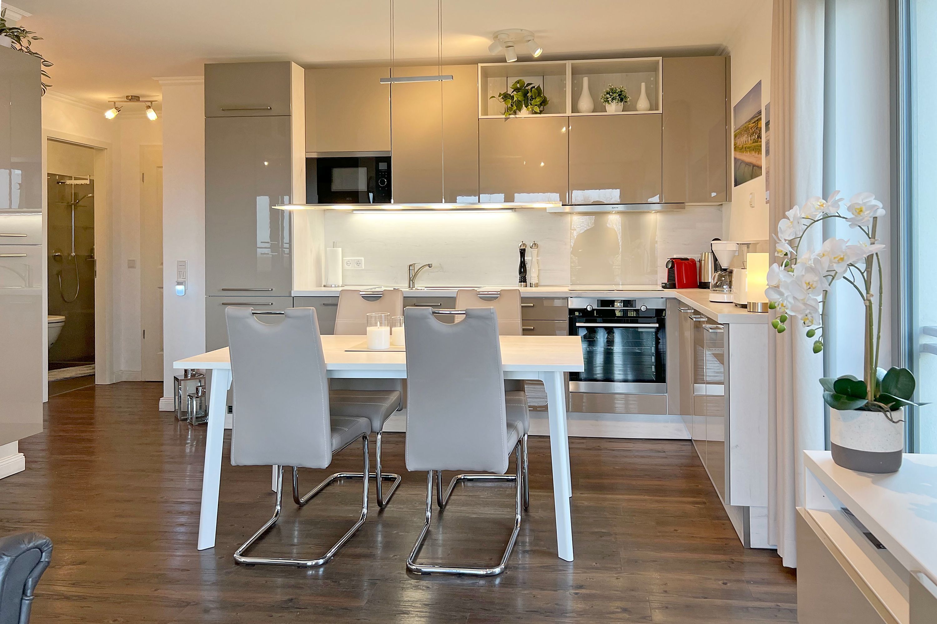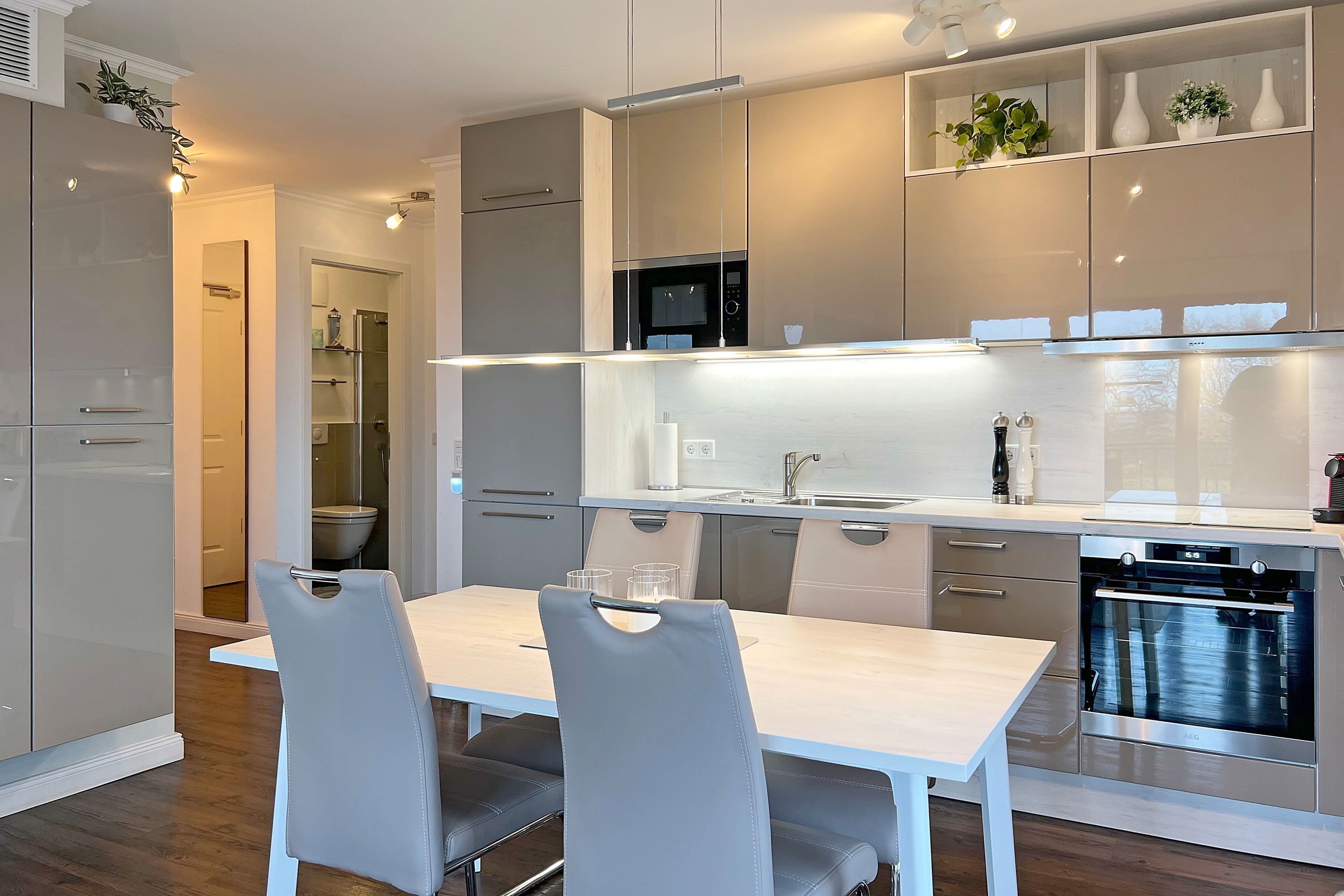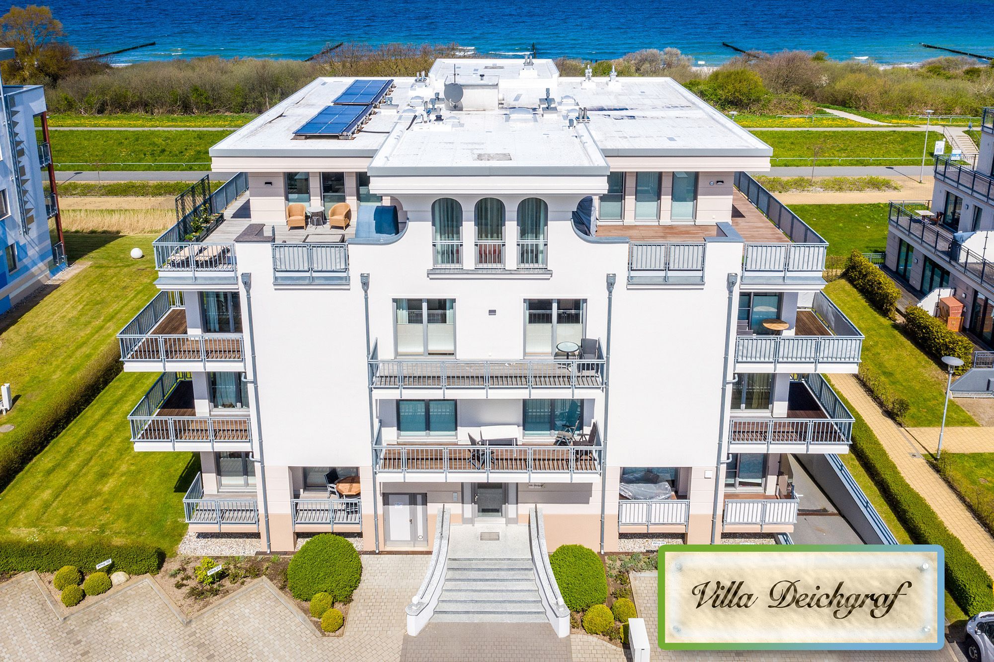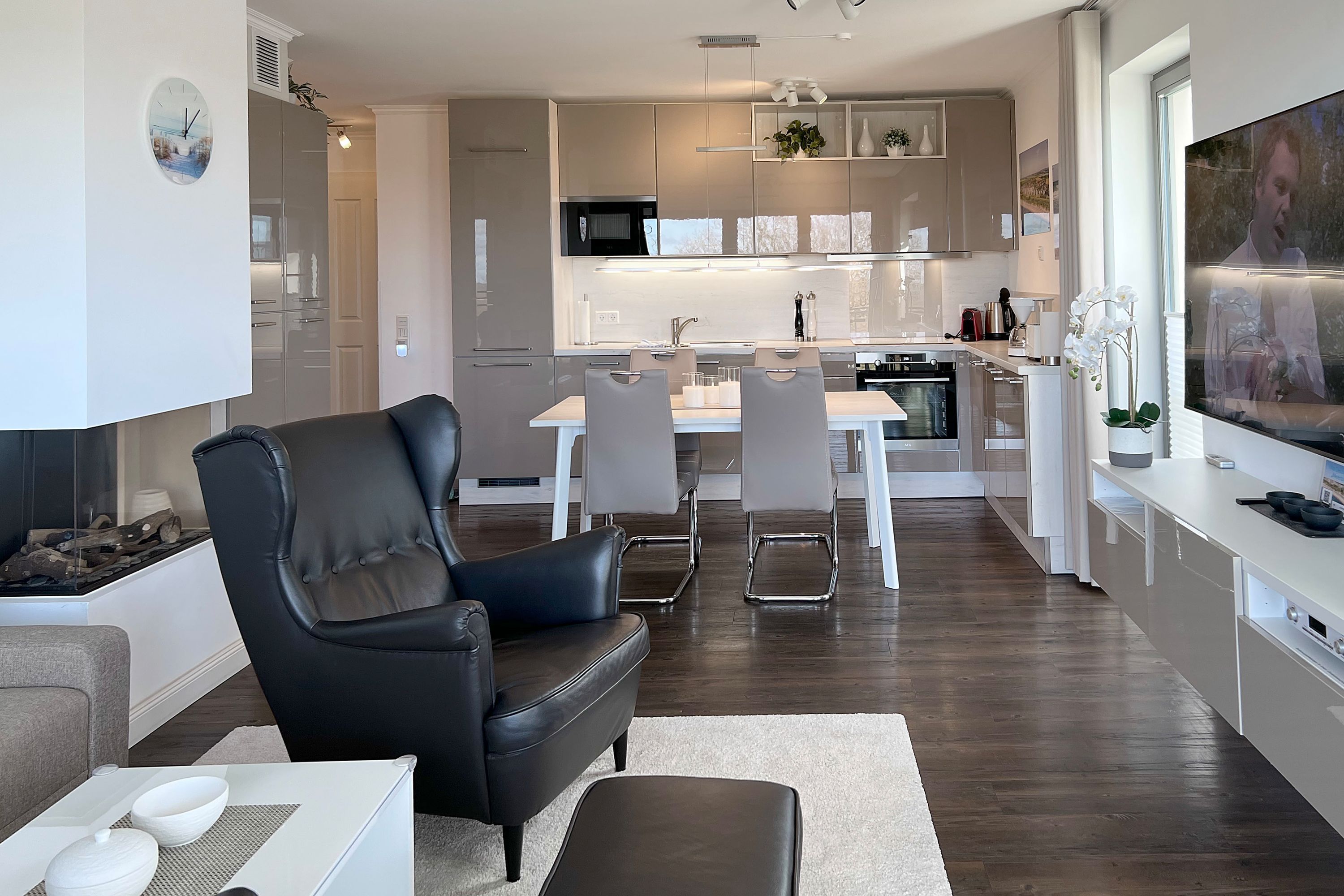Die Ferienwohnung wurde im November 2022 neugestaltet. Im Wohnbereich empfangen Sie eine bequeme Sitzecke mit ausziehbarer Schlafcouch (1,40 x 2,00 m), ein TV-Board und als besonderes Highlight ein großer 65-Zoll-Fernseher mit Blu-ray-Player. Ein ganzer Schwung an DVDs und ein Radio-CD-Player mit der Möglichkeit über Bluetooth Musik vom Handy zu spielen. Das sorgt für gute Laune. Ein stilvoller gläserner Gas- Kamin und dessen Flammenspiel wirken entschleunigend und zaubern stimmungsvolle Stunden. Die großzügige Fensterfront über Eck flutet den Raum mit Licht. Zudem erhascht man bereits von der Sitzecke aus, einen Blick auf die Ostsee. In der offenen Einbauküche mit Backofen und 4-Platten-Ceranfeld, Geschirrspüler, Kühlschrank mit Gefrierfach, Mikrowelle, Kaffeemaschine, Nespressomaschine, Wasserkocher und Toaster lassen sich leckere Mahlzeiten zubereiten und am angrenzenden Esstisch mit vier ledernen Hochlehnern verzehren. Über den Wohnbereich gelangen Sie auf den großen Eckbalkon in Nord-West-Ausrichtung mit traumhaftem Meerblick. Hier können Sie die Nachmittags- und Abendsonne und unvergessliche Sonnenuntergänge genießen. Der Balkon mit Tisch, Stühlen und einem stilechten Strandkorb ist auch bei schlechterem Wetter durch den darüberliegenden Vorbau gut geschützt. Ein modernes Boxspringbett mit durchgehender Matratze von 1,80 x 2,00 m. erwartet Sie im Schlafzimmer. Ein zusätzlicher Topper, ein Kleiderschrank mit Ganzkörperspiegel und eine Wandkommode sowie ein moderner 65 Zoll TV darüber vervollständigen den Raum. Bitte beachten Sie, dass im Schlafzimmer kein Platz für ein zusätzliches Kinderreisebett vorhanden ist. An allen Fenstern sind blickdichte Vorhängen und Plissees vorhanden. Das Badezimmer besticht mit bodentiefer Dusche, großem Spiegel, LED-Kosmetikwandspiegel, elektrischem Handtuchtrockner, Personenwaage, Föhn und mehreren Ablagemöglichkeiten. Ein kleiner Garderobenbereich am Eingang der Wohnung bietet dem Anlass entsprechend Platz für Jackett und Windjacke. Zusätzliche Dinge wie Ihre Koffer können Sie bequem im separaten Abstellraum unterbringen. In allen Räumen wurde eine Fußbodenheizung für angenehme und gleichmäßige Wärme eingebaut. Die Unterkunft liegt nur wenige Meter zum Strand entfernt und wird lediglich durch die gepflegte Promenade von den Dünen getrennt. Kein Autoverkehr! Zur Wohnung gehören zudem ein kostenfreier Tiefgaragenstellplatz und eine Abstellmöglichkeit für Fahrräder. Bitte beachten Sie die Durchfahrtshöhe von max. 1,90 m der Tiefgarage. Mit einem Personenaufzug gelangen Sie von der Tiefgarage aus direkt zu Ihrer Wohnung. Im Erdgeschoss der Wohnung befindet sich ein gekennzeichneter Abstellbereich für Kinderwagen. Noch einige Hinweise: Es handelt sich um eine Nichtraucherwohnung. Haustiere sind nicht gestattet. Das WLAN steht kostenlos in allen Zimmern zur Verfügung. Das Datenvolumen ist unbegrenzt, so dass Sie ohne Limit nach Herzenslust streamen können. Das Netz schwankt aber leider noch, wenn sich viele Nutzer in Börgerende im Internet befinden. Für Netflix z.B. reicht es aber zumeist völlig aus. Wäschesets, Kinderreisebett und Kinderhochstuhl können kostenpflichtig zugebucht werden. Waschmaschine und Trockner stehen im separaten Hauswirtschaftsraum im Untergeschoss der Villa zu Ihrer Verfügung (gegen Gebühr / 1,00 Euro Münzen). Ab der dritten Person wird ein Aufschlag in Höhe von 15,00 Euro/ÜN berechnet. Sichern Sie sich einen der begehrten Strandkörbe nur ein paar Meter entfernt von den rauschenden Wellen der Ostsee (Anfang Mai - Ende August) und buchen Sie jetzt zu besonderen Konditionen (12,00 Euro pro Tag oder 75,00 Euro pro Woche.)