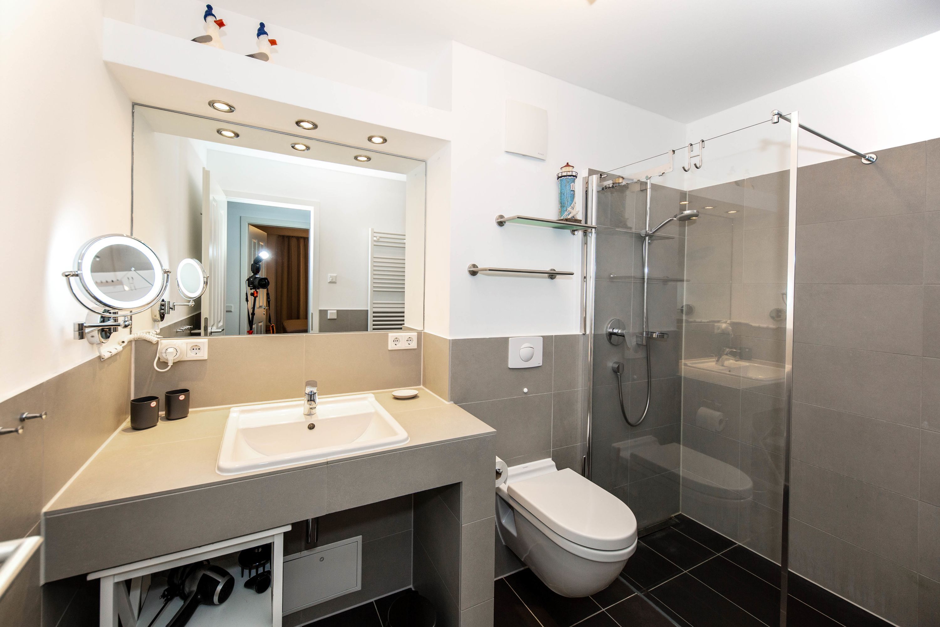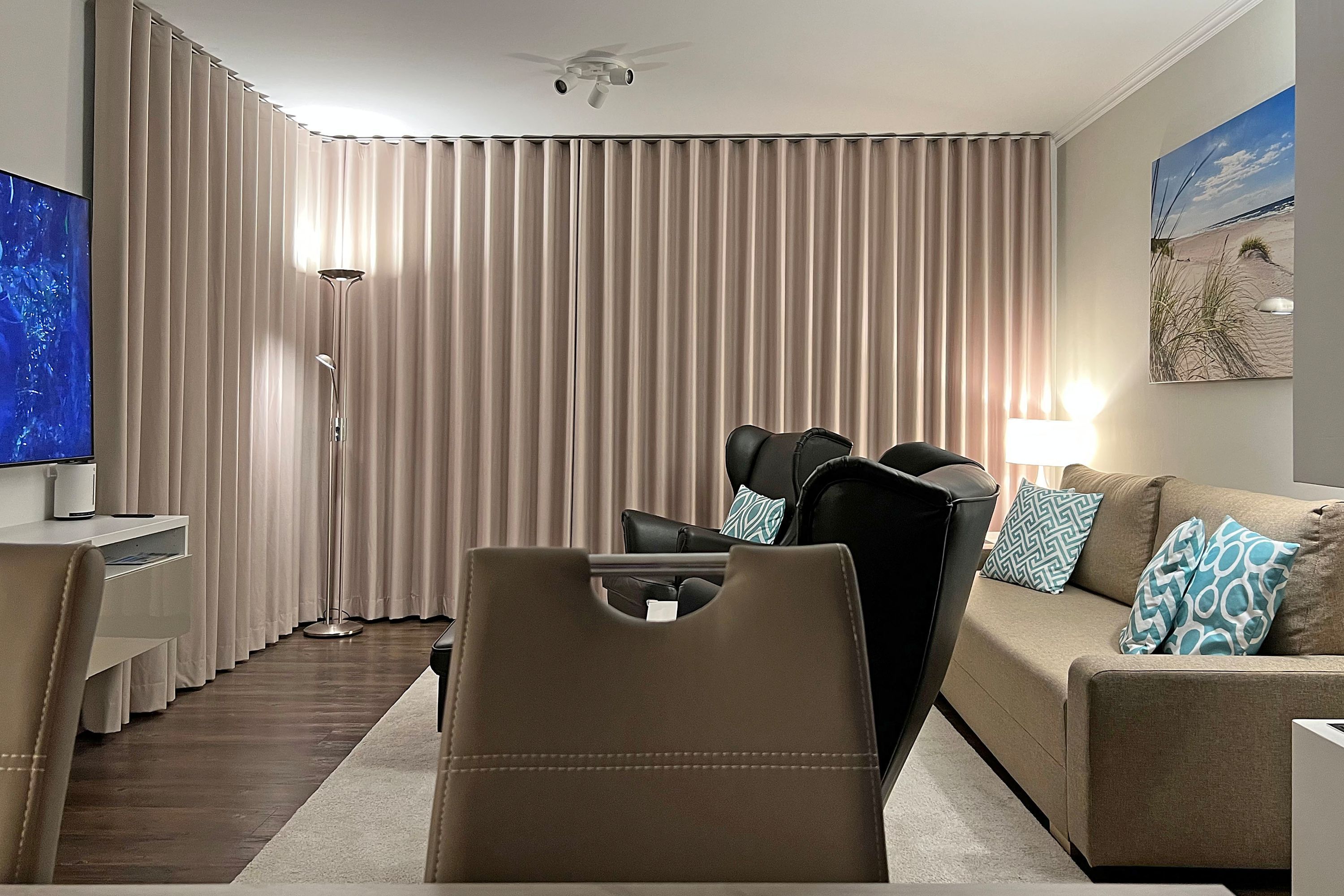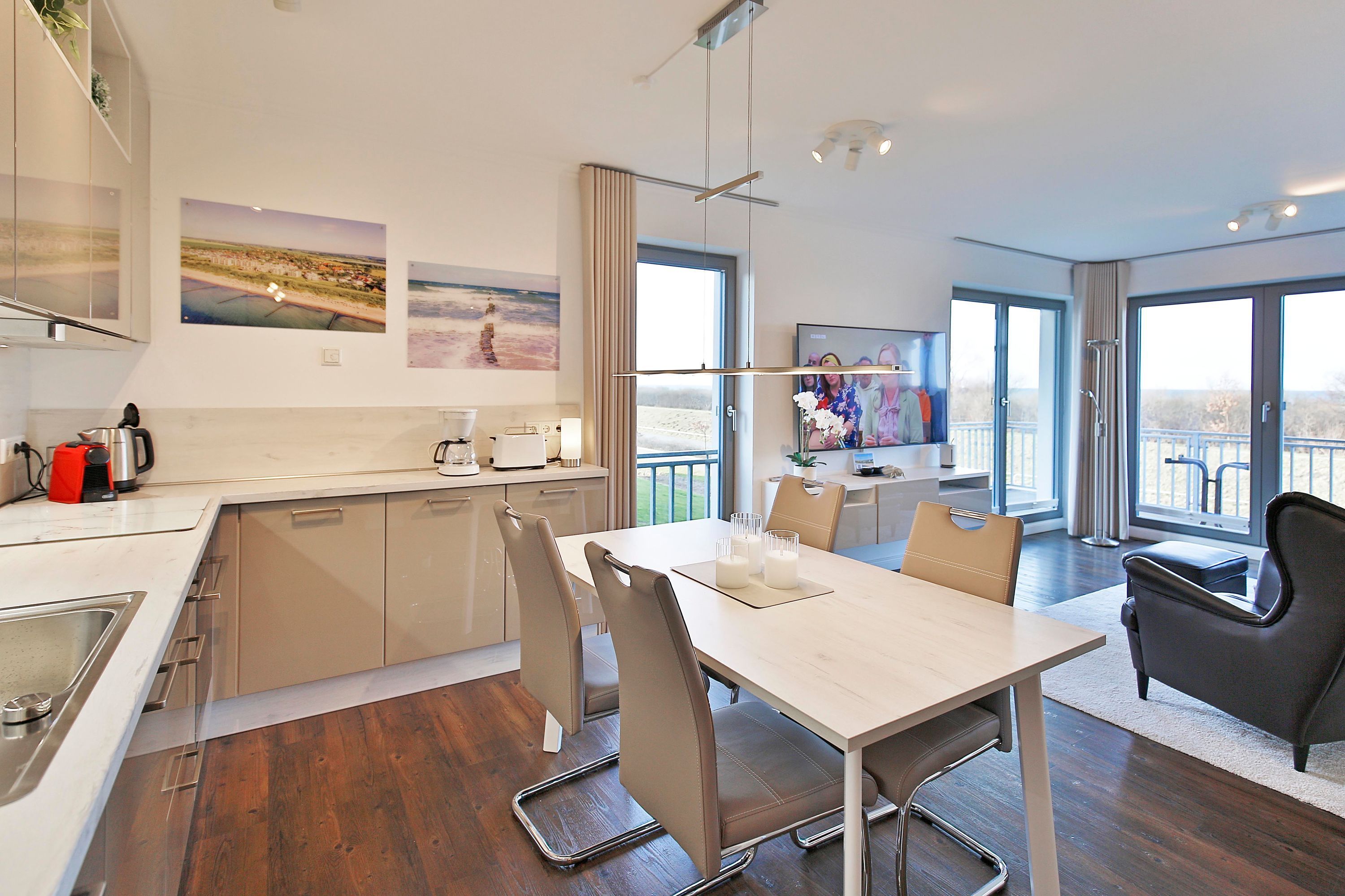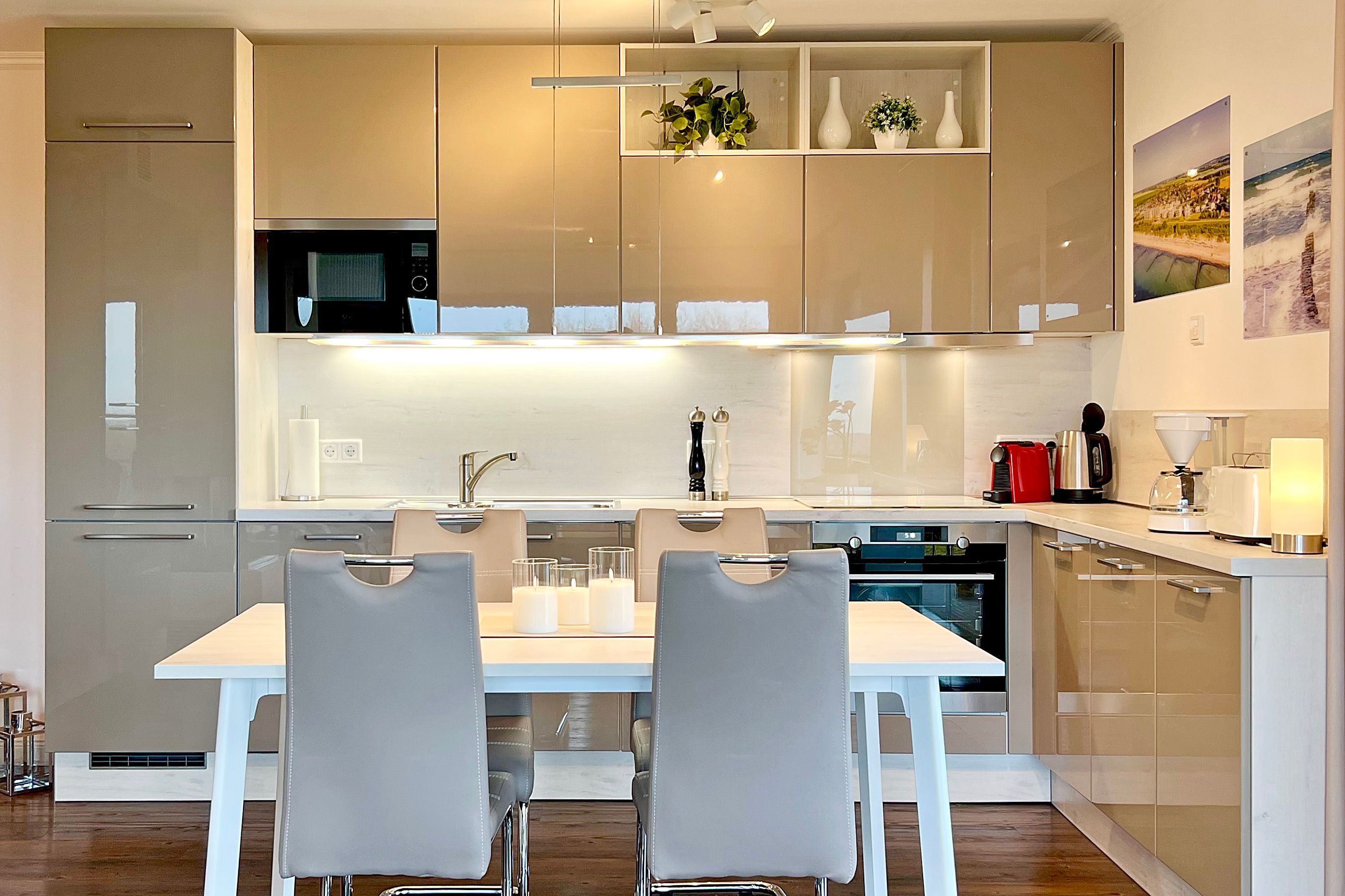 Die Ferienwohnung wurde im November 2022 neugestaltet. Im Wohnbereich empfangen Sie eine bequeme Sitzecke mit ausziehbarer Schlafcouch (1,40 x 2,00 m), ein TV-Board und als besonderes Highlight ein großer 65-Zoll-Fernseher mit Blu-ray-Player. Ein ganzer Schwung an DVDs und ein Radio-CD-Player mit der Möglichkeit über Bluetooth Musik vom Handy zu spielen. Das sorgt für gute Laune. Ein stilvoller gläserner Gas- Kamin und dessen Flammenspiel wirken entschleunigend und zaubern stimmungsvolle Stunden. Die großzügige Fensterfront über Eck flutet den Raum mit Licht. Zudem erhascht man bereits von der Sitzecke aus, einen Blick auf die Ostsee. In der offenen Einbauküche mit Backofen und 4-Platten-Ceranfeld, Geschirrspüler, Kühlschrank mit Gefrierfach, Mikrowelle, Kaffeemaschine, Nespressomaschine, Wasserkocher und Toaster lassen sich leckere Mahlzeiten zubereiten und am angrenzenden Esstisch mit vier ledernen Hochlehnern verzehren. Über den Wohnbereich gelangen Sie auf den großen Eckbalkon in Nord-West-Ausrichtung mit traumhaftem Meerblick. Hier können Sie die Nachmittags- und Abendsonne und unvergessliche Sonnenuntergänge genießen. Der Balkon mit Tisch, Stühlen und einem stilechten Strandkorb ist auch bei schlechterem Wetter durch den darüberliegenden Vorbau gut geschützt. Ein modernes Boxspringbett mit durchgehender Matratze von 1,80 x 2,00 m. erwartet Sie im Schlafzimmer. Ein zusätzlicher Topper, ein Kleiderschrank mit Ganzkörperspiegel und eine Wandkommode sowie ein moderner 65 Zoll TV darüber vervollständigen den Raum. Bitte beachten Sie, dass im Schlafzimmer kein Platz für ein zusätzliches Kinderreisebett vorhanden ist. An allen Fenstern sind blickdichte Vorhängen und Plissees vorhanden. Das Badezimmer besticht mit bodentiefer Dusche, großem Spiegel, LED-Kosmetikwandspiegel, elektrischem Handtuchtrockner, Personenwaage, Föhn und mehreren Ablagemöglichkeiten. Ein kleiner Garderobenbereich am Eingang der Wohnung bietet dem Anlass entsprechend Platz für Jackett und Windjacke. Zusätzliche Dinge wie Ihre Koffer können Sie bequem im separaten Abstellraum unterbringen. In allen Räumen wurde eine Fußbodenheizung für angenehme und gleichmäßige Wärme eingebaut. Die Unterkunft liegt nur wenige Meter zum Strand entfernt und wird lediglich durch die gepflegte Promenade von den Dünen getrennt. Kein Autoverkehr! Zur Wohnung gehören zudem ein kostenfreier Tiefgaragenstellplatz und eine Abstellmöglichkeit für Fahrräder. Bitte beachten Sie die Durchfahrtshöhe von max. 1,90 m der Tiefgarage. Mit einem Personenaufzug gelangen Sie von der Tiefgarage aus direkt zu Ihrer Wohnung. Im Erdgeschoss der Wohnung befindet sich ein gekennzeichneter Abstellbereich für Kinderwagen. Noch einige Hinweise: Es handelt sich um eine Nichtraucherwohnung. Haustiere sind nicht gestattet. Das WLAN steht kostenlos in allen Zimmern zur Verfügung. Das Datenvolumen ist unbegrenzt, so dass Sie ohne Limit nach Herzenslust streamen können. Das Netz schwankt aber leider noch, wenn sich viele Nutzer in Börgerende im Internet befinden. Für Netflix z.B. reicht es aber zumeist völlig aus. Wäschesets, Kinderreisebett und Kinderhochstuhl können kostenpflichtig zugebucht werden. Waschmaschine und Trockner stehen im separaten Hauswirtschaftsraum im Untergeschoss der Villa zu Ihrer Verfügung (gegen Gebühr / 1,00 Euro Münzen). Ab der dritten Person wird ein Aufschlag in Höhe von 15,00 Euro/ÜN berechnet. Sichern Sie sich einen der begehrten Strandkörbe nur ein paar Meter entfernt von den rauschenden Wellen der Ostsee (Anfang Mai - Ende August) und buchen Sie jetzt zu besonderen Konditionen (12,00 Euro pro Tag oder 75,00 Euro pro Woche.)