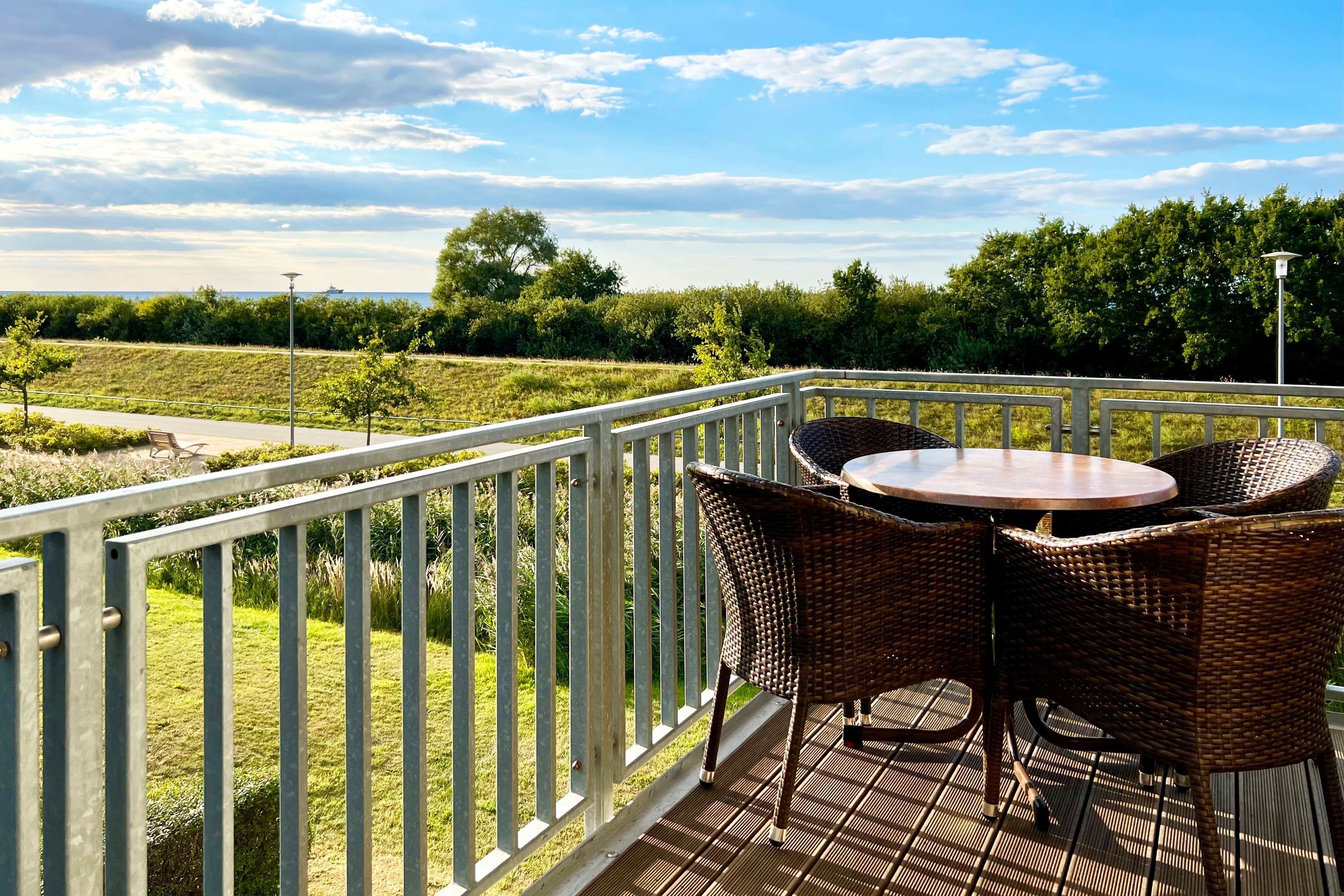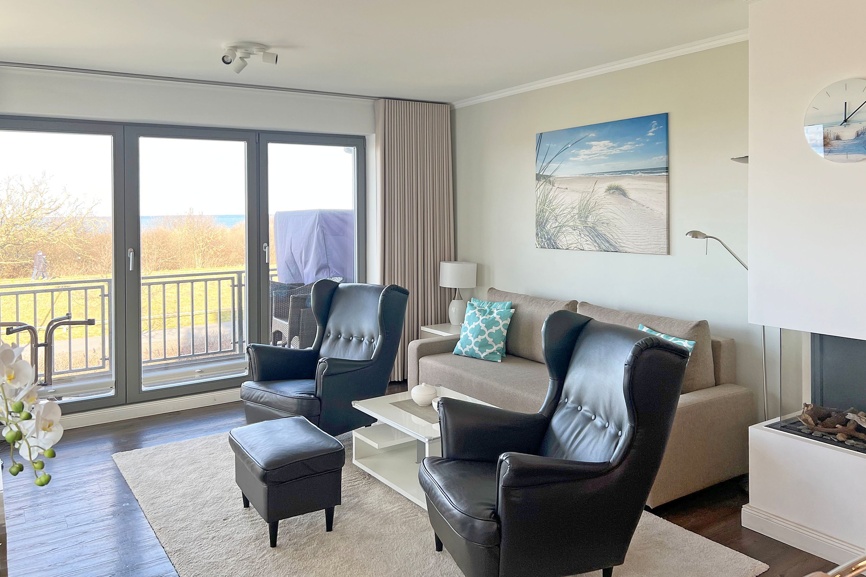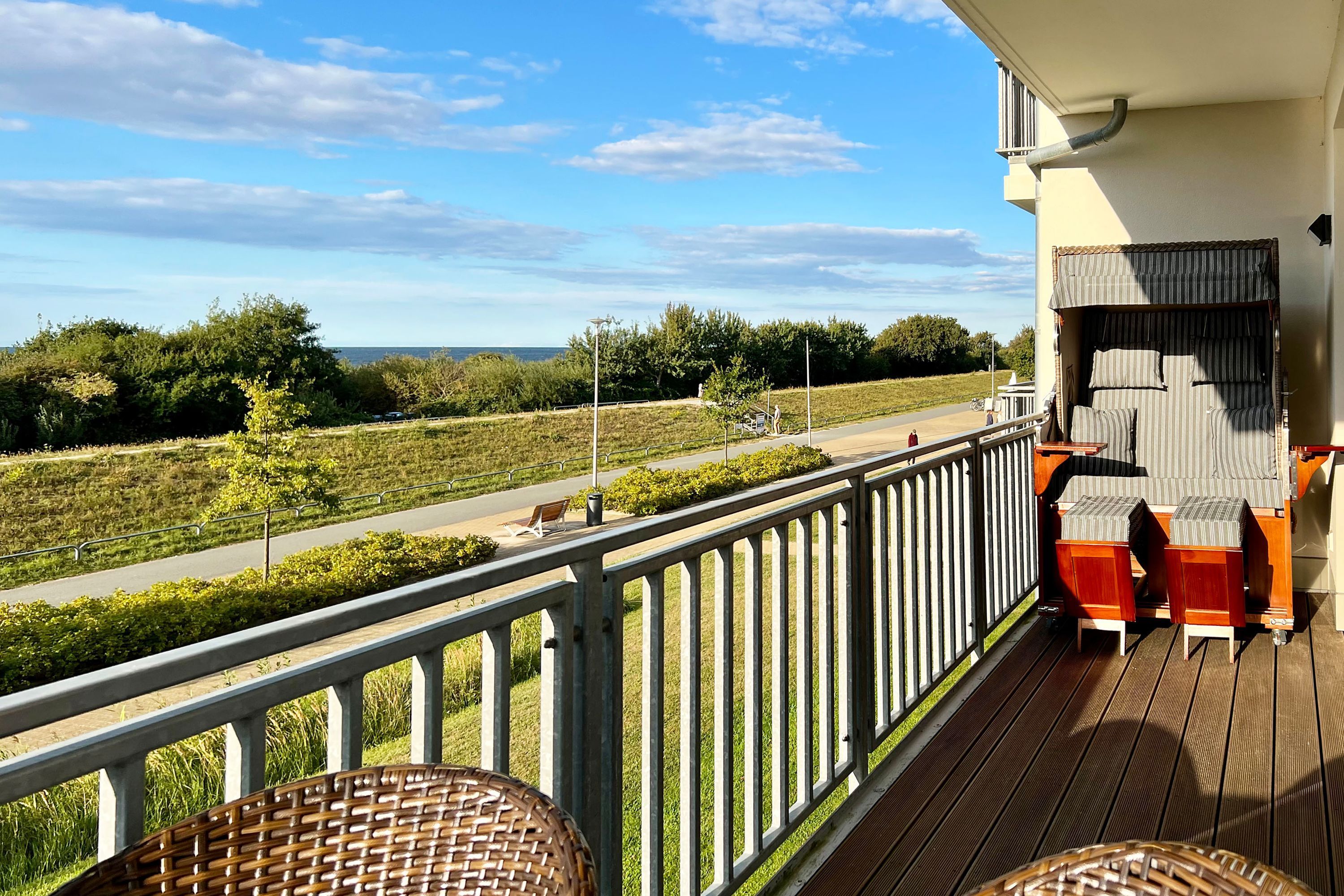 Strandnahe 2-Raumwohnung für max. 3 Erwachsene und 1 Kleinkind, Kamin, Balkon mit Strandkorb und traumhaften Meerblick im 1.OG.