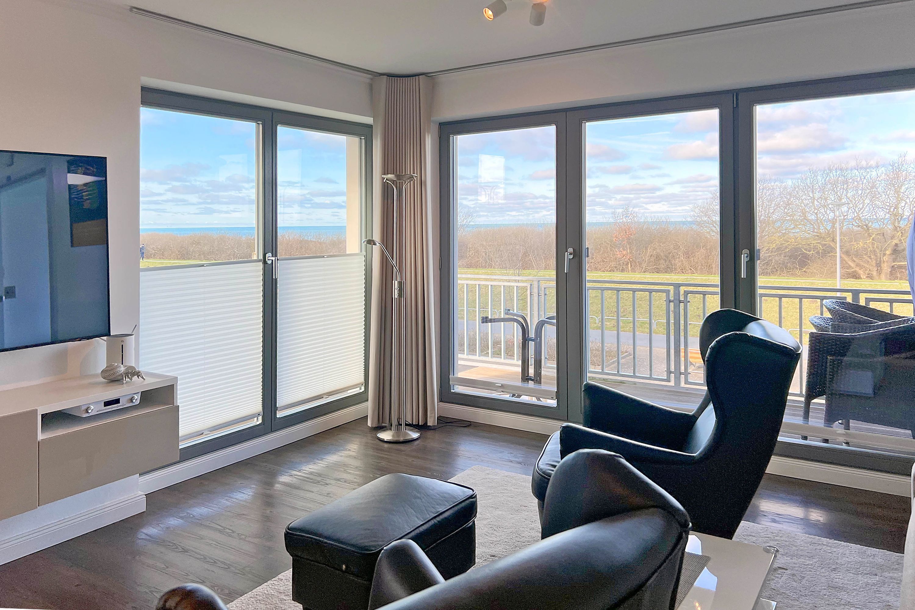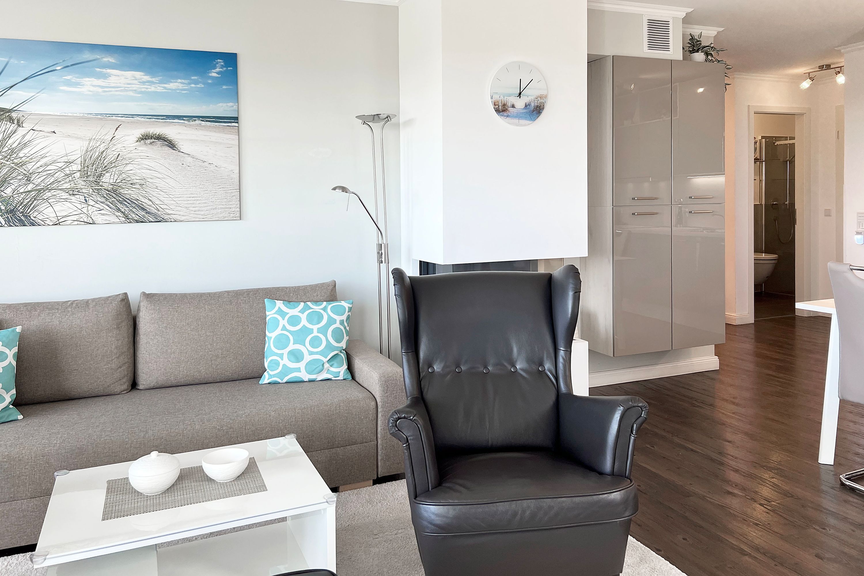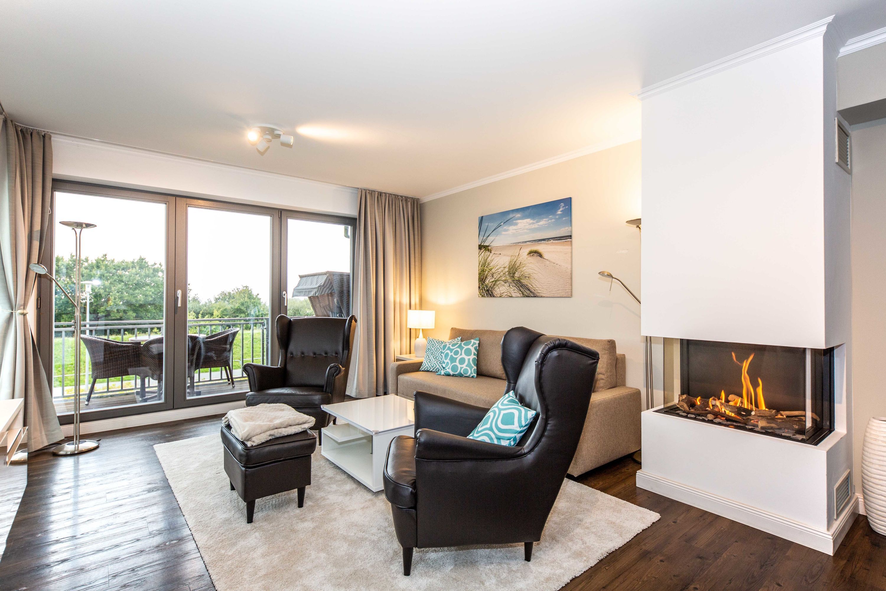 Strandnahe 2-Raumwohnung für max. 3 Erwachsene und 1 Kleinkind, Kamin, Balkon mit Strandkorb und traumhaften Meerblick im 1.OG.