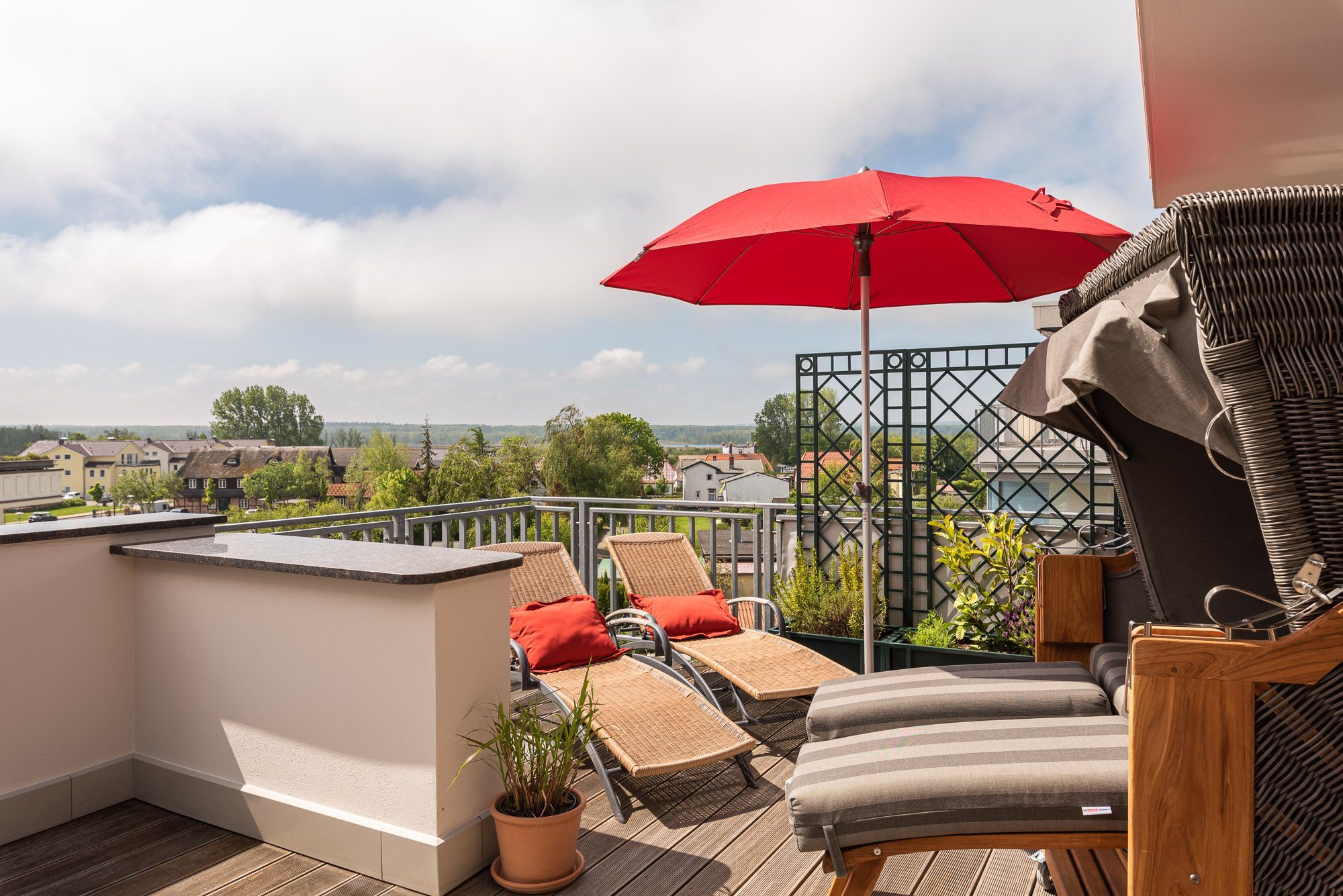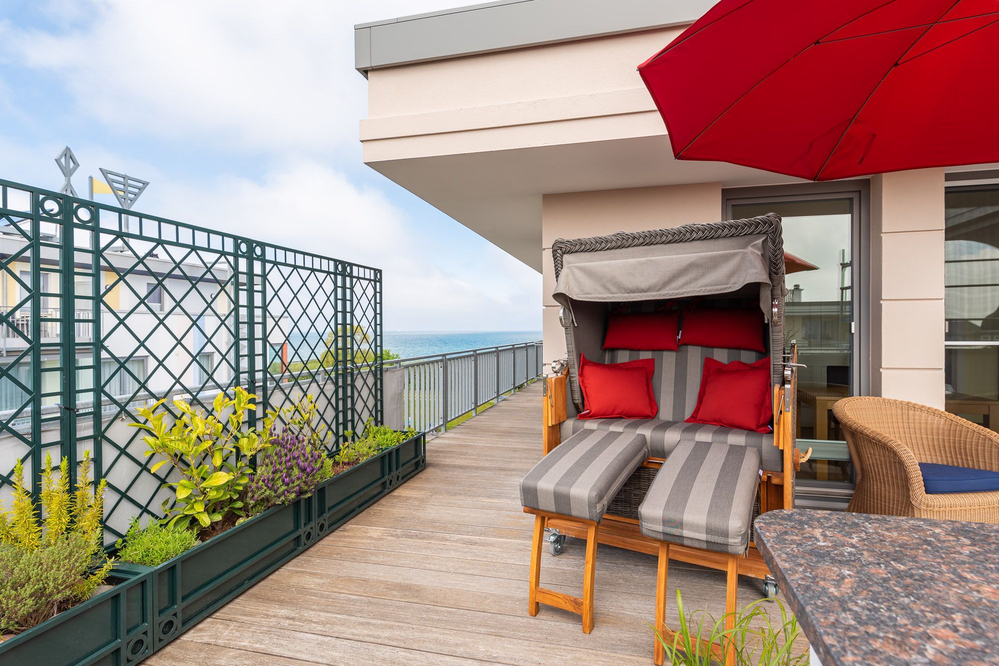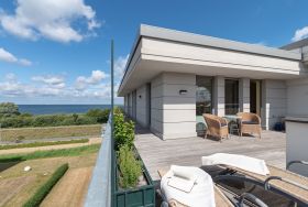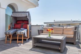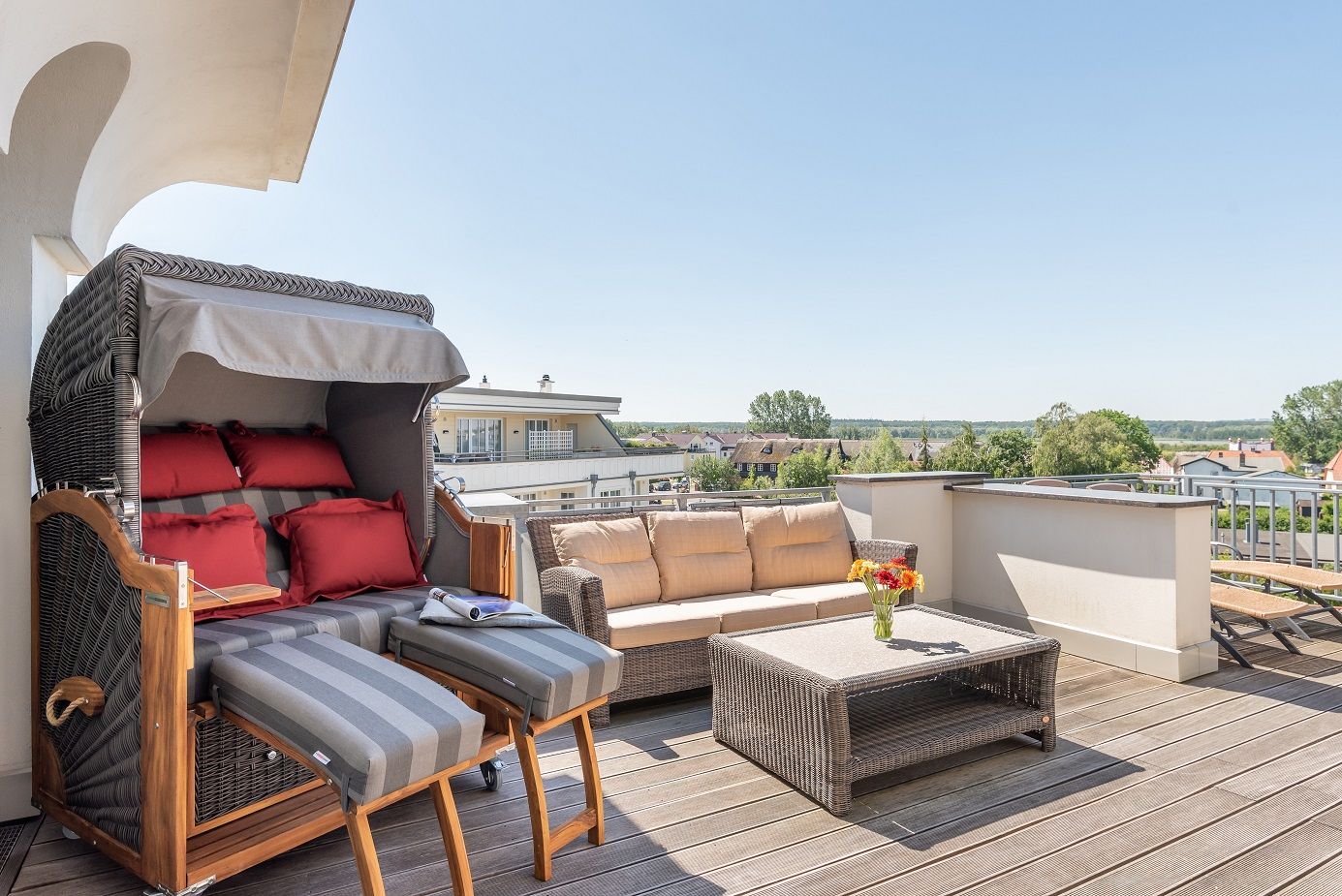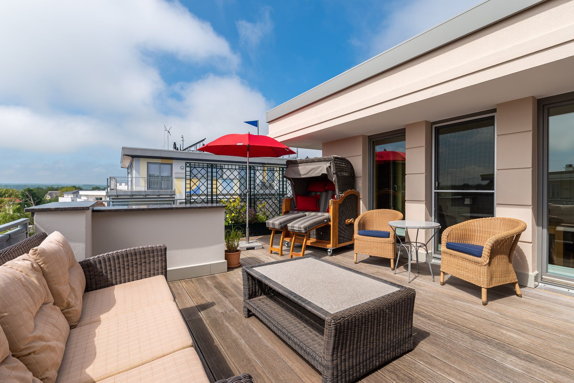 Strandnahe 2-Raum-Penthouse-Wohnung für max. 3 Erwachsenen und 1 Kleinkind, große Dachterrasse (Balkon) mit Strandkorb und traumhaftem Ostseeblick im 3.OG.