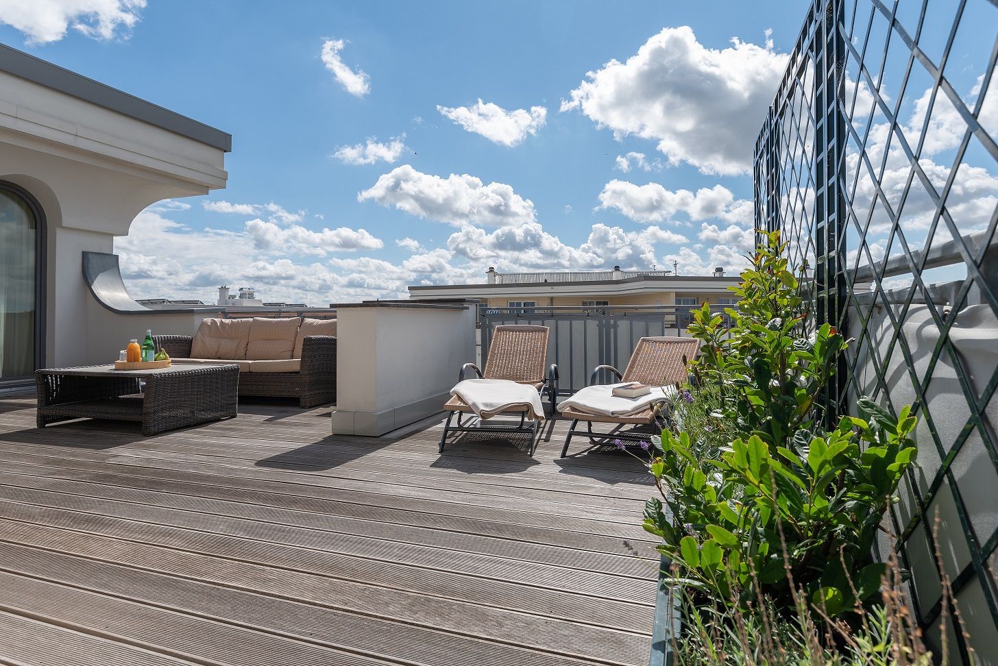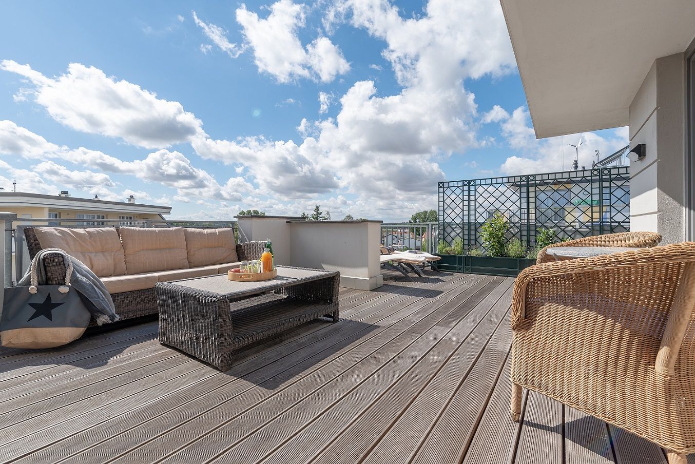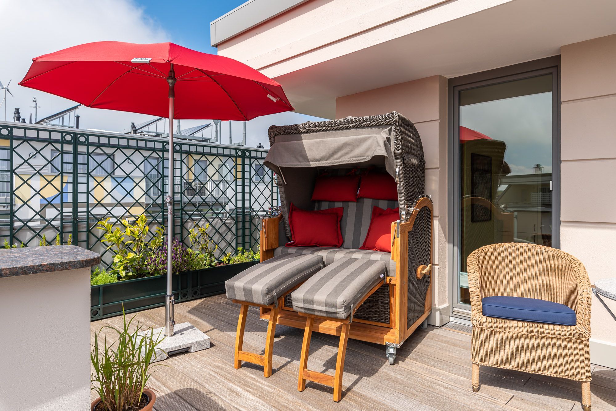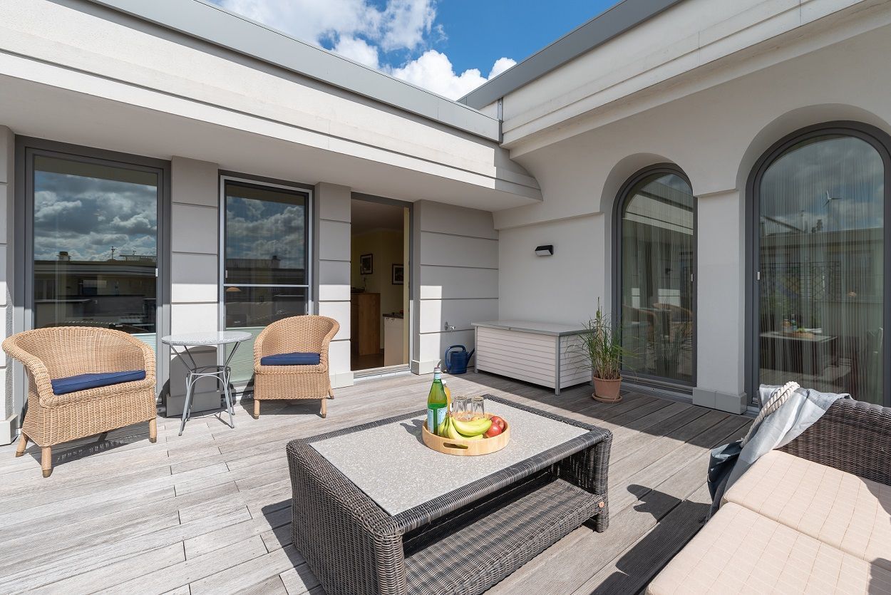 Strandnahe 2-Raum-Penthouse-Wohnung für max. 3 Erwachsenen und 1 Kleinkind, große Dachterrasse (Balkon) mit Strandkorb und traumhaftem Ostseeblick im 3.OG.