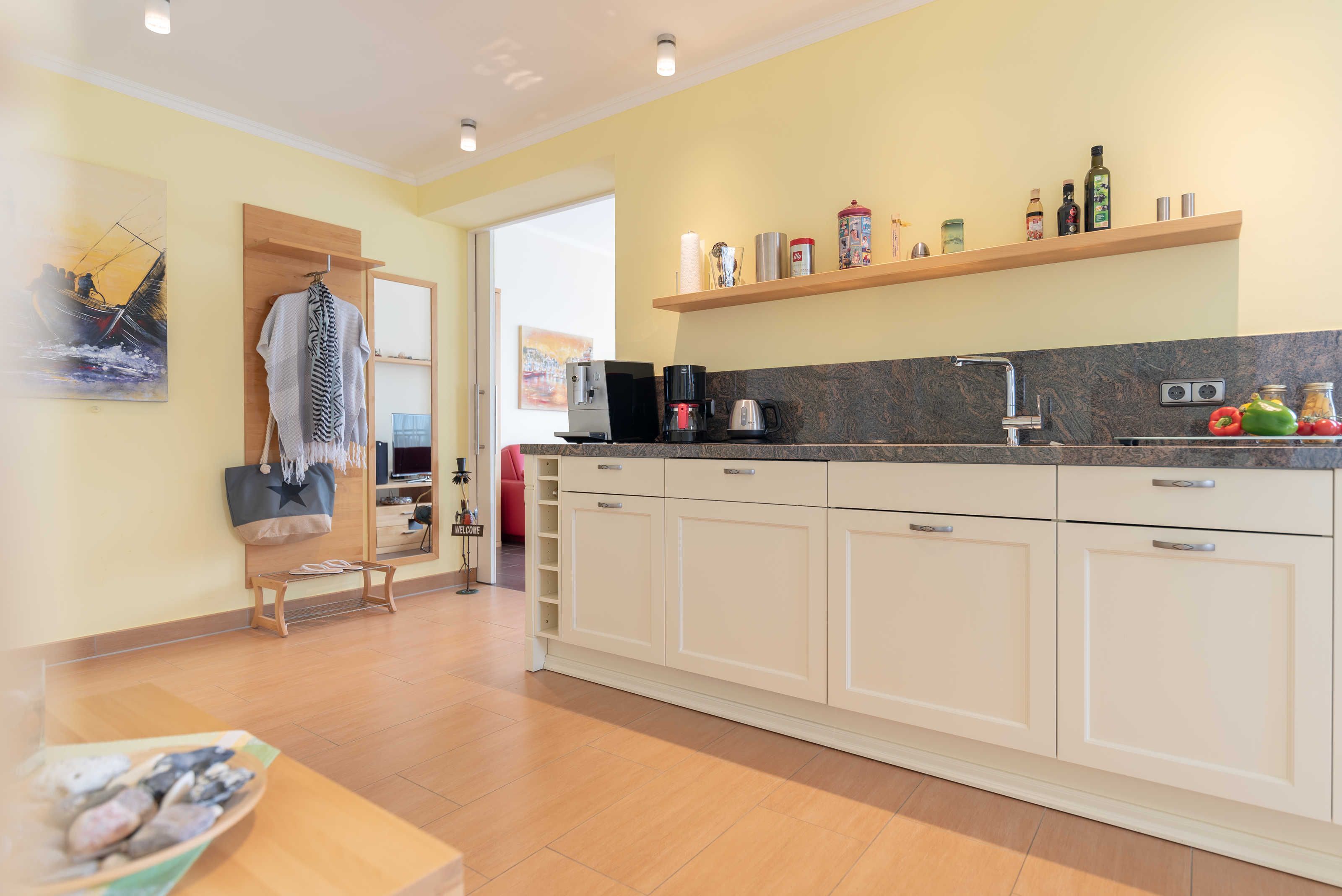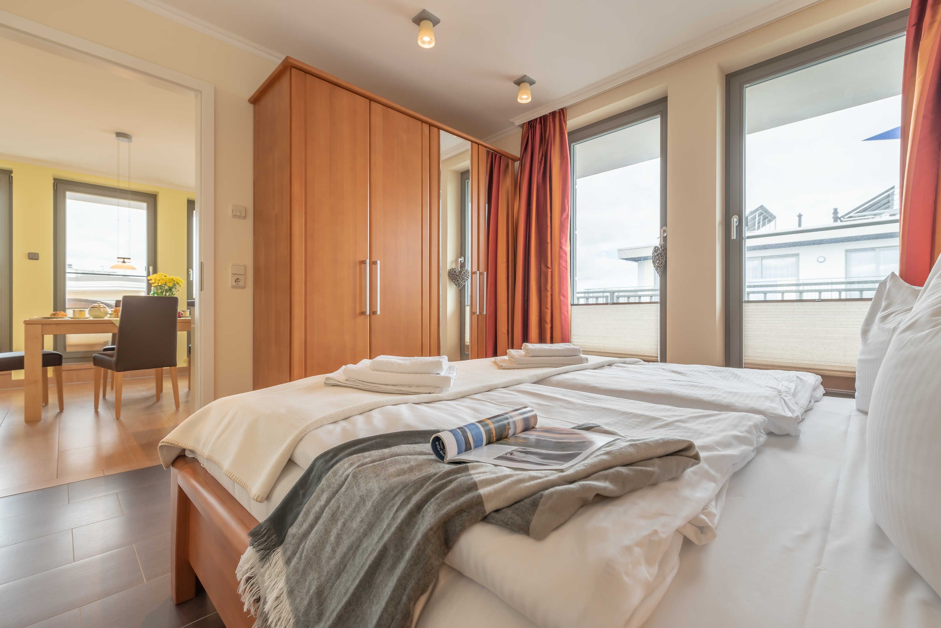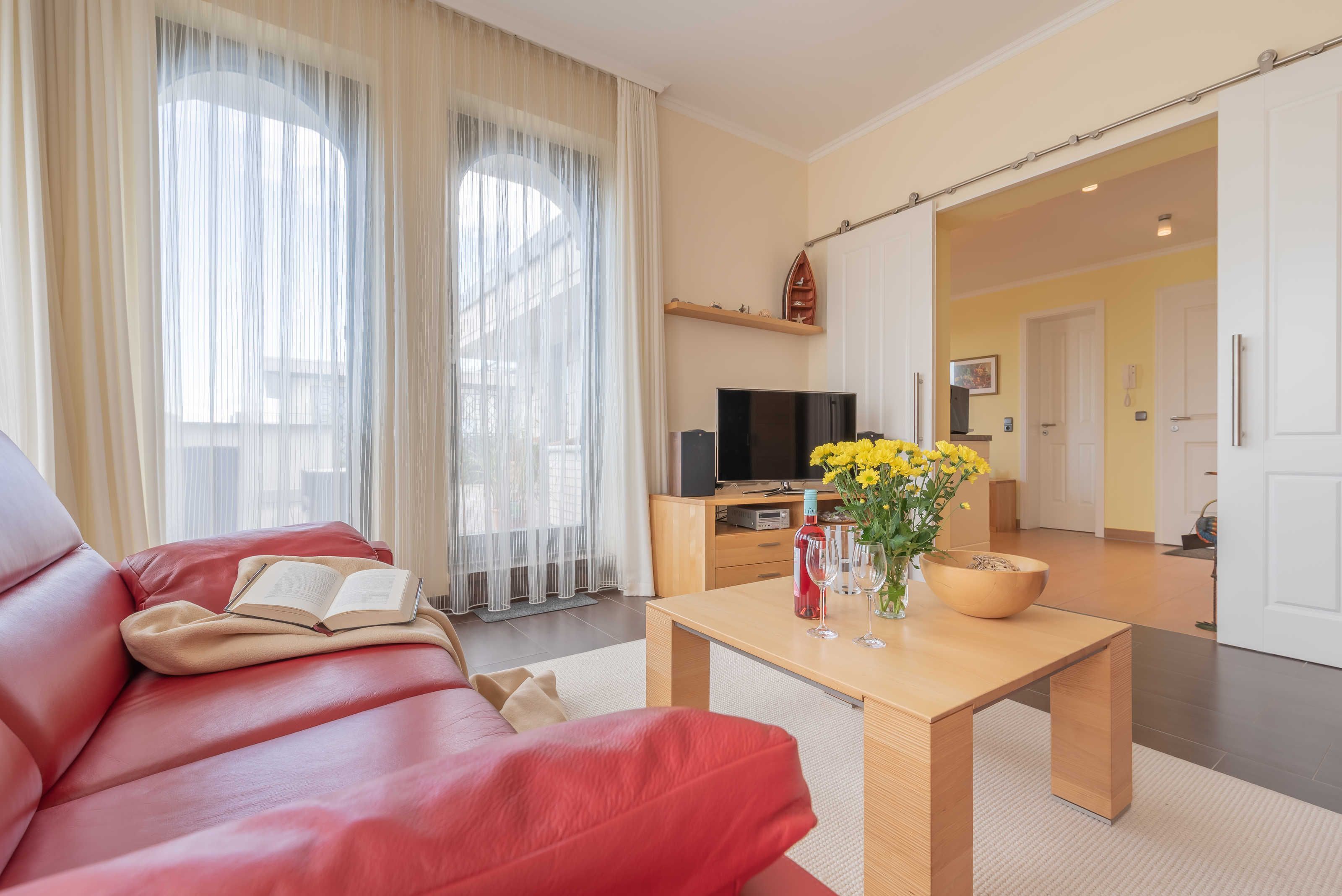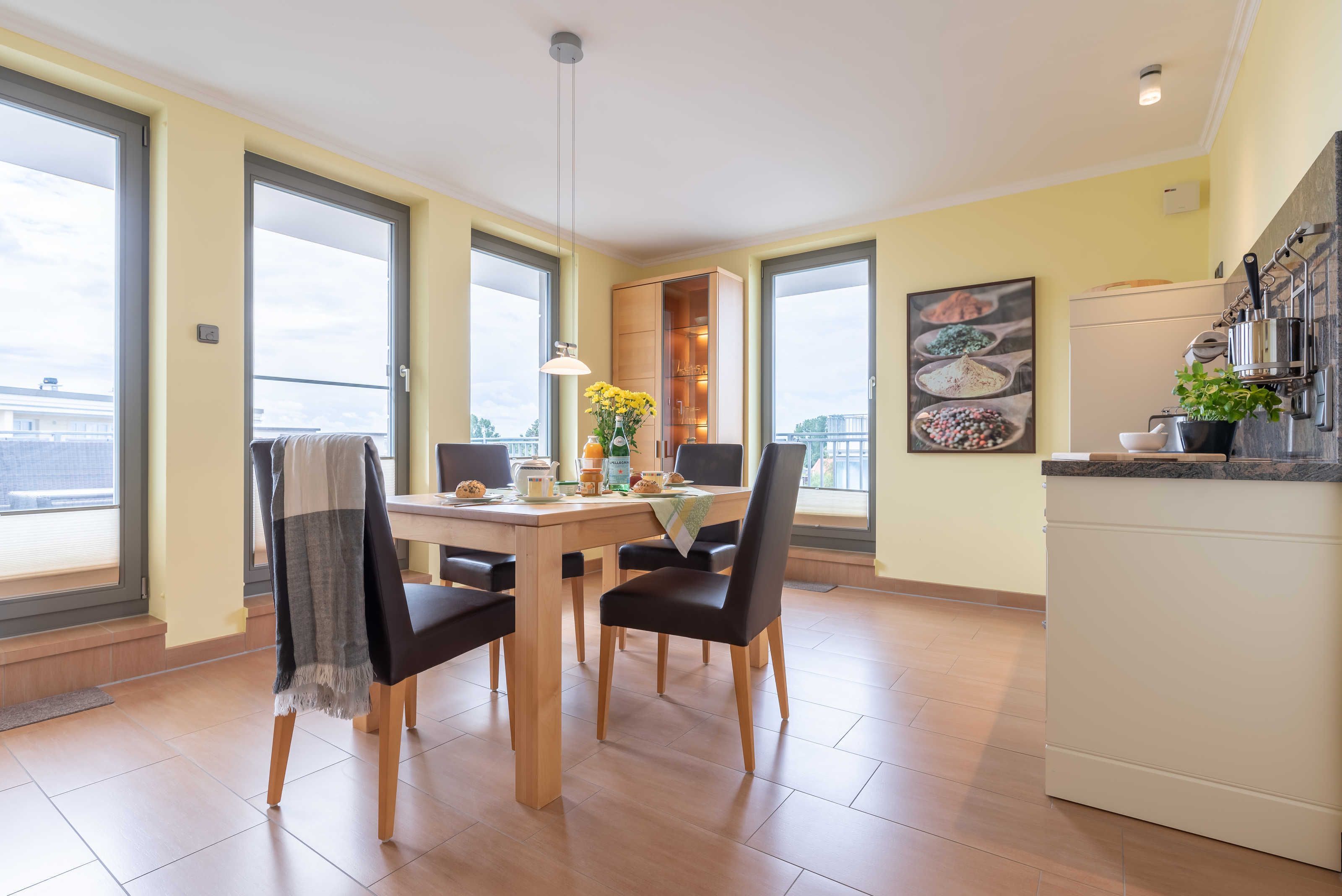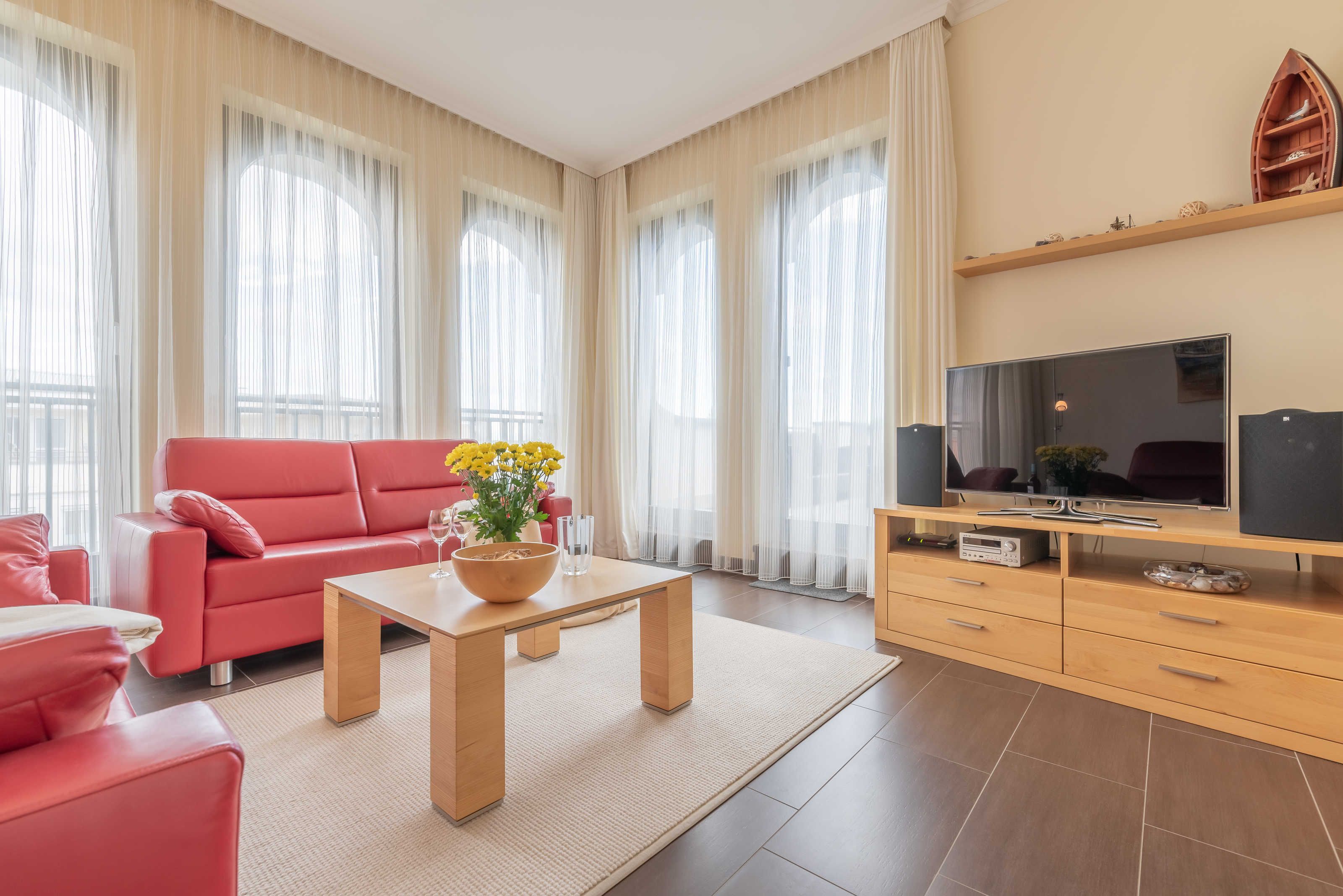 Treten Sie ein in den hellen, lichtdurchfluteten Wohnraum. Massivholzmöbeln aus Erlenholz geben dem Raum ein warmes angenehmes Flair. Hingucker ist die gemütliche Leder-Sitzgarnitur, welche in wenigen Handgriffen zu einer Schlafgelegenheit für eine dritte Person umgewandelt werden kann (Liegefläche 140 x 200 cm). Ein TV- Gerät und ein CD-Player sorgen für bunte Unterhaltung. Angrenzend an den Wohnbereich befindet sich der Essbereich mit voll eingerichteter offener Einbauküche (Geschirrspüler, Ceran-Kochfeld, Backofen, Kühlschrank mit Gefrierfach, Espressomaschine, Wasserkocher, Eierkocher und Toaster). Im Schlafzimmer sorgt ein Doppelbett mit hochwertigen Kaltschaummatratzen und verstellbaren Lattenrosten für schöne Urlaubsträume. Ein geräumiger Kleiderschrank birgt ausreichend Stauraum für Ihr mitgebrachtes Gepäck. Das elegante Duschbad verwöhnt Sie mit einer bodengleichen Dusche, inklusive Regenbrause. In einem separaten Abstellraum befinden sich Staubsauger, Bodenwischer, Eimer, Handfeger, Besen, Kehrblech und Wäscheständer sowie ein Einbauschrank mit Hotelsafe. In allen Räumen wurde eine Fußbodenheizung installiert. Highlight der Wohnung ist die großzügige Dachterrasse (Balkon) mit Süd-West-Ausrichtung. Ausgestattet mit Terrassenmöbeln und einem großen Strandkorb lassen sich hier erholsame Sonnenstunden und unvergessliche Sonnenuntergänge genießen. Die Unterkunft liegt nur 50 m vom Ostseestrand entfernt. Zur Wohnung gehören zudem ein kostenfreier Tiefgaragenstellplatz und eine Abstellmöglichkeit für Fahrräder. Bitte beachten Sie die Durchfahrtshöhe von max. 1,90 m der Tiefgarage. Mit einem Personenaufzug gelangen Sie von der Tiefgarage aus direkt zu Ihrer Wohnung. Im Erdgeschoss der Wohnung befindet sich ein gekennzeichneter Abstellbereich für Kinderwagen. Das kostenfreie WLAN in der Unterkunft ist ausschließlich für die Verwendung von Social Media und den Austausch von Bildern mit Familie und Freunden gedacht. Die Nutzung zum Streamen von Filmen ist nicht vorgesehen. Hier noch einige Hinweise: Es handelt sich um eine Nichtraucherwohnung. Es sind keine Haustiere erlaubt. Die Kosten der Bettwäsche und Handtücher Erstausstattung sind inklusive. Eine Waschmaschine und ein Trockner stehen im separaten Hauswirtschaftsraum im Untergeschoss der Villa zu Ihrer Verfügung (gegen Gebühr / 1,00 Euro Münzen). Buchungen in der Neben- und Zwischensaison sind ab 4 Übernachtungen möglich. In der Hauptsaison gilt ein Mindestaufenthalt von 7 Übernachtungen. Ein Kinderreisebett und ein Kinderhochstuhl können kostenpflichtig zugebucht werden. Sichern Sie sich zusätzlich einen der begehrten Strandkörbe nur ein paar Meter entfernt von den rauschenden Wellen der Ostsee (Anfang Mai - Ende August) und buchen Sie jetzt zu besonderen Konditionen (12,00 Euro pro Tag oder 75,00 Euro pro Woche).