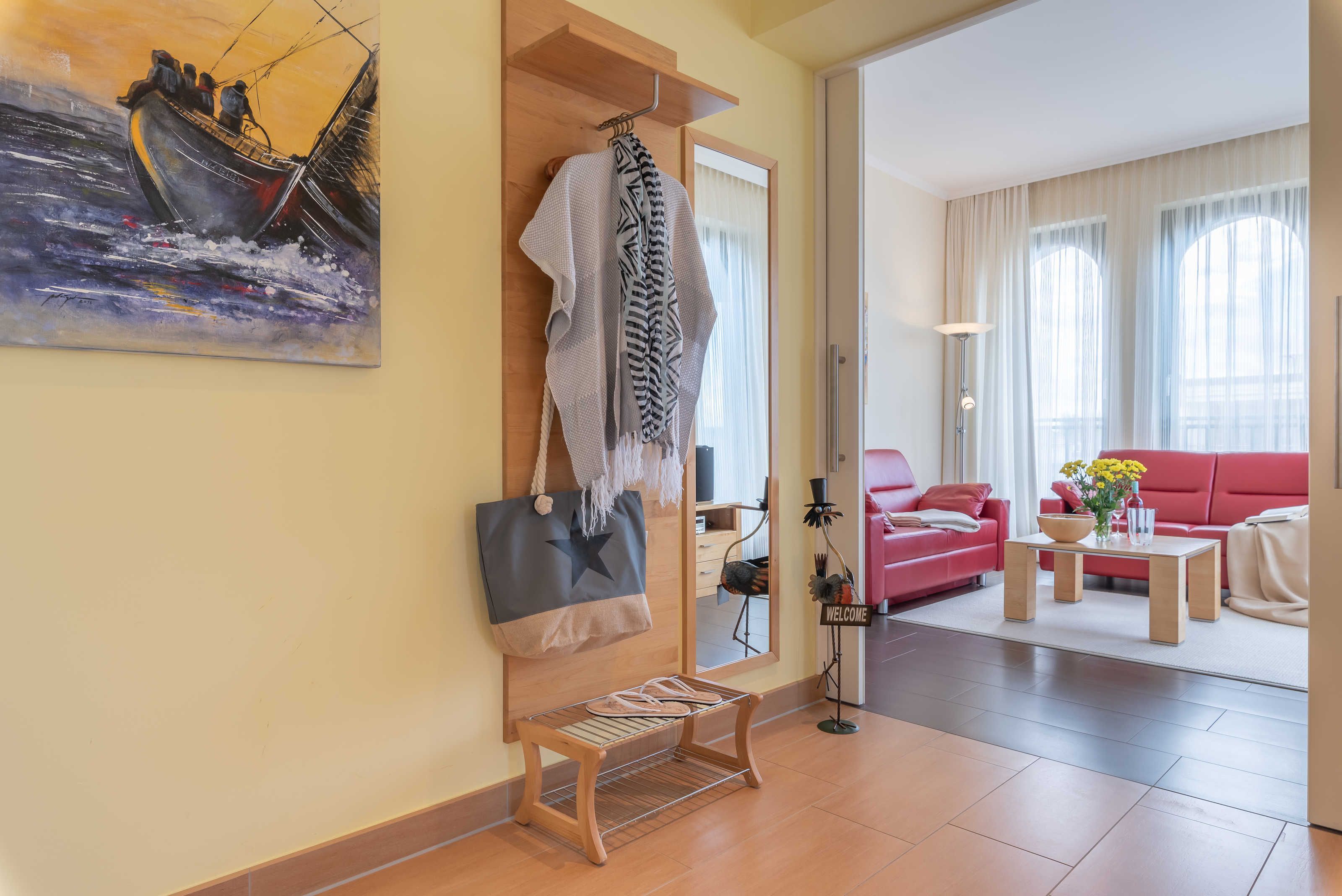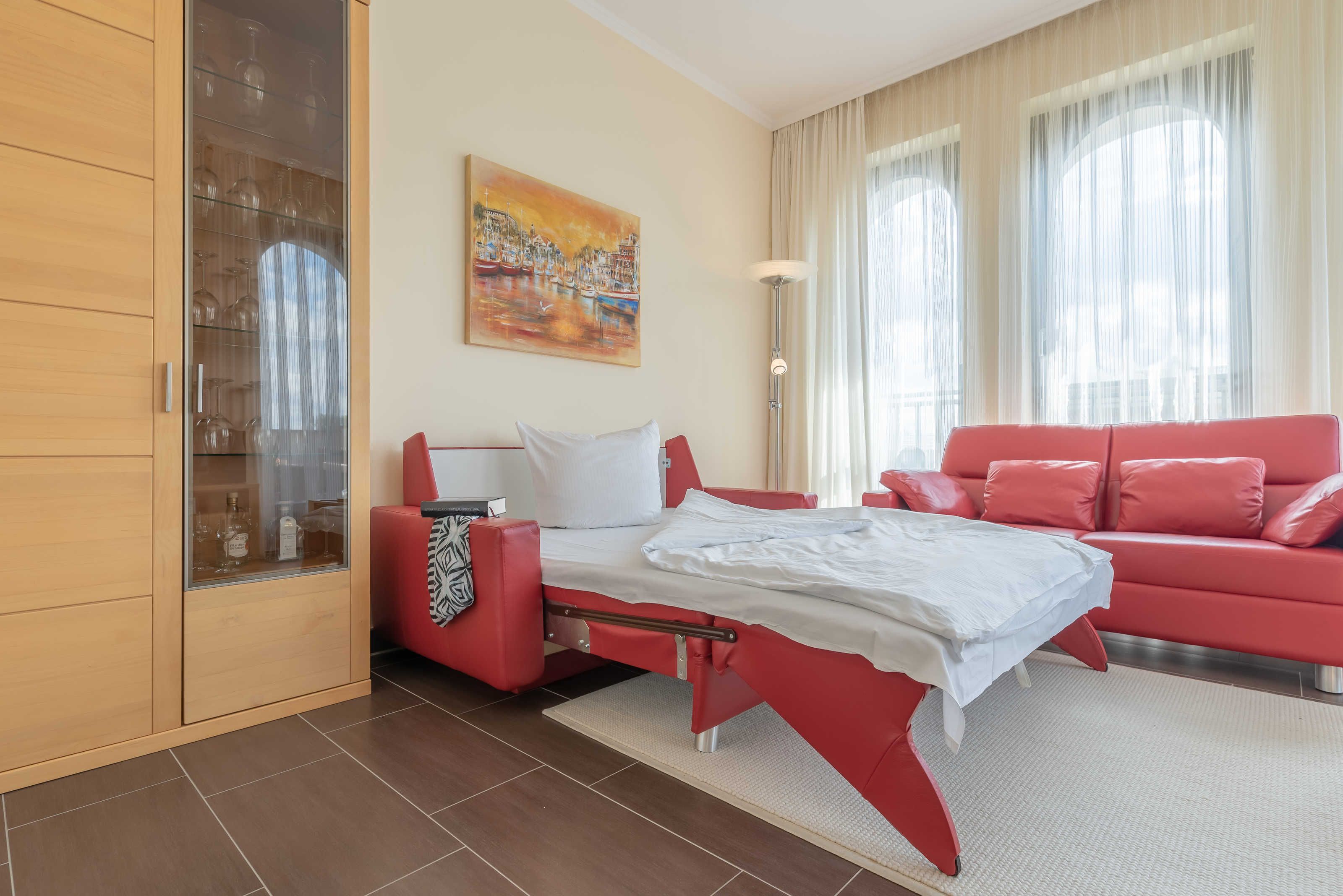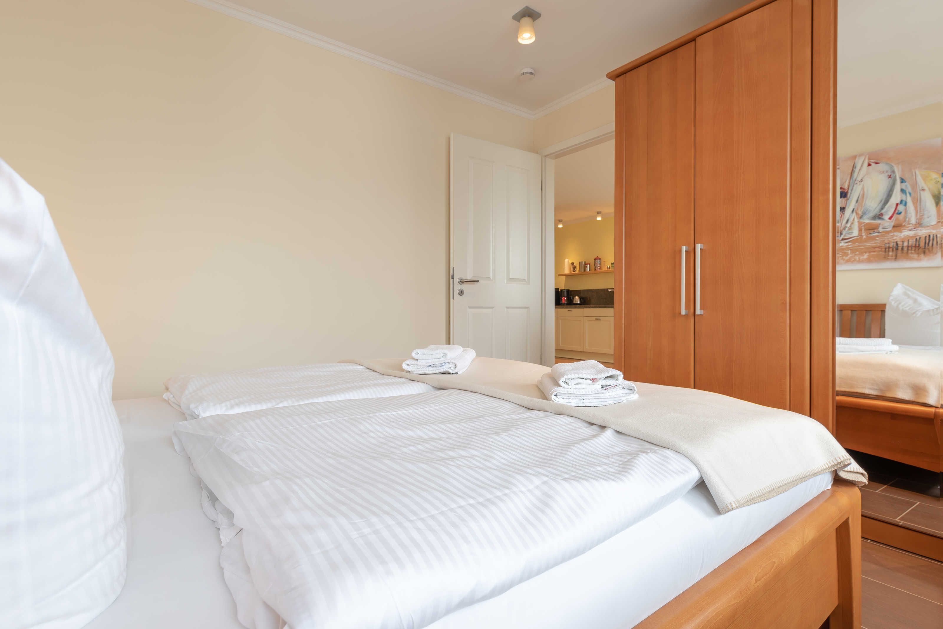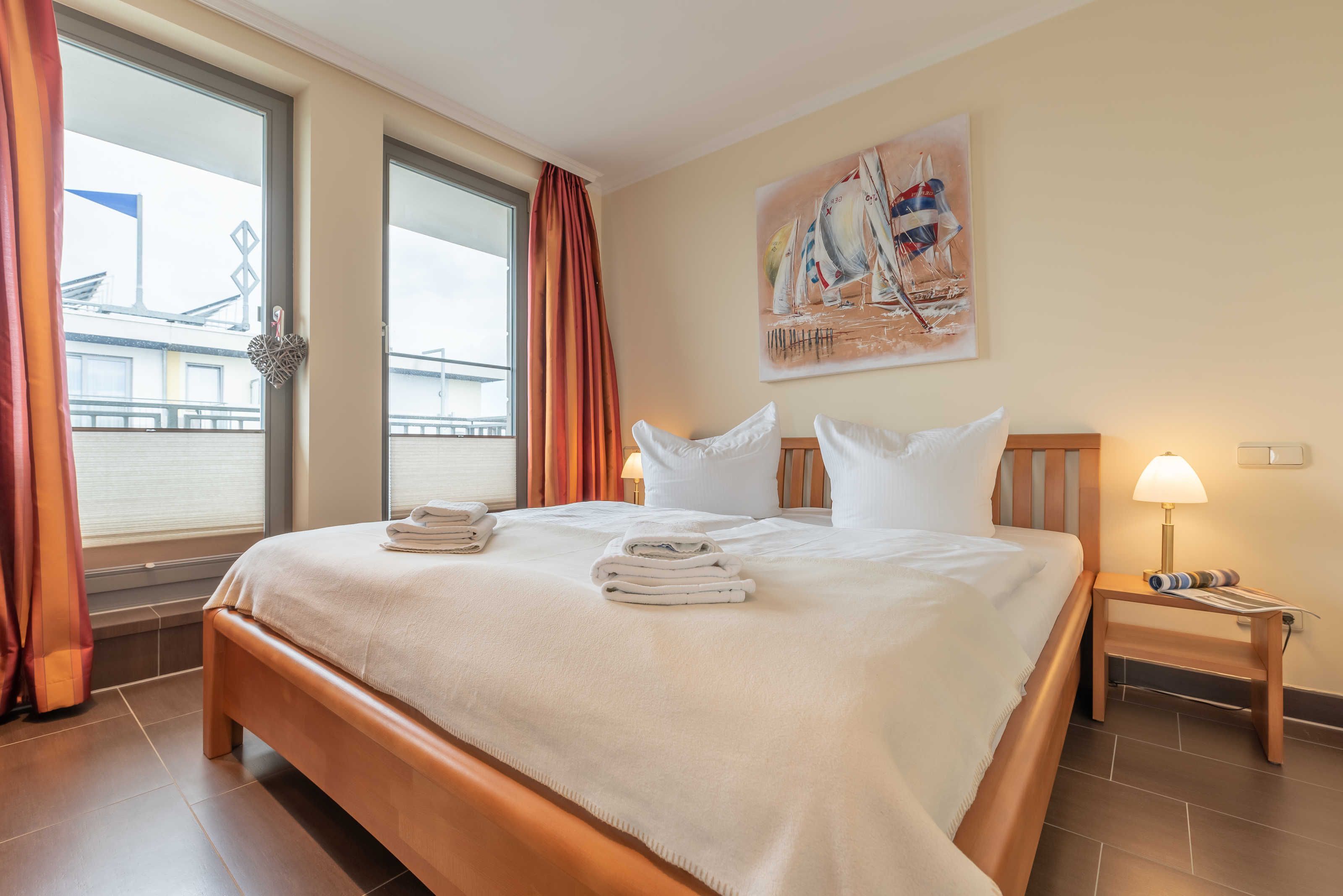 Treten Sie ein in den hellen, lichtdurchfluteten Wohnraum. Massivholzmöbeln aus Erlenholz geben dem Raum ein warmes angenehmes Flair. Hingucker ist die gemütliche Leder-Sitzgarnitur, welche in wenigen Handgriffen zu einer Schlafgelegenheit für eine dritte Person umgewandelt werden kann (Liegefläche 140 x 200 cm). Ein TV- Gerät und ein CD-Player sorgen für bunte Unterhaltung. Angrenzend an den Wohnbereich befindet sich der Essbereich mit voll eingerichteter offener Einbauküche (Geschirrspüler, Ceran-Kochfeld, Backofen, Kühlschrank mit Gefrierfach, Espressomaschine, Wasserkocher, Eierkocher und Toaster). Im Schlafzimmer sorgt ein Doppelbett mit hochwertigen Kaltschaummatratzen und verstellbaren Lattenrosten für schöne Urlaubsträume. Ein geräumiger Kleiderschrank birgt ausreichend Stauraum für Ihr mitgebrachtes Gepäck. Das elegante Duschbad verwöhnt Sie mit einer bodengleichen Dusche, inklusive Regenbrause. In einem separaten Abstellraum befinden sich Staubsauger, Bodenwischer, Eimer, Handfeger, Besen, Kehrblech und Wäscheständer sowie ein Einbauschrank mit Hotelsafe. In allen Räumen wurde eine Fußbodenheizung installiert. Highlight der Wohnung ist die großzügige Dachterrasse (Balkon) mit Süd-West-Ausrichtung. Ausgestattet mit Terrassenmöbeln und einem großen Strandkorb lassen sich hier erholsame Sonnenstunden und unvergessliche Sonnenuntergänge genießen. Die Unterkunft liegt nur 50 m vom Ostseestrand entfernt. Zur Wohnung gehören zudem ein kostenfreier Tiefgaragenstellplatz und eine Abstellmöglichkeit für Fahrräder. Bitte beachten Sie die Durchfahrtshöhe von max. 1,90 m der Tiefgarage. Mit einem Personenaufzug gelangen Sie von der Tiefgarage aus direkt zu Ihrer Wohnung. Im Erdgeschoss der Wohnung befindet sich ein gekennzeichneter Abstellbereich für Kinderwagen. Das kostenfreie WLAN in der Unterkunft ist ausschließlich für die Verwendung von Social Media und den Austausch von Bildern mit Familie und Freunden gedacht. Die Nutzung zum Streamen von Filmen ist nicht vorgesehen. Hier noch einige Hinweise: Es handelt sich um eine Nichtraucherwohnung. Es sind keine Haustiere erlaubt. Die Kosten der Bettwäsche und Handtücher Erstausstattung sind inklusive. Eine Waschmaschine und ein Trockner stehen im separaten Hauswirtschaftsraum im Untergeschoss der Villa zu Ihrer Verfügung (gegen Gebühr / 1,00 Euro Münzen). Buchungen in der Neben- und Zwischensaison sind ab 4 Übernachtungen möglich. In der Hauptsaison gilt ein Mindestaufenthalt von 7 Übernachtungen. Ein Kinderreisebett und ein Kinderhochstuhl können kostenpflichtig zugebucht werden. Sichern Sie sich zusätzlich einen der begehrten Strandkörbe nur ein paar Meter entfernt von den rauschenden Wellen der Ostsee (Anfang Mai - Ende August) und buchen Sie jetzt zu besonderen Konditionen (12,00 Euro pro Tag oder 75,00 Euro pro Woche).
