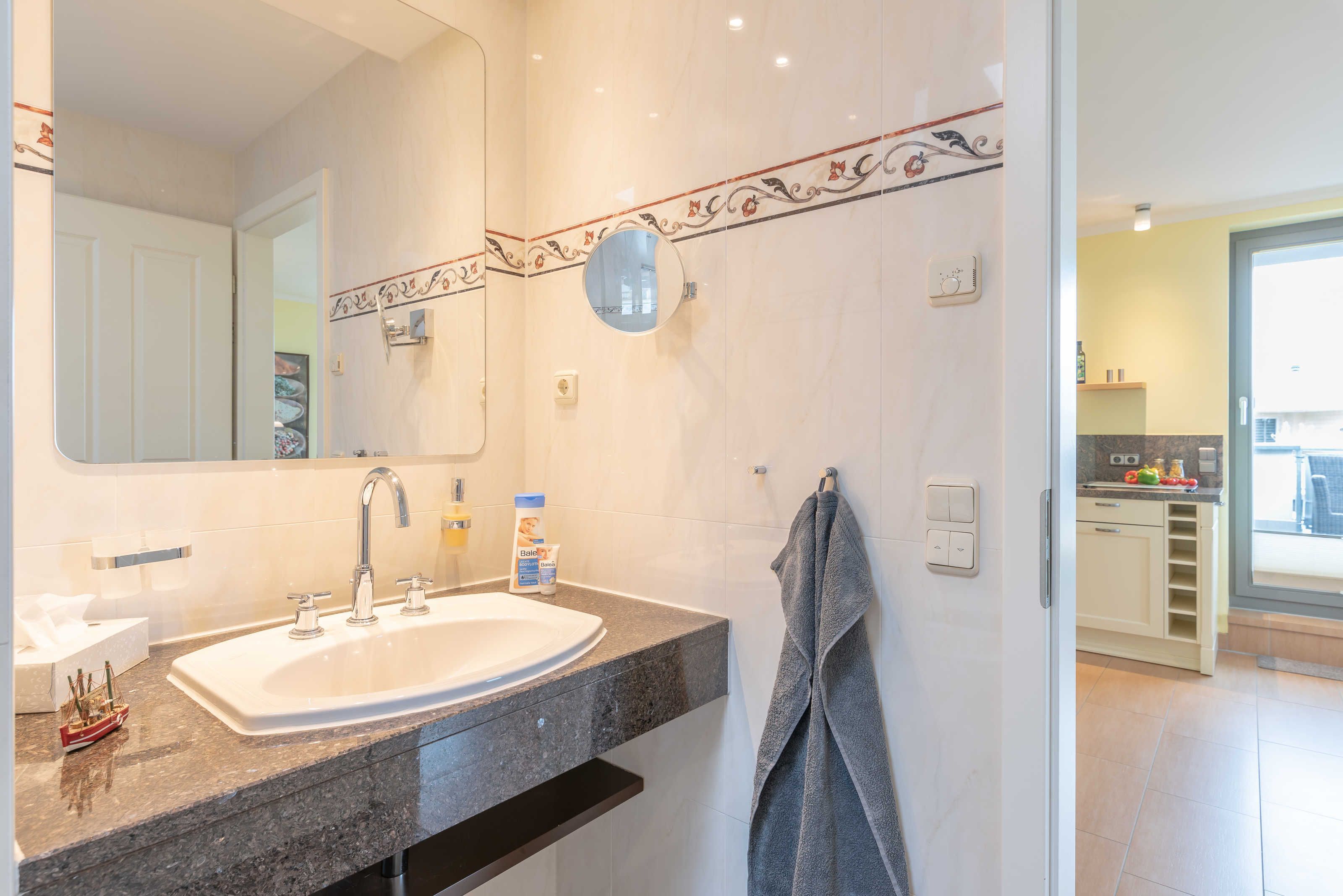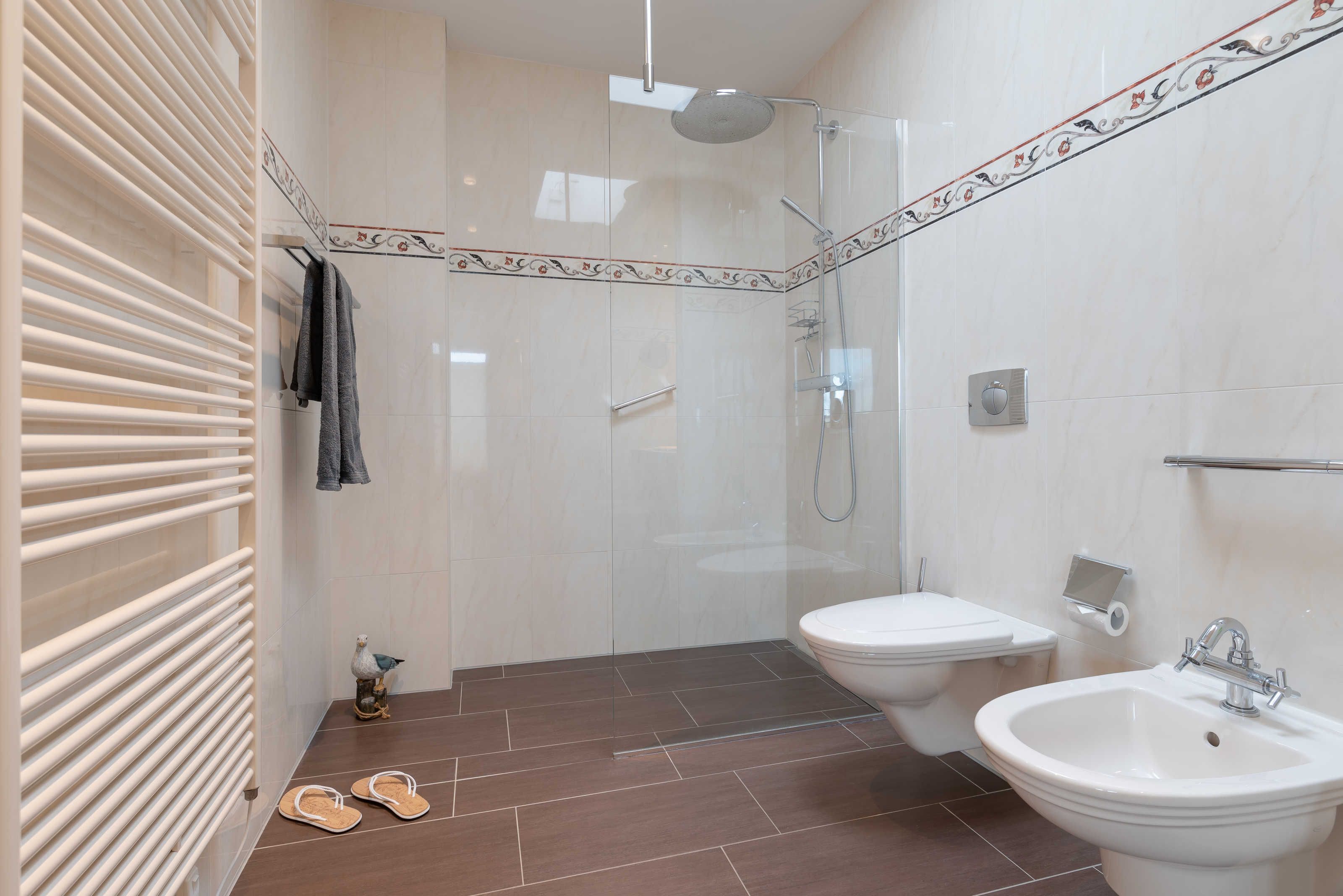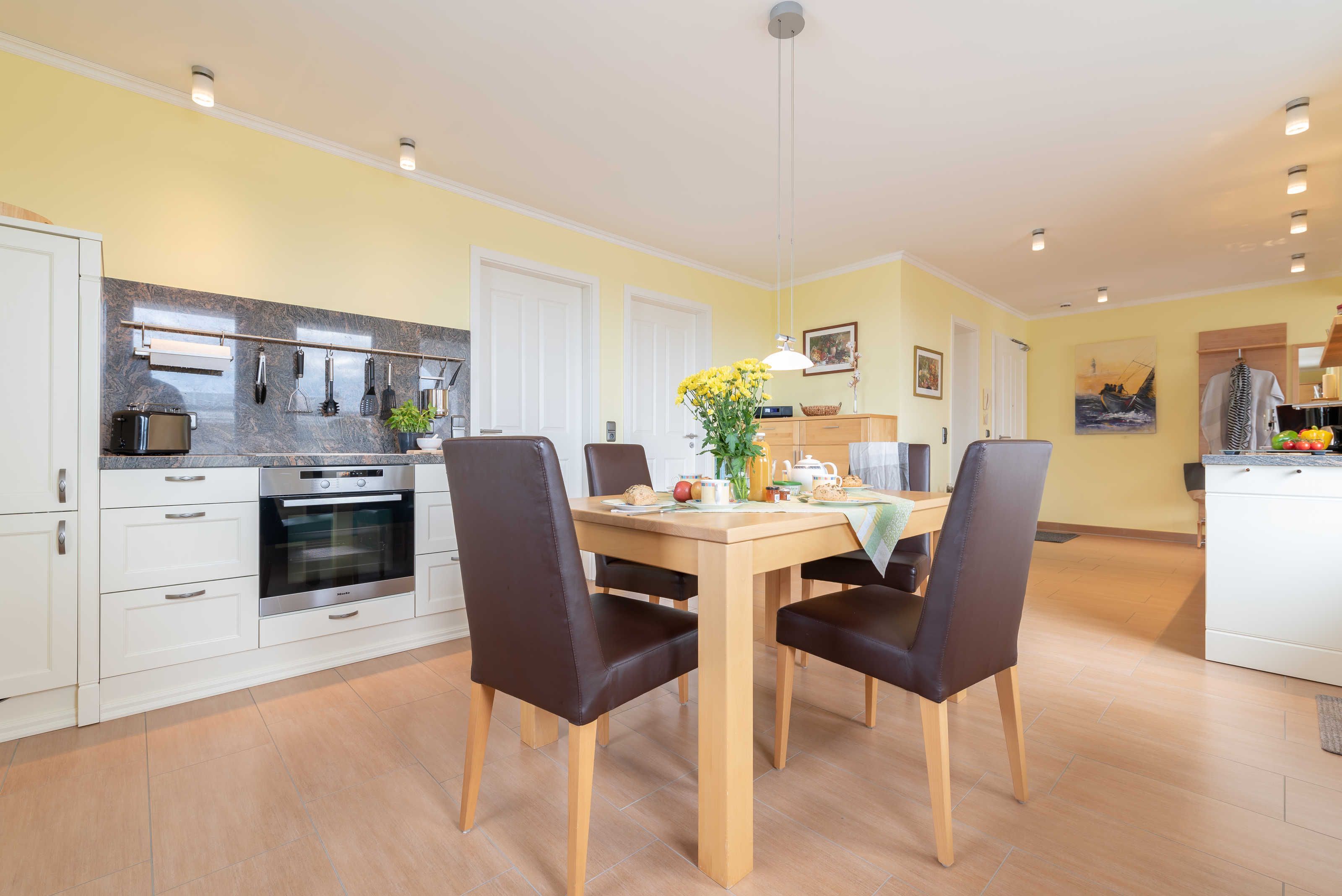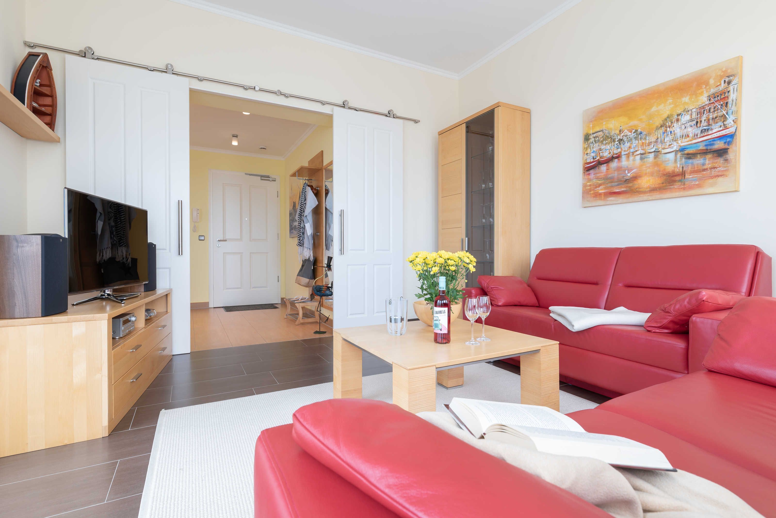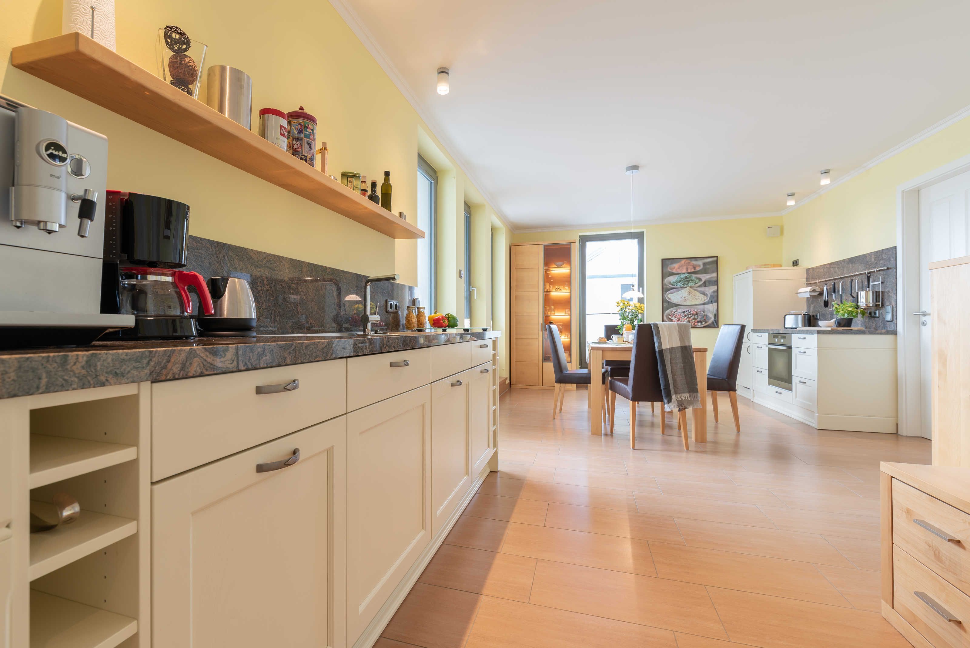 Treten Sie ein in den hellen, lichtdurchfluteten Wohnraum. Massivholzmöbeln aus Erlenholz geben dem Raum ein warmes angenehmes Flair. Hingucker ist die gemütliche Leder-Sitzgarnitur, welche in wenigen Handgriffen zu einer Schlafgelegenheit für eine dritte Person umgewandelt werden kann (Liegefläche 140 x 200 cm). Ein TV- Gerät und ein CD-Player sorgen für bunte Unterhaltung. Angrenzend an den Wohnbereich befindet sich der Essbereich mit voll eingerichteter offener Einbauküche (Geschirrspüler, Ceran-Kochfeld, Backofen, Kühlschrank mit Gefrierfach, Espressomaschine, Wasserkocher, Eierkocher und Toaster). Im Schlafzimmer sorgt ein Doppelbett mit hochwertigen Kaltschaummatratzen und verstellbaren Lattenrosten für schöne Urlaubsträume. Ein geräumiger Kleiderschrank birgt ausreichend Stauraum für Ihr mitgebrachtes Gepäck. Das elegante Duschbad verwöhnt Sie mit einer bodengleichen Dusche, inklusive Regenbrause. In einem separaten Abstellraum befinden sich Staubsauger, Bodenwischer, Eimer, Handfeger, Besen, Kehrblech und Wäscheständer sowie ein Einbauschrank mit Hotelsafe. In allen Räumen wurde eine Fußbodenheizung installiert. Highlight der Wohnung ist die großzügige Dachterrasse (Balkon) mit Süd-West-Ausrichtung. Ausgestattet mit Terrassenmöbeln und einem großen Strandkorb lassen sich hier erholsame Sonnenstunden und unvergessliche Sonnenuntergänge genießen. Die Unterkunft liegt nur 50 m vom Ostseestrand entfernt. Zur Wohnung gehören zudem ein kostenfreier Tiefgaragenstellplatz und eine Abstellmöglichkeit für Fahrräder. Bitte beachten Sie die Durchfahrtshöhe von max. 1,90 m der Tiefgarage. Mit einem Personenaufzug gelangen Sie von der Tiefgarage aus direkt zu Ihrer Wohnung. Im Erdgeschoss der Wohnung befindet sich ein gekennzeichneter Abstellbereich für Kinderwagen. Das kostenfreie WLAN in der Unterkunft ist ausschließlich für die Verwendung von Social Media und den Austausch von Bildern mit Familie und Freunden gedacht. Die Nutzung zum Streamen von Filmen ist nicht vorgesehen. Hier noch einige Hinweise: Es handelt sich um eine Nichtraucherwohnung. Es sind keine Haustiere erlaubt. Die Kosten der Bettwäsche und Handtücher Erstausstattung sind inklusive. Eine Waschmaschine und ein Trockner stehen im separaten Hauswirtschaftsraum im Untergeschoss der Villa zu Ihrer Verfügung (gegen Gebühr / 1,00 Euro Münzen). Buchungen in der Neben- und Zwischensaison sind ab 4 Übernachtungen möglich. In der Hauptsaison gilt ein Mindestaufenthalt von 7 Übernachtungen. Ein Kinderreisebett und ein Kinderhochstuhl können kostenpflichtig zugebucht werden. Sichern Sie sich zusätzlich einen der begehrten Strandkörbe nur ein paar Meter entfernt von den rauschenden Wellen der Ostsee (Anfang Mai - Ende August) und buchen Sie jetzt zu besonderen Konditionen (12,00 Euro pro Tag oder 75,00 Euro pro Woche).