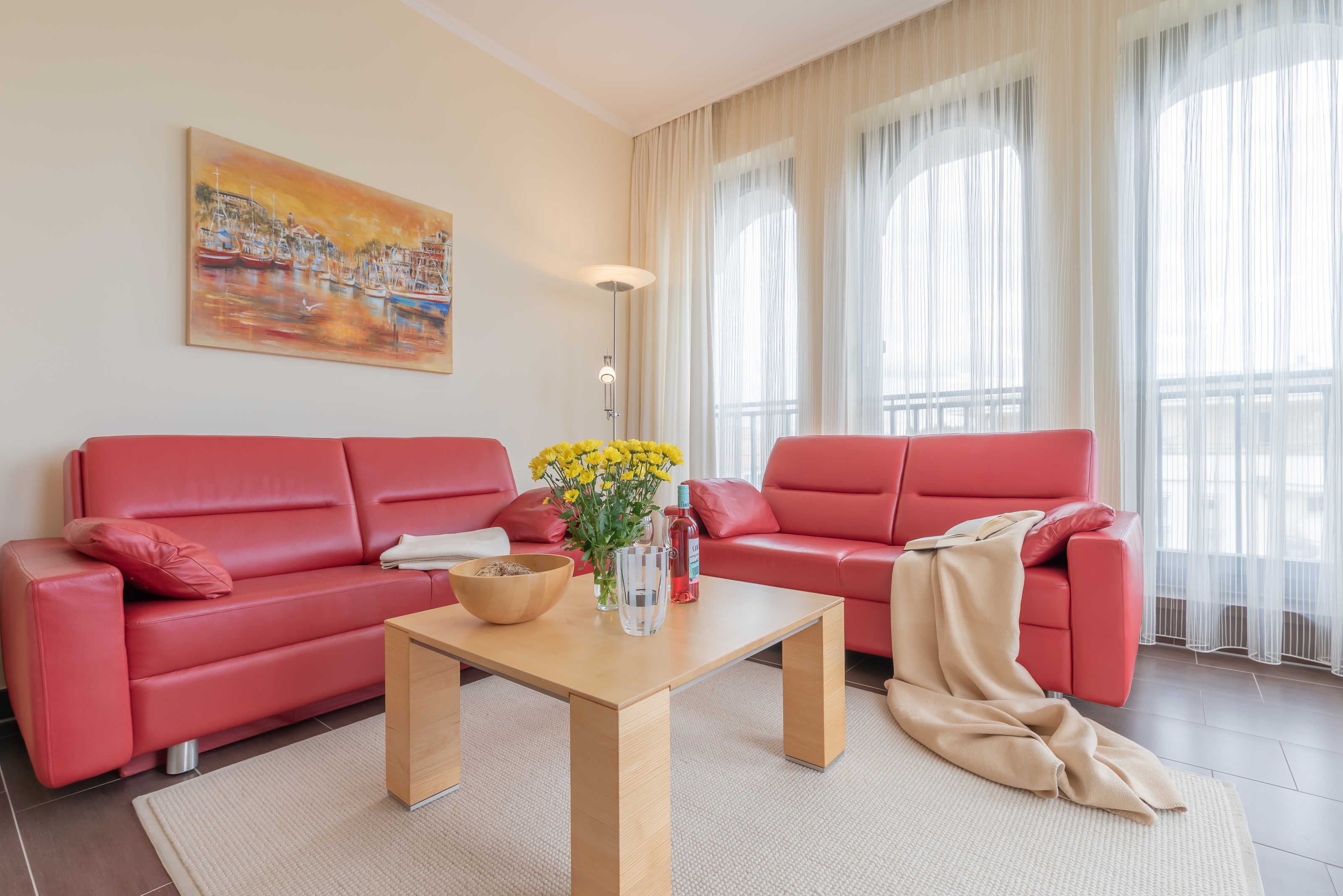 Treten Sie ein in den hellen, lichtdurchfluteten Wohnraum. Massivholzmöbeln aus Erlenholz geben dem Raum ein warmes angenehmes Flair. Hingucker ist die gemütliche Leder-Sitzgarnitur, welche in wenigen Handgriffen zu einer Schlafgelegenheit für eine dritte Person umgewandelt werden kann (Liegefläche 140 x 200 cm). Ein TV- Gerät und ein CD-Player sorgen für bunte Unterhaltung. Angrenzend an den Wohnbereich befindet sich der Essbereich mit voll eingerichteter offener Einbauküche (Geschirrspüler, Ceran-Kochfeld, Backofen, Kühlschrank mit Gefrierfach, Espressomaschine, Wasserkocher, Eierkocher und Toaster). Im Schlafzimmer sorgt ein Doppelbett mit hochwertigen Kaltschaummatratzen und verstellbaren Lattenrosten für schöne Urlaubsträume. Ein geräumiger Kleiderschrank birgt ausreichend Stauraum für Ihr mitgebrachtes Gepäck. Das elegante Duschbad verwöhnt Sie mit einer bodengleichen Dusche, inklusive Regenbrause. In einem separaten Abstellraum befinden sich Staubsauger, Bodenwischer, Eimer, Handfeger, Besen, Kehrblech und Wäscheständer sowie ein Einbauschrank mit Hotelsafe. In allen Räumen wurde eine Fußbodenheizung installiert. Highlight der Wohnung ist die großzügige Dachterrasse (Balkon) mit Süd-West-Ausrichtung. Ausgestattet mit Terrassenmöbeln und einem großen Strandkorb lassen sich hier erholsame Sonnenstunden und unvergessliche Sonnenuntergänge genießen. Die Unterkunft liegt nur 50 m vom Ostseestrand entfernt. Zur Wohnung gehören zudem ein kostenfreier Tiefgaragenstellplatz und eine Abstellmöglichkeit für Fahrräder. Bitte beachten Sie die Durchfahrtshöhe von max. 1,90 m der Tiefgarage. Mit einem Personenaufzug gelangen Sie von der Tiefgarage aus direkt zu Ihrer Wohnung. Im Erdgeschoss der Wohnung befindet sich ein gekennzeichneter Abstellbereich für Kinderwagen. Das kostenfreie WLAN in der Unterkunft ist ausschließlich für die Verwendung von Social Media und den Austausch von Bildern mit Familie und Freunden gedacht. Die Nutzung zum Streamen von Filmen ist nicht vorgesehen. Hier noch einige Hinweise: Es handelt sich um eine Nichtraucherwohnung. Es sind keine Haustiere erlaubt. Die Kosten der Bettwäsche und Handtücher Erstausstattung sind inklusive. Eine Waschmaschine und ein Trockner stehen im separaten Hauswirtschaftsraum im Untergeschoss der Villa zu Ihrer Verfügung (gegen Gebühr / 1,00 € Münzen). Buchungen in der Neben- und Zwischensaison sind ab 4 Übernachtungen möglich. In der Hauptsaison gilt ein Mindestaufenthalt von 7 Übernachtungen. Ein Kinderreisebett und ein Kinderhochstuhl können kostenpflichtig zugebucht werden. Sichern Sie sich zusätzlich einen der begehrten Strandkörbe nur ein paar Meter entfernt von den rauschenden Wellen der Ostsee (Anfang Mai - Ende August) und buchen Sie jetzt zu besonderen Konditionen (12,00 € pro Tag oder 75,00 € pro Woche).