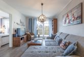 Das Wohn-/ Esszimmer empfängt Sie mit einer L-förmigen Couchgarnitur und großem Esstresen mit vier Bar-Stühlen. Ein Flatscreen TV mit DVD-Player und eine Stereoanlage runden die technische Ausstattung des Raums ab. Die offene Einbauküche ist voll ausgestattet mit Geschirrspüler, Kühl-/Gefrierkombination, Backofen, Kaffeemaschine, Wasserkocher, Toaster und Mikrowelle. Das Schlafzimmer verfügt über ein gemütliches Doppelbett und einen Kleiderschrank. Das Duschbad besticht mit Handtuchtrockner, ebenerdiger Dusche und Fön. Eine Fußbodenheizung sorgt in allen Räumen für wohlige Wärme. Über Wohn- und Schlafzimmer haben Sie Zugang auf den herrlichen Balkon mit Meerblick. Neben einer Balkonaustattung mit Tisch und Stühlen erwartet Sie zudem ein stilechter Strandkorb.