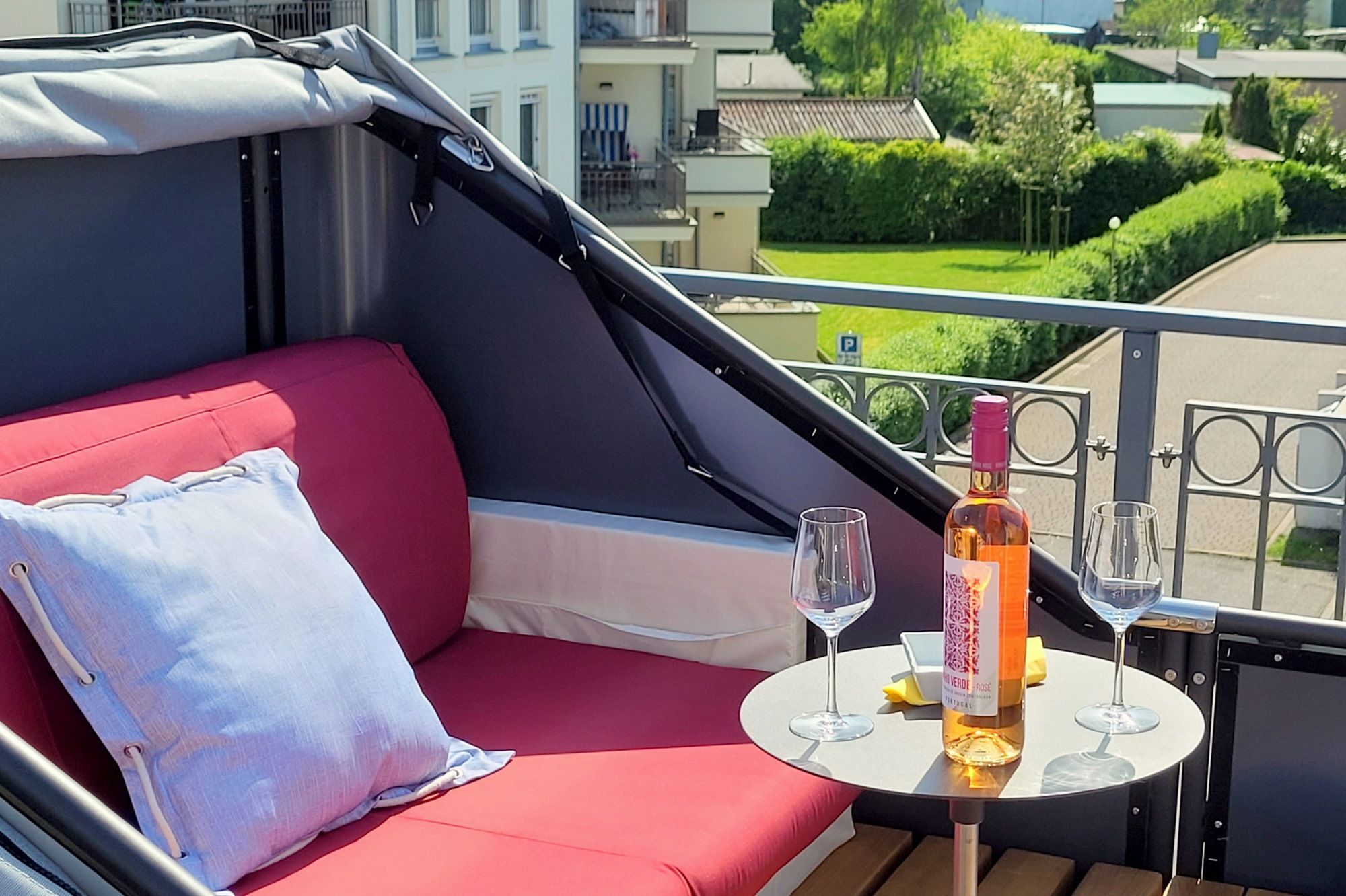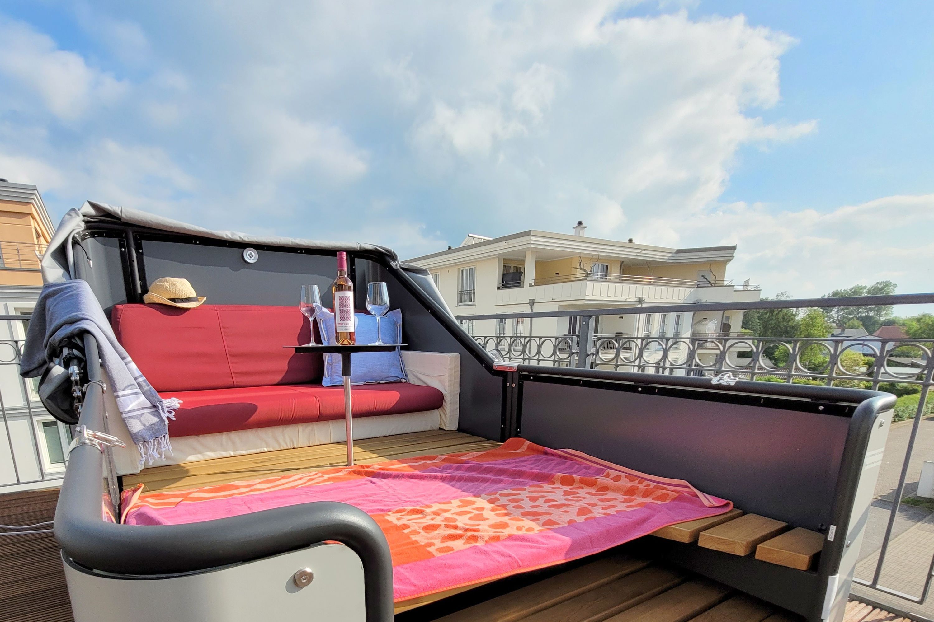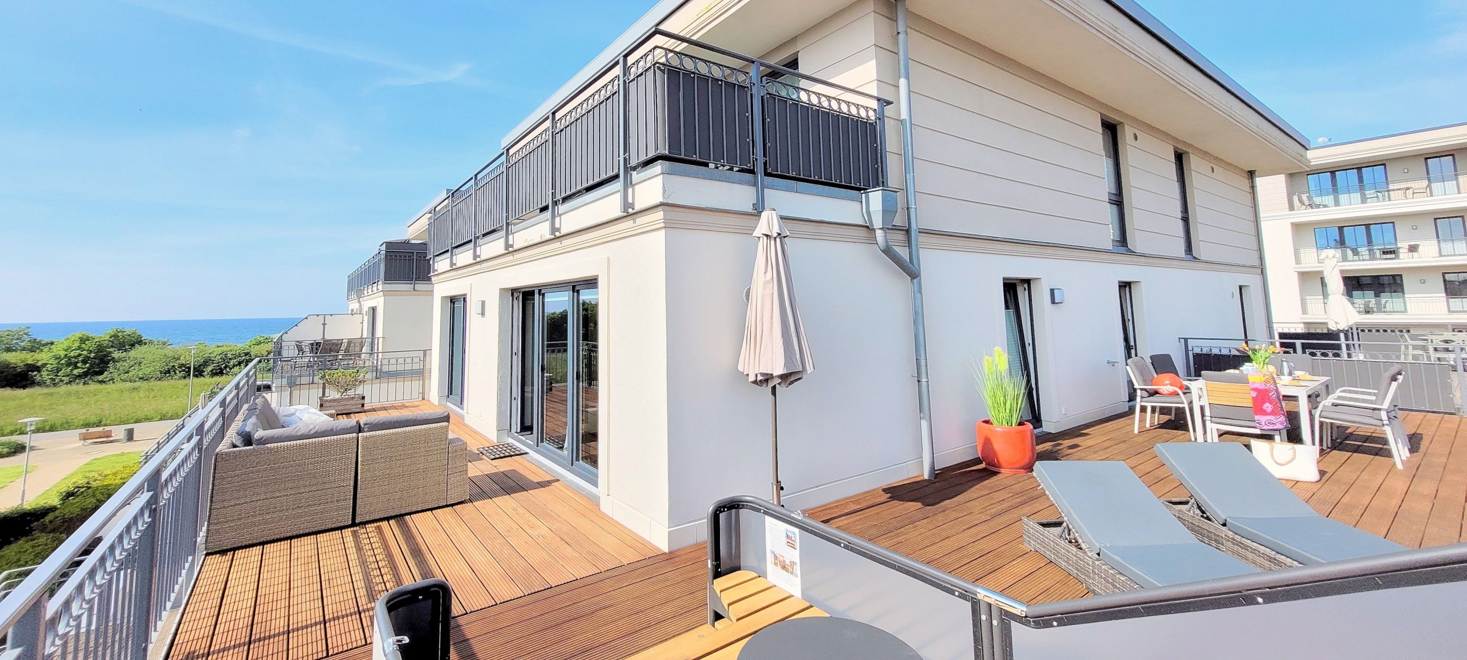 Strandnahe 3 Raum-Penthouse-Wohnung für vier Personen, Balkon (große Dachterrasse), Strandkorb und seitlichem Meerblick im 2. OG.