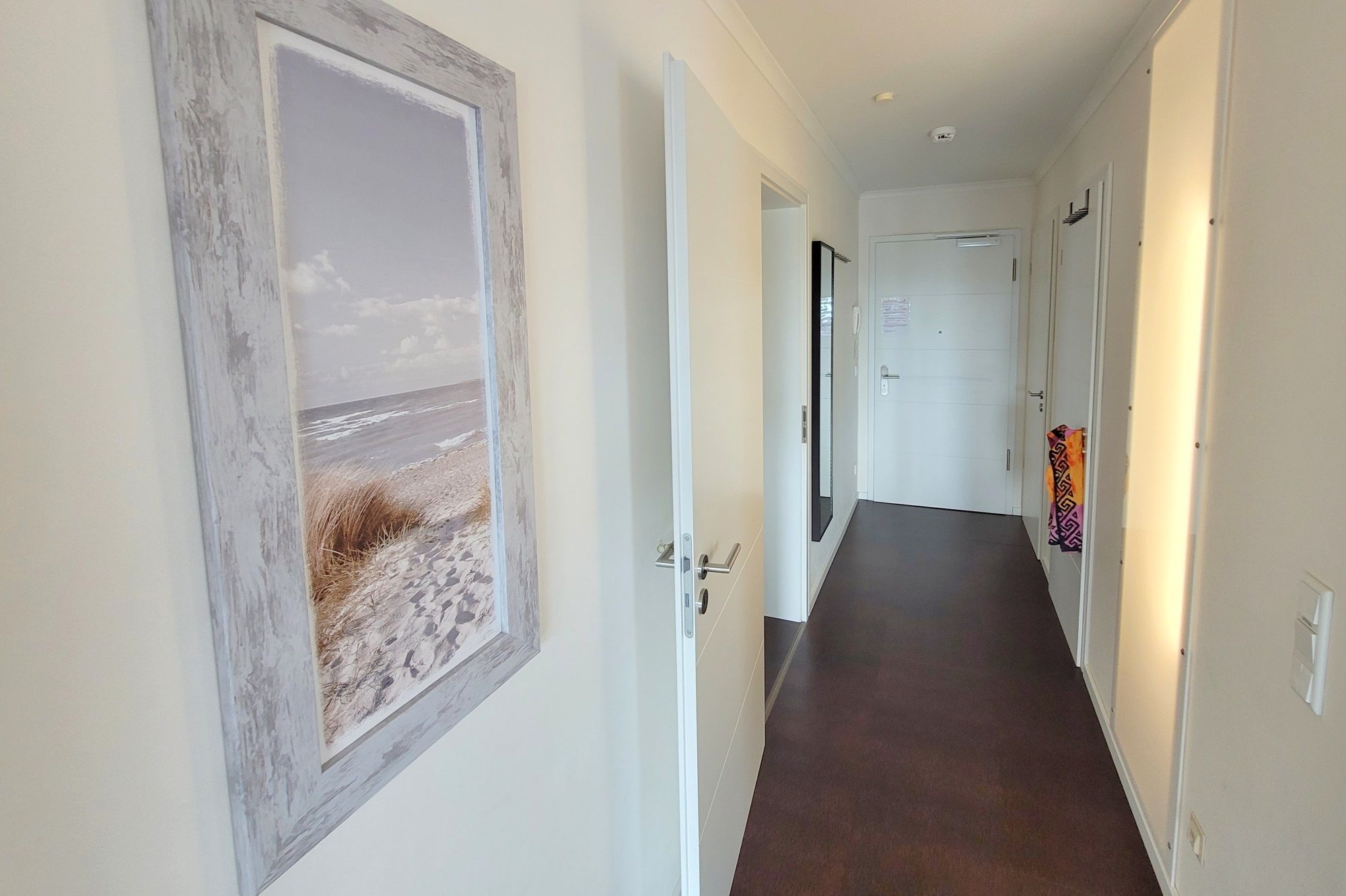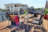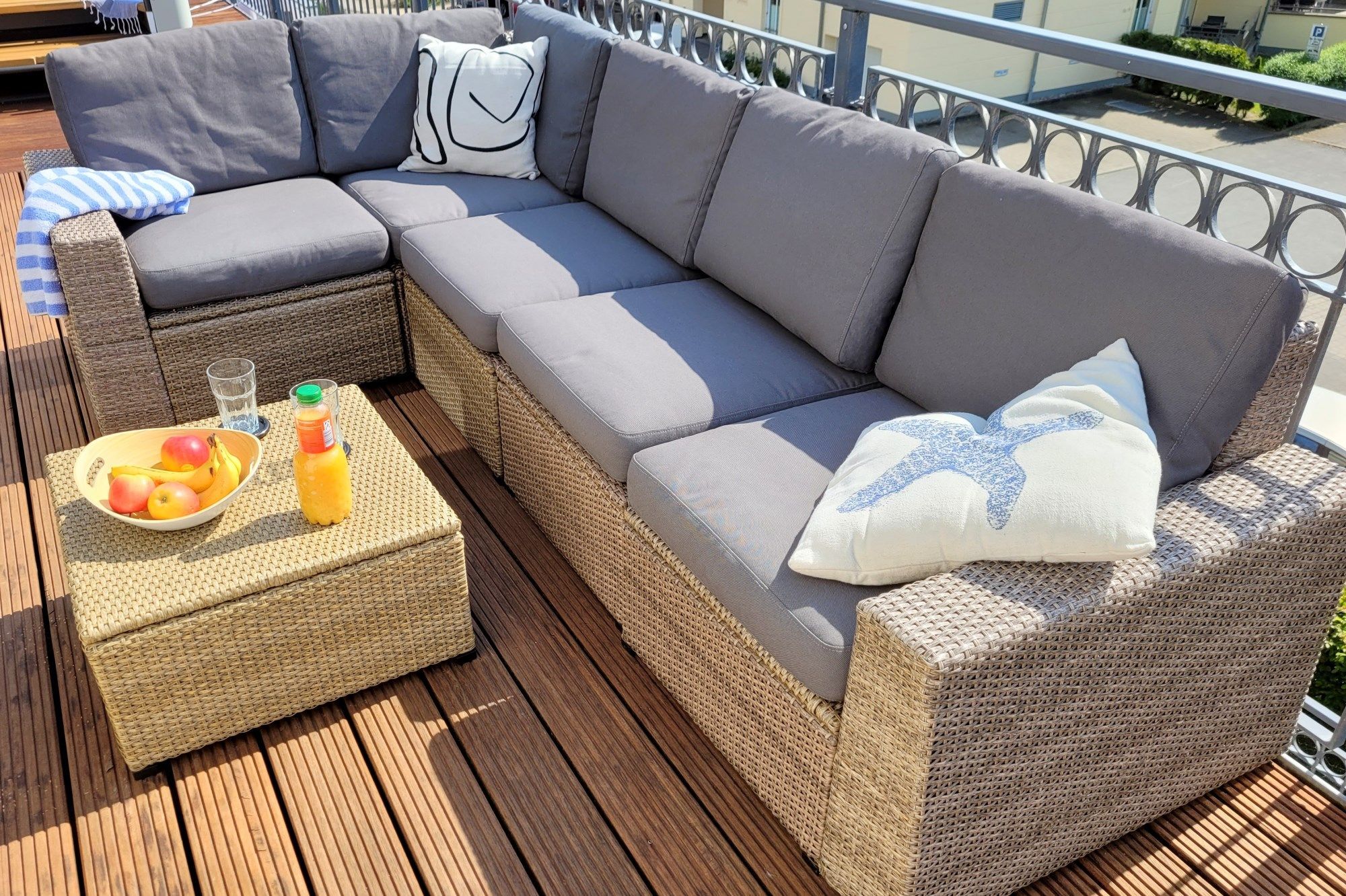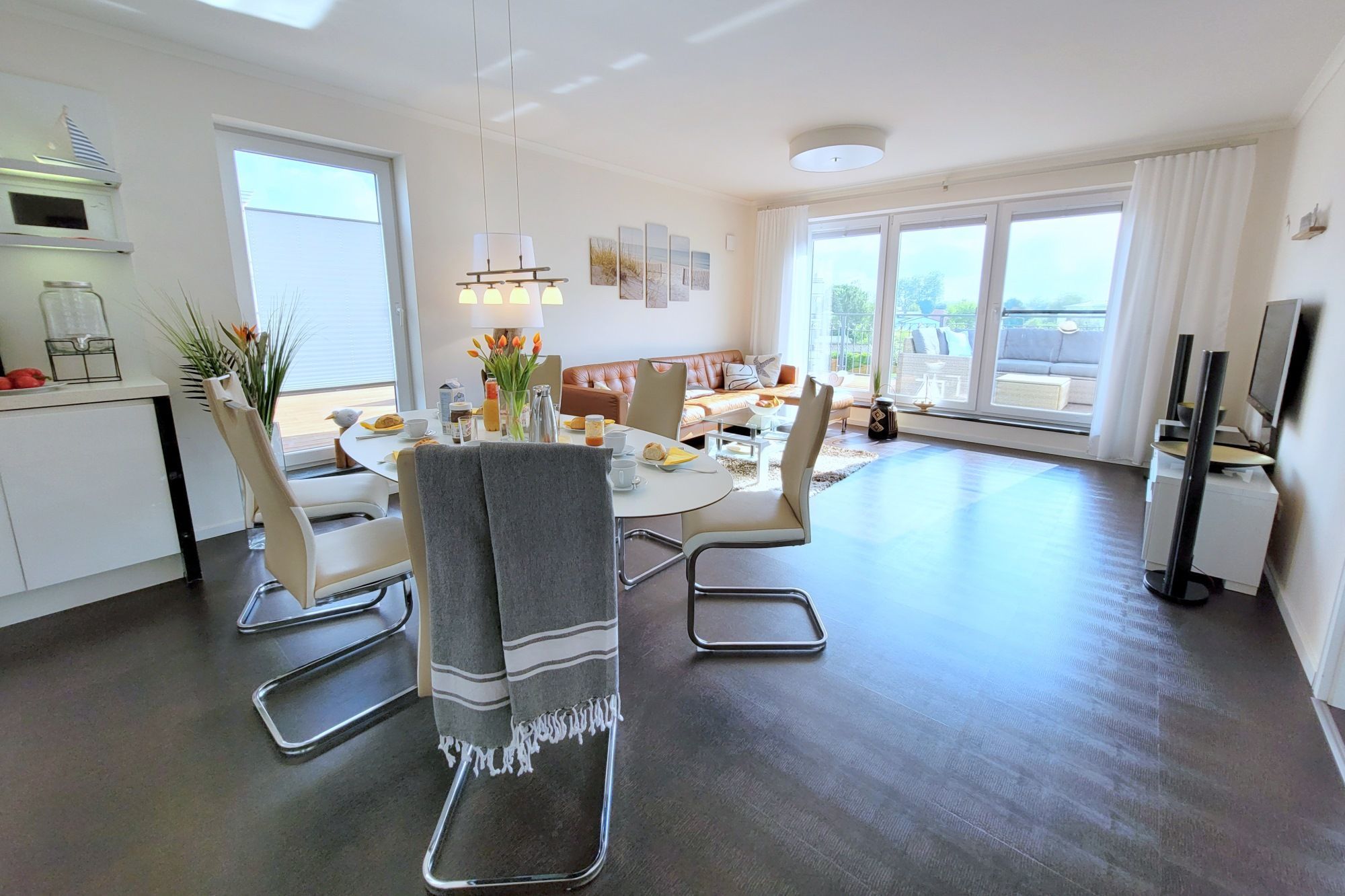 Strandnahe 3 Raum-Penthouse-Wohnung für vier Personen, Balkon (große Dachterrasse), Strandkorb und seitlichem Meerblick im 2. OG.