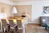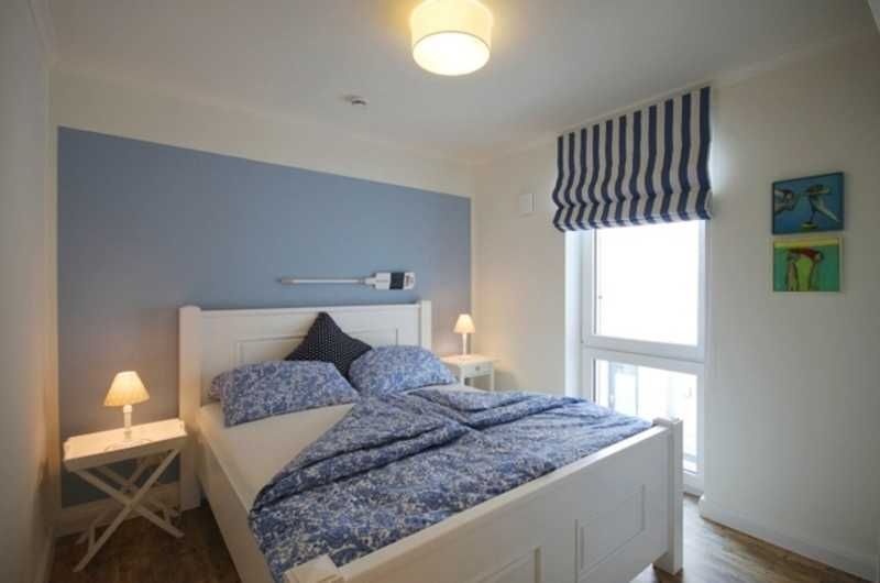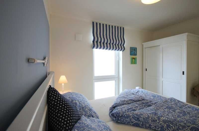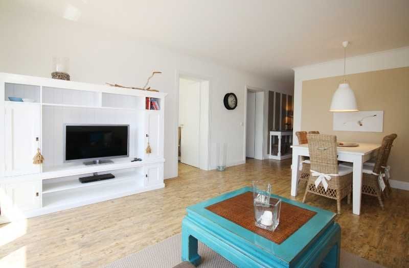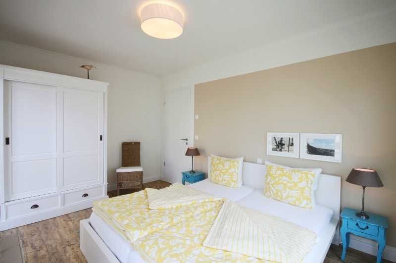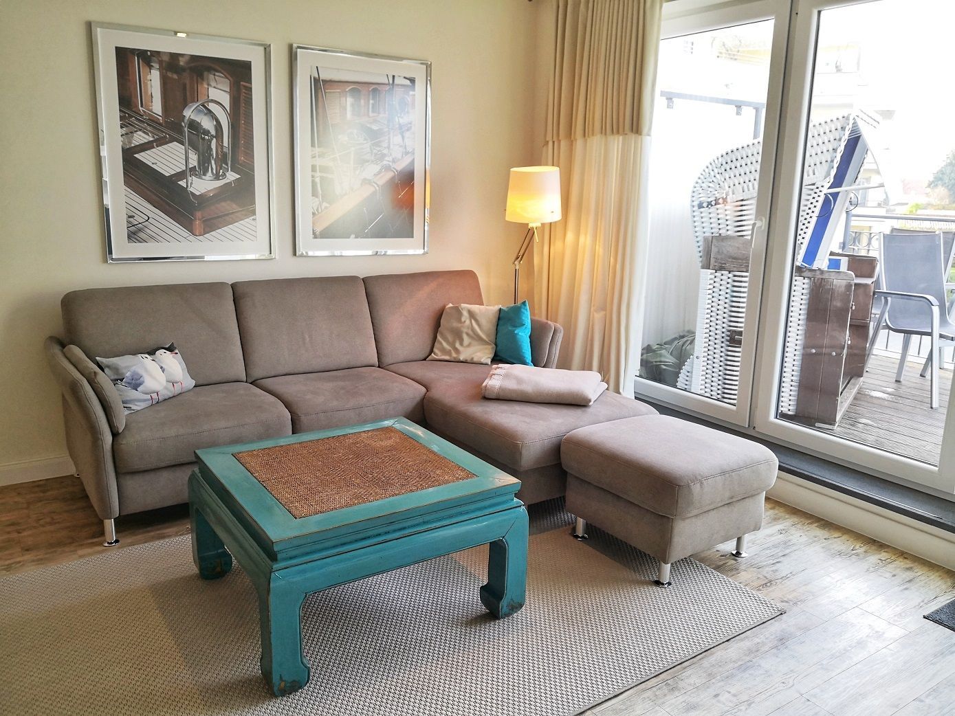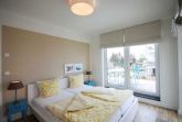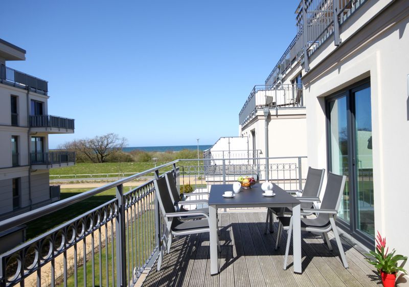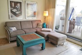 Strandnahe 3-Raumwohnung für max. 4 Erwachsene und 1 Kleinkind, zwei Schlafzimmer, zwei Bäder, Balkon mit Strandkorb und seitlichem Meerblick im 1.OG.