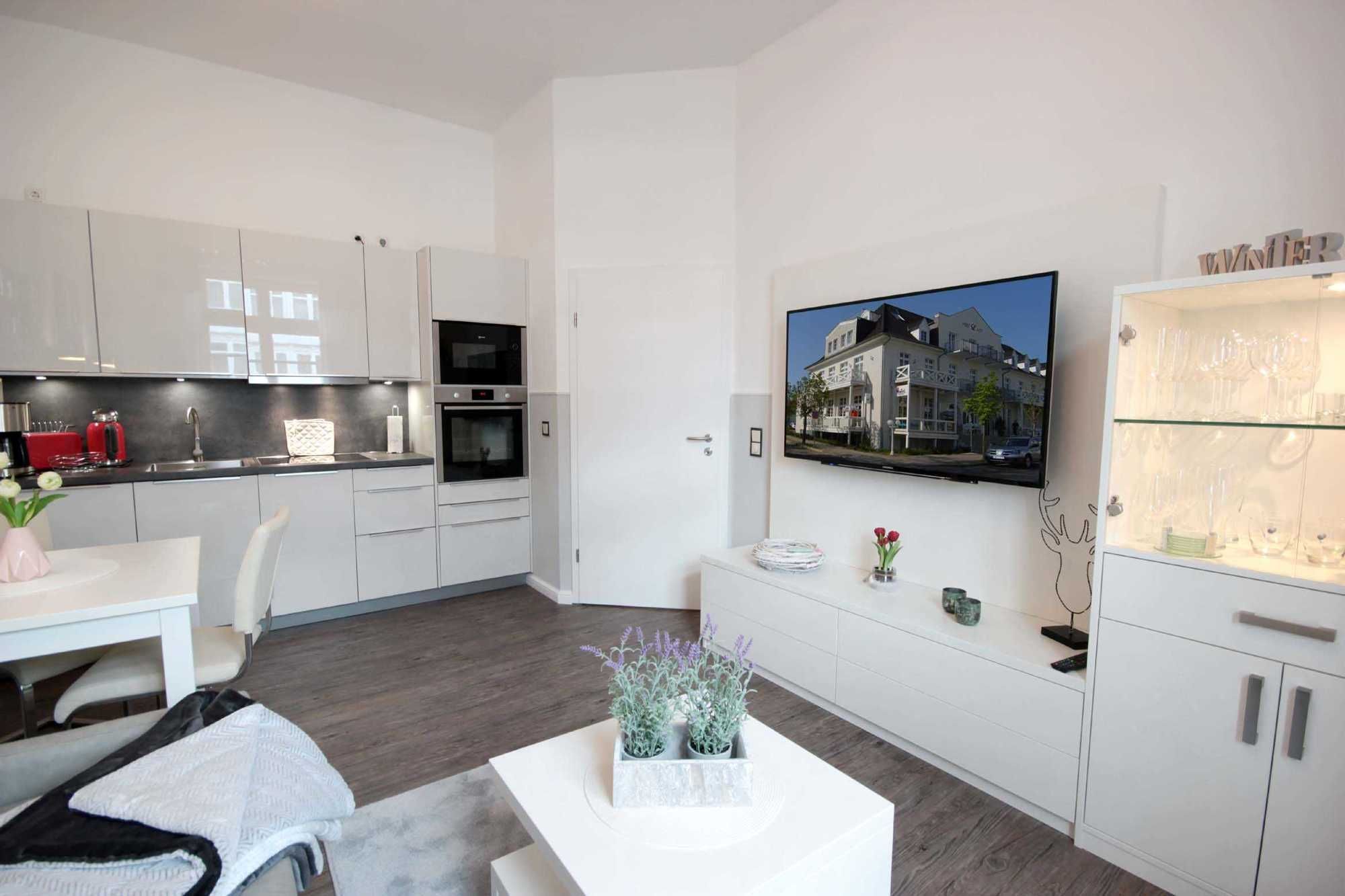 Die im Jahre 2019 renovierte 2-Zimmerwohnung 26RB6 mit Balkon hat eine Größe von ca. 45 qm und ist für 2 Personen eingerichtet. Sie befindet sich im 1. Obergeschoss. Im modernen Wohnraum befindet sich eine komplett ausgestattete Küchenzeile mit Markeneinbaugeräten wie einem Geschirrspüler, Backofen, Ceranfeld, Kühlschrank, Mikrowelle, Kaffeemaschine und Toaster. Im separaten Schlafraum finden Sie ein bequemes Boxspringbett sowie einen geräumigen Kleiderschrank. Vom vorgelagerten Flur aus erreichen Sie das Duschbad mit Waschtisch, WC und Fön. Im Wohnraum gibt es zudem ein gemütliches Sofa, ein Essbereich sowie einen großen Flachbild-TV. Alle unserer Gäste können einen kostenfreien W-LAN-Zugang nutzen. Ein PKW-Stellplatz steht Ihnen auf dem Parkplatz „Zentrum“ ( ca. 400 m vom Objekt entfernt ) zur Verfügung.
