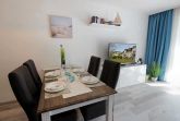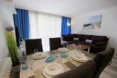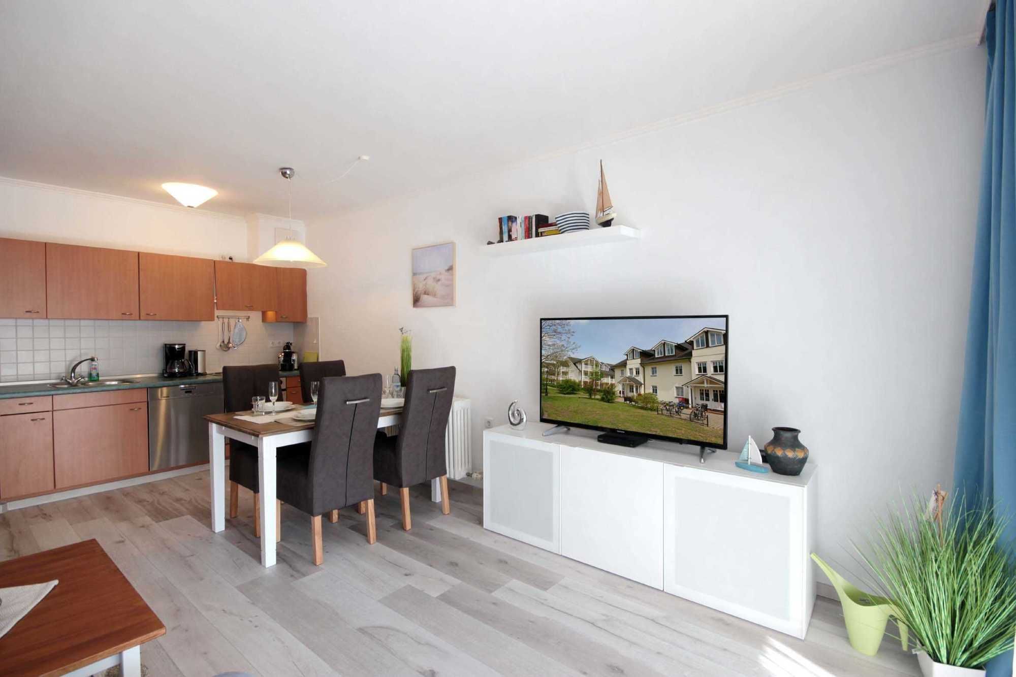 Ihre modern eingerichtete 2-Raum Ferienwohnung 16RB104 hat eine Größe von ca. 62 qm und ist für max. 4 Personen eingerichtet. Sie befindet sich 1. Obergeschoss und verfügt über einen überdachten Südbalkon. Der Wohnraum teilt sich in eine Küchenzeile mit Mikrowelle, Kühlschrank, Geschirrspüler, Kaffeemaschine, Toaster und andere Küchenhelfer sowie einen gemütlichen Essplatz und Wohnbereich mit Flachbild-TV, Stereoanlage und Blu-ray DVD-Player. Die Couch kann für 2 Personen zum Schlafen schnell ausgezogen werden, zudem verfügt das Wohnzimmer über zusätzliche Verdunklungsstoffe für einen angenehmen Schlaf. Vom Wohnraum gelangen Sie auf den großen und möblierten Südbalkon, der auch für 4 Personen reichlich Platz zum Sitzen oder Sonnen bietet. Vom Schlafraum mit Doppelbett, zusätzlichem TV und Verdunklungsstoffen gelangen Sie in den Ankleideraum und von diesem ins Bad (das Bad ist auch über den Flur erreichbar). Dieses ist mit einer Fußbodenheizung versehen und exklusiv mit Granit gefliest. Dusche, Waschtisch, WC und Fön gehören zur Ausstattung. Ihre Kleidung und Koffer können Sie im separaten Ankleidezimmer verstauen. Für die kleinen Gäste ist ein Kinderreisebett sowie ein Hochstuhl vorhanden. Ein Internetzugang steht unseren Gästen zur Verfügung. Ein wohnungseigener PKW-Stellplatz steht Ihnen in der Tiefgarage zur Verfügung.