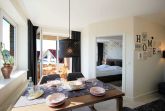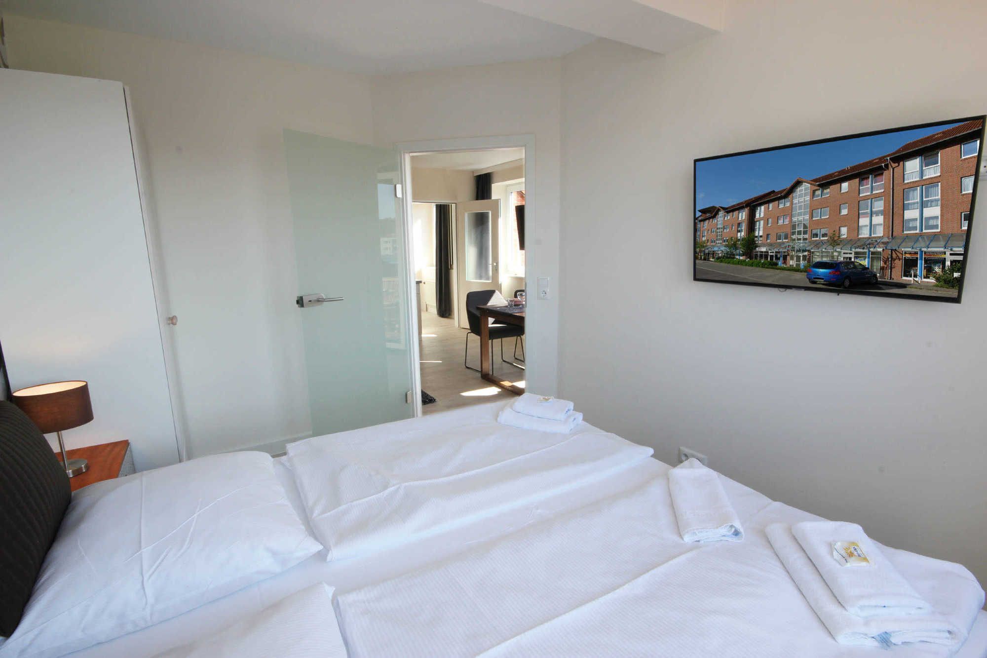 Ihre moderne Nichtraucher-Ferienwohnung 90603 befindet sich im 4. Obergeschoss. Die 2 Zimmer - Wohnung hat eine Größe von ca. 44 qm und ist mit bis zu 3 Personen nutzbar und verfügt über einen schönen Südwest Balkon. Neben dem hellen Wohnraum mit Loewe-Flachbildfernseher, gemütlicher Sitzecke mit Schlaffunktion für die 3. Person sowie sonnigem Esstisch gibt es einen Flur mit Garderobe, einen Schlafraum, eine komplette Küchenzeile im Wohnraum und ein modernes Badezimmer mit Waschtisch, Dusche und WC. Das gemütliche Schlafzimmer ist mit einem Boxspringbett, Kleiderschrank, zusätzlichem TV und Safe ausgestattet. Die Küche ist mit Geschirrspüler, Backofen, Ceranfeld, Kühlschrank, Kaffeemaschine, Wasserkocher, Toaster und diversen anderen Küchenhelfern komplett ausgestattet.