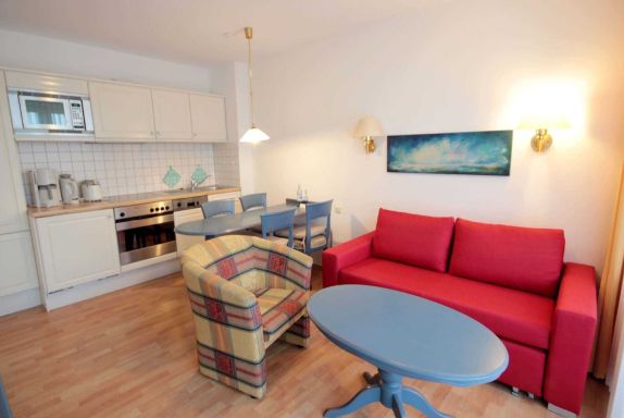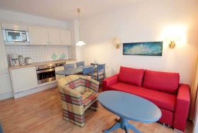 Dem hellen Wohnraum schließt sich die weiße Wohnküche und der Balkon an. Im separaten Schlafraum finden Sie ein Doppelbett und einen Kleiderschrank. Vom vorgelagerten Flur aus erreichen Sie das geräumige Duschbad. Im Wohnraum gibt es einen Essbereich und eine gemütliche Sitzecke mit Schlaffunktion sowie einen Fernseher, eine Stereo-Anlage sowie einen kostenfreien W-Lan-Zugang. Die Küche verfügt über einen Backofen, eine Mikrowelle, Kühlschrank, Geschirrspüler, Kaffeemaschine, Toaster und Wasserkocher. Ein PKW-Stellplatz steht Ihnen in dem ca. 300 m entfernten Parkhaus zur Verfügung.