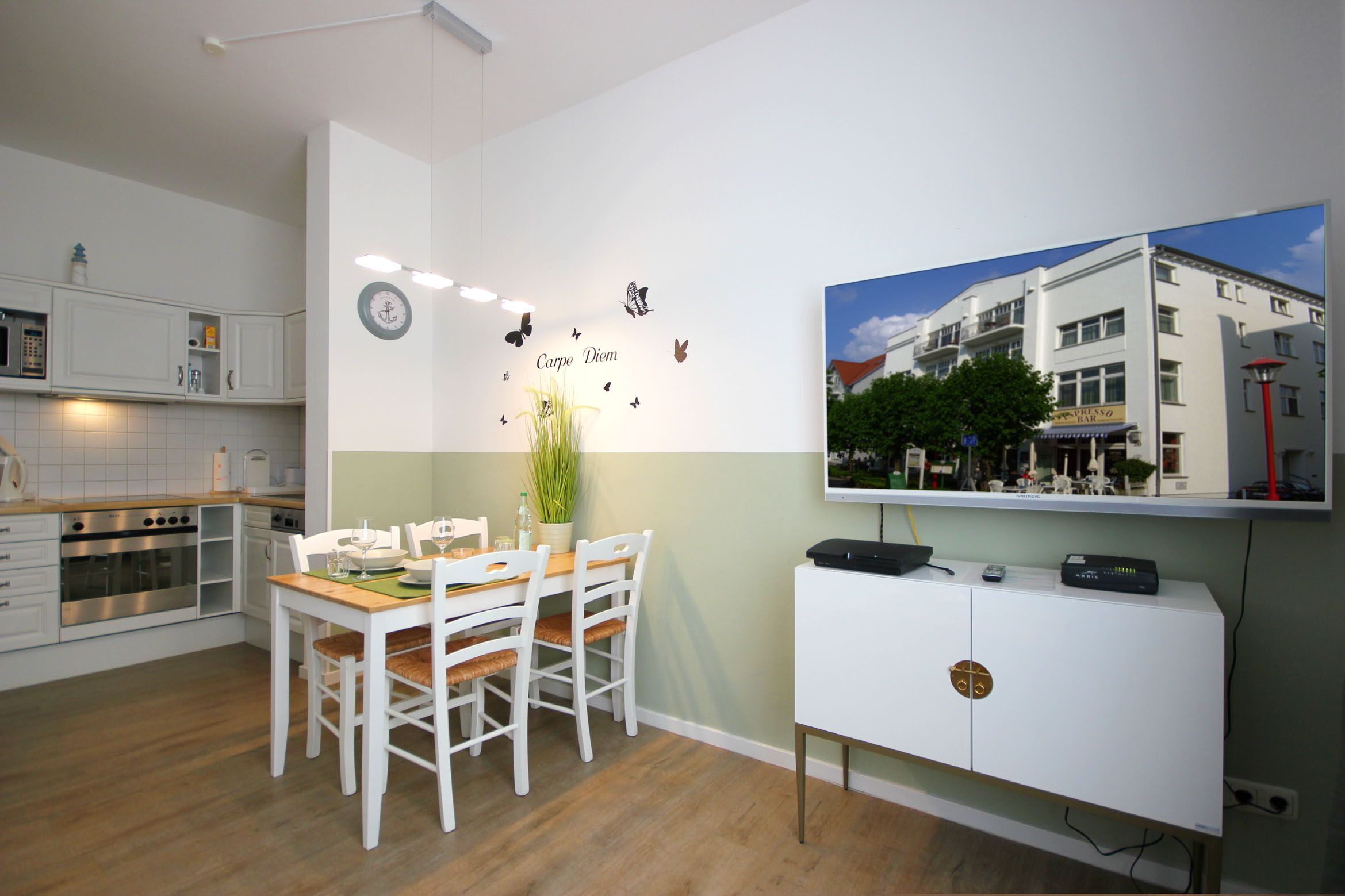 Über dem vorgelagerten Flur mit Garderobe erreichen Sie den gemütlichen Wohnraum mit Wohnküche und separatem Essbereich. Angrenzend gelangen Sie in den schönen Schlafbereich. Im separaten Schlafraum erwartet Sie ein bequemes Doppelbett, ein Kleiderschrank sowie Verdunklungsstoffe für eine erholsame Nachtruhe. Im Wohnzimmer gibt es eine gemütliche Sitzecke mit Schlaffunktion für die 3. und 4. Person, einen Smart-TV, eine Playstation 3 mit kleiner Spielesammlung sowie WLAN. Die Küchenzeile verfügt über einen Backofen, eine Mikrowelle, Kühlschrank, Geschirrspüler, Kaffeemaschine, Toaster und Wasserkocher. Vom vorgelagerten Flur aus erreichen Sie das geräumige Wannenbad mit zusätzlicher Dusche, Doppelwaschbecken sowie Fön.