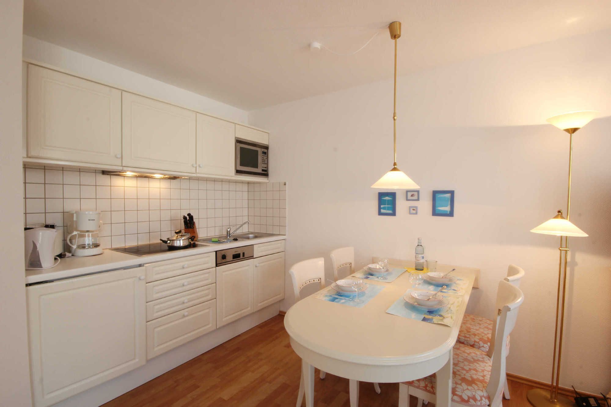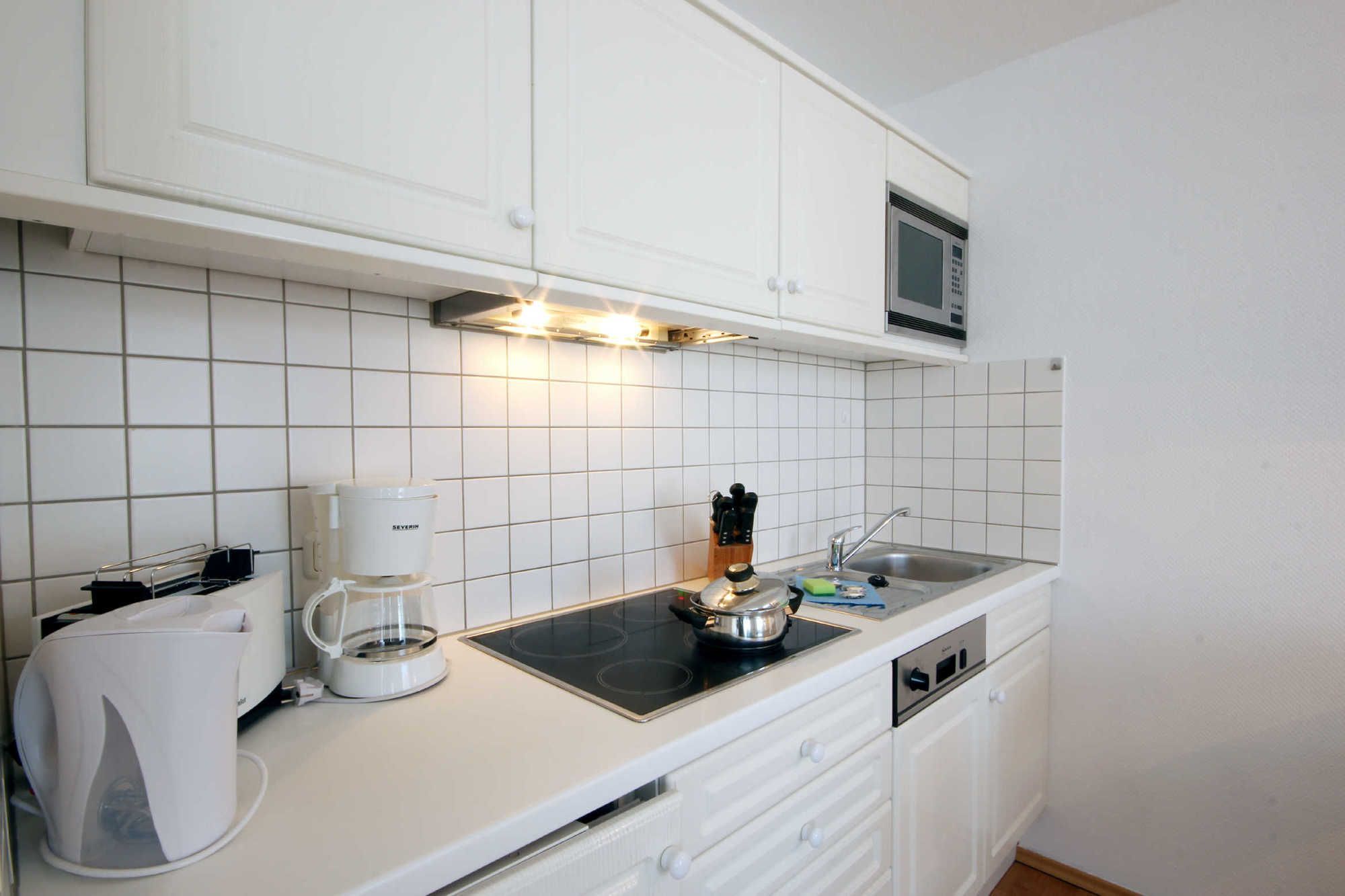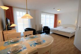 Dem kombinierten Wohn- Schlafraum schließt sich eine Küchenzeile und der Balkon an. Vom vorgelagerten Flur aus erreichen Sie das geräumige Duschbad mit Waschtisch, Handtuchheiztrockner und WC. Im Wohn-Schlafraum finden Sie neben einer Sitz- und einer Essecke ein Doppelbett, ein Flachbild-TV und einen kostenlosen WLAN-Zugang. Die Küche verfügt u.a. über Geschirrspülmaschine, Mikrowelle Kühlschrank, Kaffeemaschine, Toaster, Wasserkocher und diverse andere Küchenhelfer. Im Flur finden Sie einen geräumigen Kleiderschrank. Ihr Vierbeiner ist hier Herzlich Willkommen! Ein kostenloser PKW-Stellplatz steht Ihnen auf dem Parkplatz Zentrum (ca. 400 m vom Objekt entfernt) während Ihres Aufenthaltes zur Verfügung.