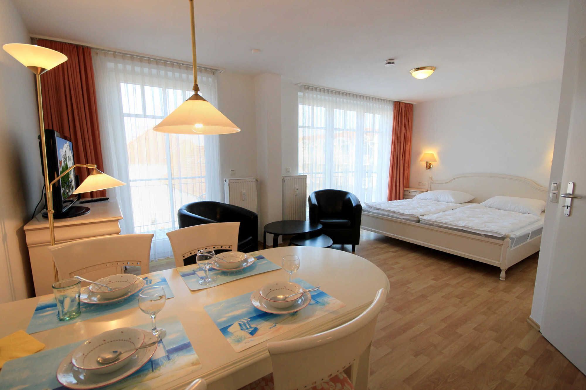 Ihre 1-Zimmerwohnung 23RB22 hat eine Größe von ca. 35 qm und ist für 2 Personen eingerichtet. Sie befindet sich im 3. Obergeschoss und verfügt über einen großen Frühstücksbalkon.
