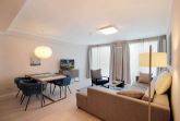 Der stilvoll eingerichtete Wohnbereich, mit Zugang zum Balkon, ist mit einer Sitzgruppe mit Schlaffunktion und Flachbild-TV ausgestattet.