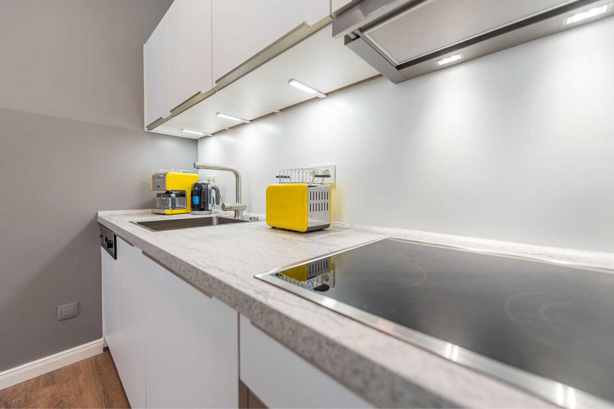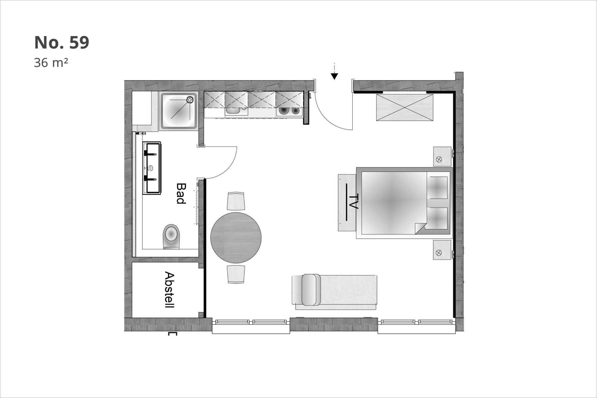Neben dem kombinierten Wohn- / Schlafraumraum mit offener Küche und Essbereich, gibt es ein Badezimmer mit Waschtisch, Dusche, Handtuchheiztrockner und WC. Zur technischen Ausstattung gehört ein Flachbild-TV mit integriertem Radio und kostenlosem Internetzugang. Die neue Küche ist mit Geschirrspülmaschine, Backofen inkl. Mikrowellenfunktion, Cerankochfeld, Kühlschrank und diversen Kleingeräten perfekt ausgestattet.