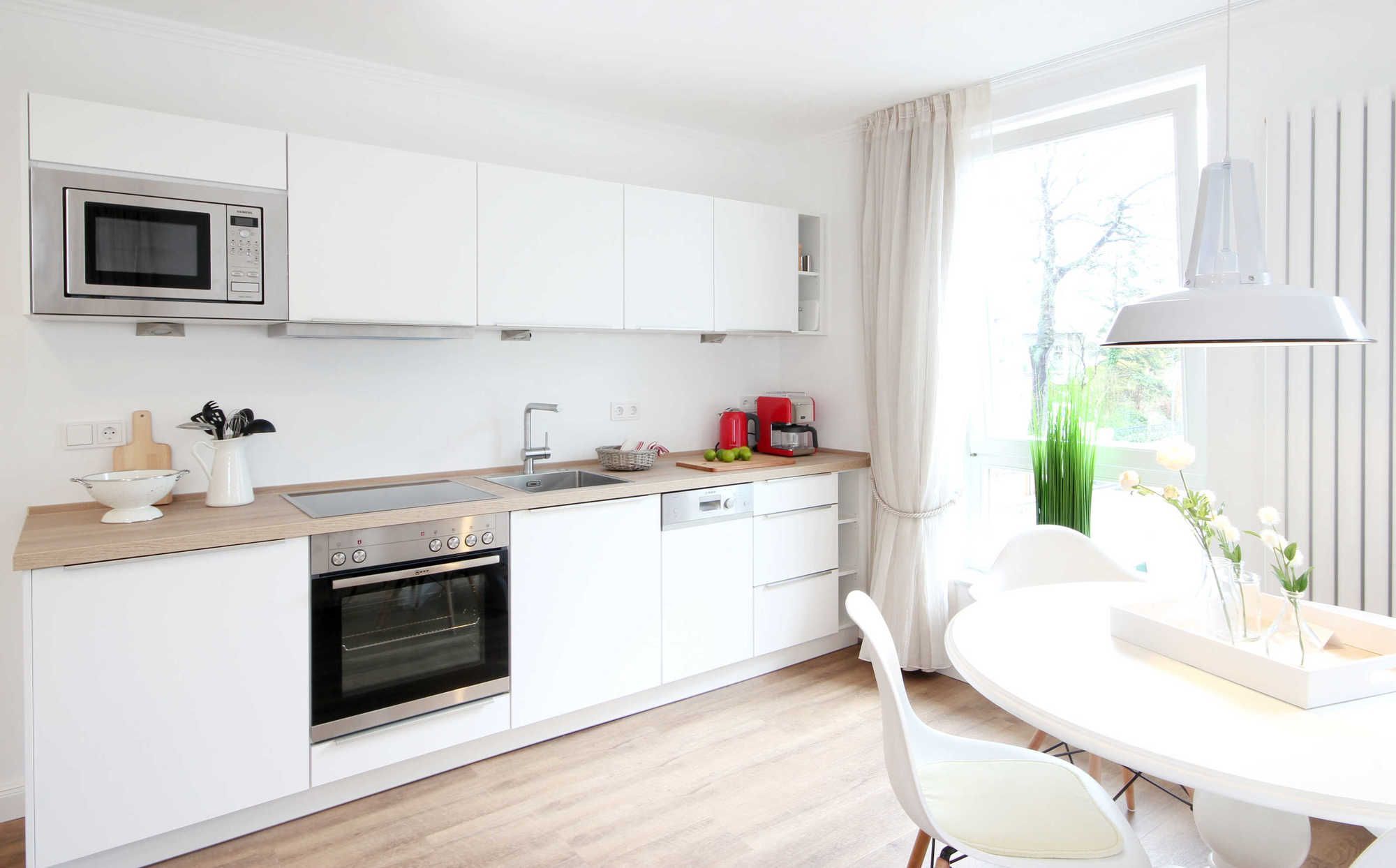 Neben dem Wohnraum mit offener Küche gibt es einen Schlafraum, sowie ein Badezimmer mit Doppelwaschbecken, Fön, Dusche und WC. Der Schlafraum ist mit einem Doppelbett, TV und einem großen Kleiderschrank ausgestattet. Außerdem finden Sie im komfortablen Wohnbereich neben der Sitzecke mit Schlafsofa (Liegefläche 2m x 1.65m) für die 3. und 4. Person einen separaten Essplatz, TV mit integriertem Radio und kostenfreiem WLAN. Die moderne Küche ist mit Geschirrspülmaschine, Mikrowelle, Cerankochfeld, Backofen, Kühlschrank und diversen Kleingeräten ausgestattet. Ein wohnungseigener Parkplatz steht direkt am Haus zur Verfügung. Highlight: hauseigene Sauna zum Entschleunigen!