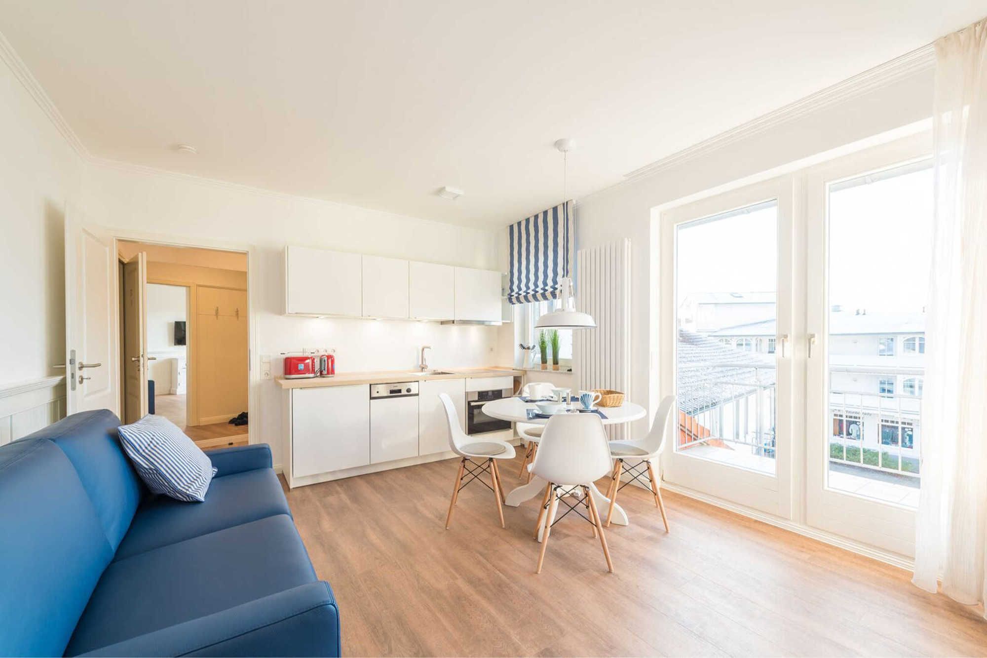 Neben dem Wohnraum mit offener Küche gibt es einen Schlafraum, sowie ein Badezimmer mit Waschtisch, Dusche und WC. Der Schlafraum ist mit einem Doppelbett und einem großen Kleiderschrank ausgestattet. Außerdem finden Sie im komfortablen Wohnbereich neben der Sitzecke mit Schlafsofa für die 3. und 4. Person einen separaten Essplatz, TV mit integriertem Radio und kostenlosem Internetzuganag. Die moderne Küche ist mit Geschirrspülmaschine, Mikrowelle, Cerankochfeld, Kühlschrank und diversen Kleingeräten ausgestattet.