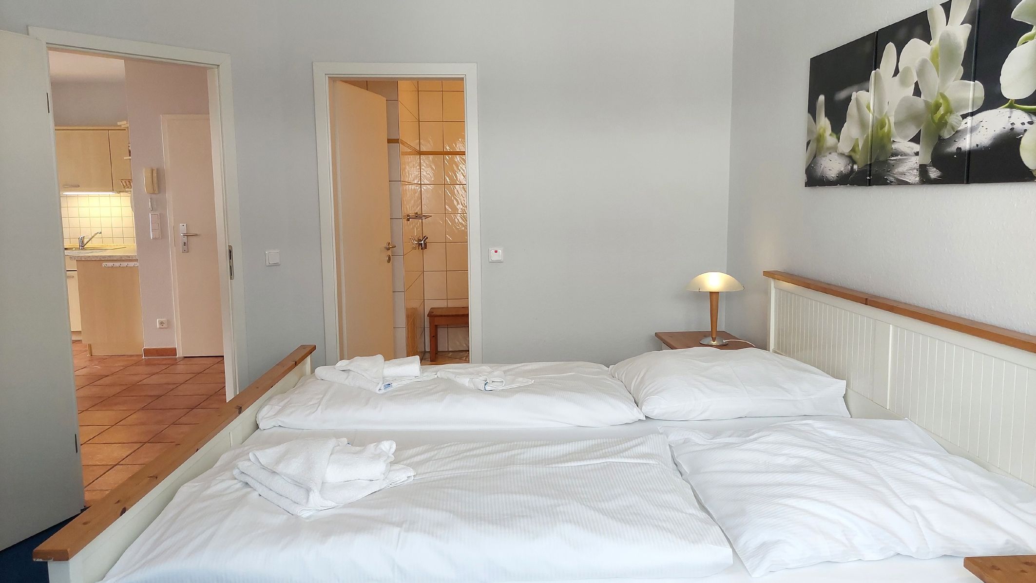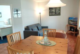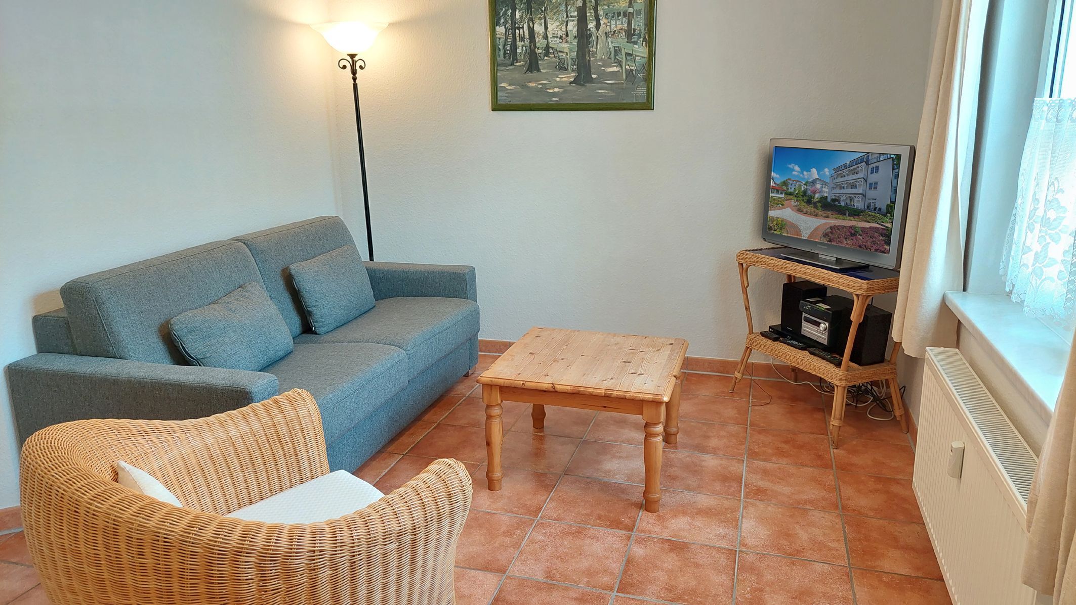 Neben dem Wohnraum mit offener Küche und Essbereich gibt es einen separaten Schlafraum sowie ein innenliegendes Duschbad mit Waschtisch, Dusche und WC. Der Schlafraum ist mit einem Doppelbett und einem großen Kleiderschrank ausgestattet. Im komfortablen Wohnraum können auf dem Schlafsofa zwei weitere Personen schlafen. Des Weiteren verfügt der Wohnbereich mit Sitzecke über einen Flachbild-TV, Bluray-Player, Musikanlage und einen kostenlosen WLAN-Zugang.