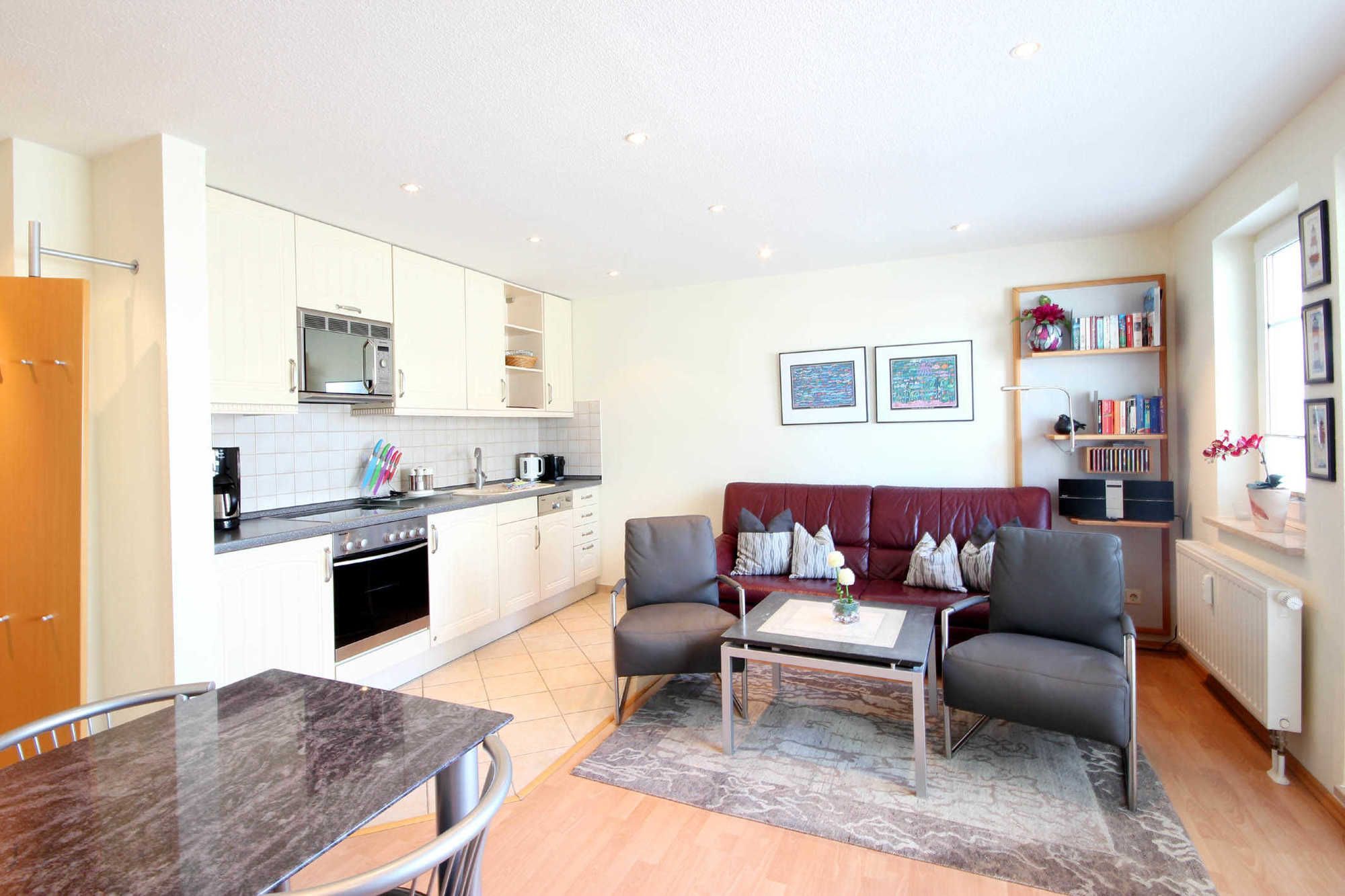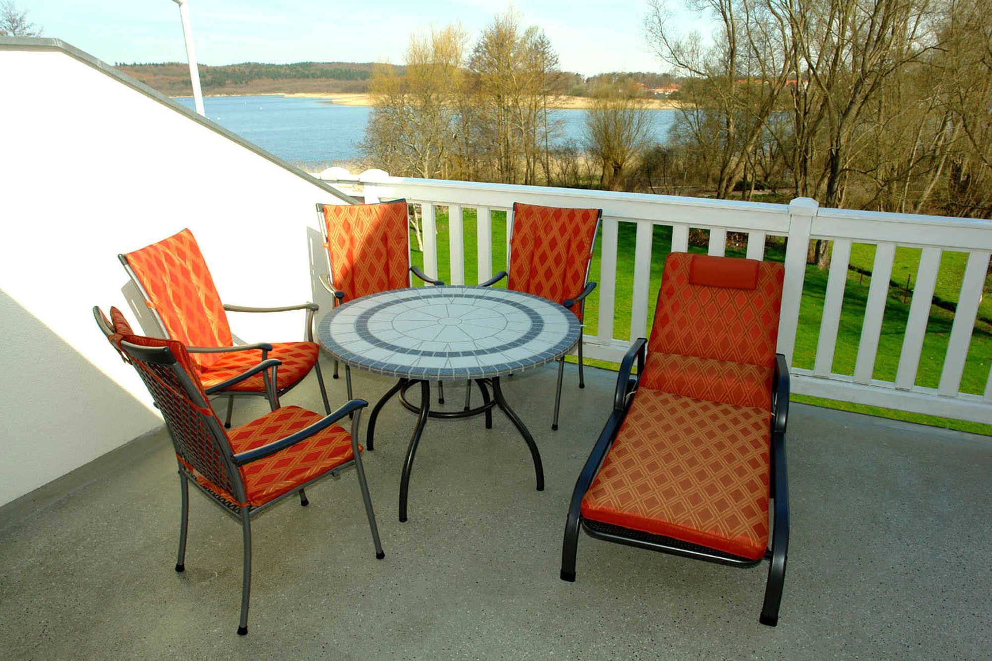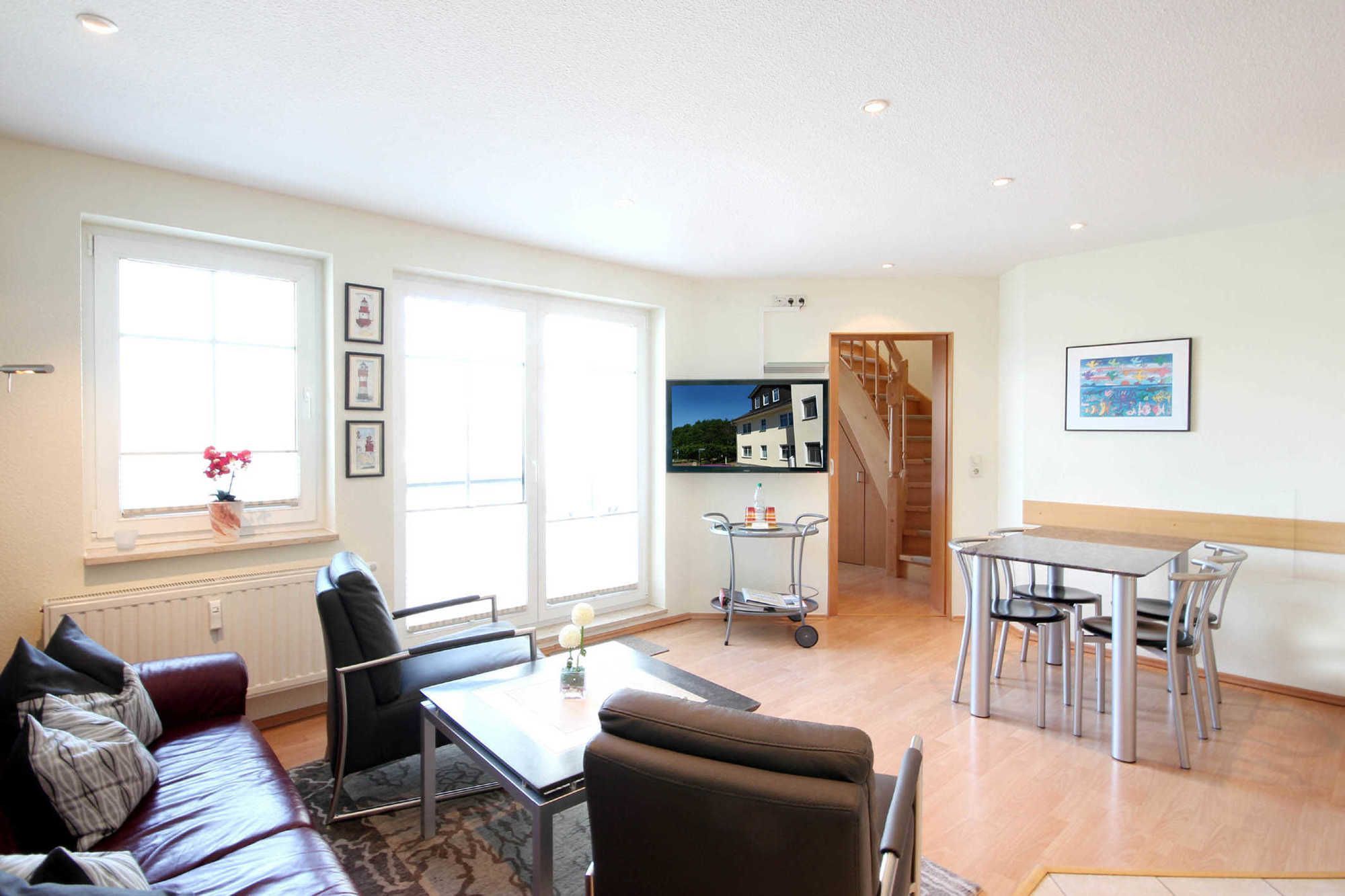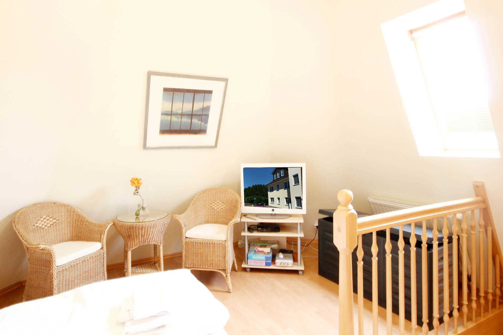 Ihre gemütliche Maisonette-Wohnung 90191 hat eine Größe von ca. 61 qm und ist für maximal 5 Personen eingerichtet. Sie befindet sich im 2. Obergeschoss und verfügt über eine große Dachterrasse Richtung Südwesten mit eigenem Strandkorb und wunderschönem Blick auf den Schmachter See. In der unteren Wohnebene finden Sie den Wohnraum mit komplett ausgestatteter Kochzeile, ein Duschbad und einen der beiden Schlafräume. Eine Wendeltreppe führt Sie in das Turmzimmer, in welches sich der 2. Schlafraum befindet. Der komfortable Wohnbereich verfügt über eine Sitzgruppe mit Schlafsofa für die 5. Person, Sitz- und Essplatz, Flachbild-TV und Musikanlage. Die Küchenzeile ist mit Geschirrspüler, Mikrowelle, Espressomaschine, Backofen, Ceranfeld und diversen Elektrogeräten (Kaffeemaschine, Toaster, Wasserkocher, Eierkocher, Allesschneider ) komplett ausgestattet. Das Bad verfügt über Dusche, Waschtisch und WC. In beiden Schlafräumen finden Sie jeweils ein Doppelbett und Flachbild-TV, im Turmzimmer zusätzlich mit DVD-Player. Ein Kleiderschrank befindet sich im Vorraum der beiden Schlafzimmer. Ein kostenfreier Internetzugang sowie eine separate Garage steht Ihnen zur freien Verfügung. Haustiere sind in dieser Wohnungen nicht erlaubt.