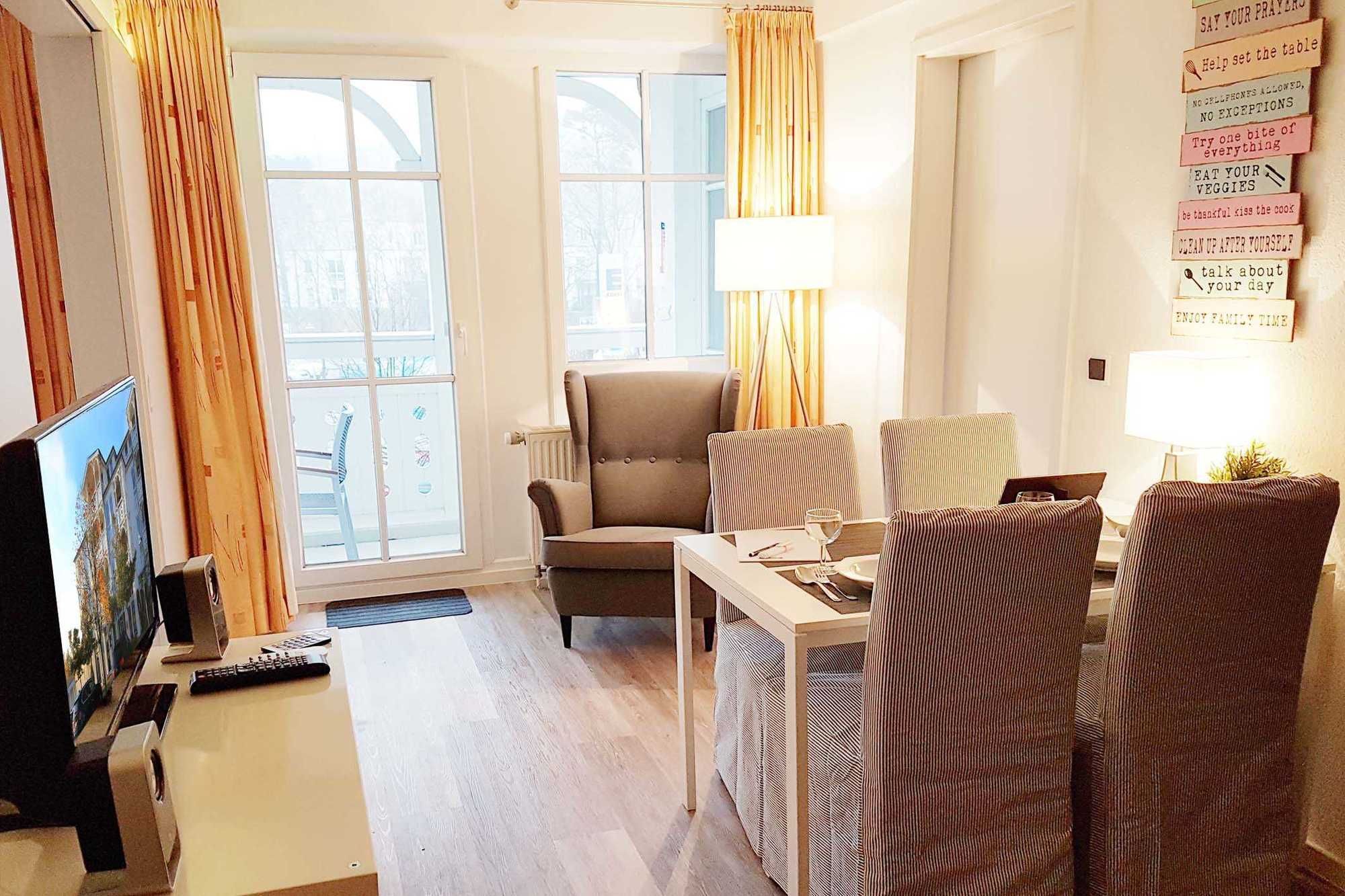 Ihre hochmodern ausgestattete 2-Zimmer Nichtraucher-Ferienwohnung 60RB643 befindet sich im Haus Mönchgut im Seepark Sellin. Sie ist ca. 52 qm groß und befindet sich im 2. Obergeschoss. Bis zu 4 Personen können sich gleich über zwei Balkone in östlicher Richtung freuen. Im lichtdurchfluteten Wohnraum finden Sie neben dem gemütlichem Schlafsofa, welches Platz für die 3. u. 4. Person bietet, auch einen Flachbild-TV, sowie den direkten Zugang zum Balkon. Im separaten Schlafzimmer mit Doppelbett und Kleiderschrank befindet sich der zweite Zugang zum anderen Balkon. Ein Badezimmer mit Badewanne inklusive Duschvorrichtung, Waschtisch, Kosmetikspiegel, Fön sowie eine separate Toilette steht Ihnen zur Verfügung. Die attraktive gut ausgestattete Wohnküche mit Cerankochfeld, Backofen, Mikrowelle, Kühl-/Gefrierkombination, Geschirrspüler, Kaffeemaschine, Wasserkocher, Toaster sowie diversen anderen Küchenhelfern lädt zum Kochen und gemeinsamen Essen ein. Darüber hinaus gibt es eine Musikanlage und einen Flachbild-TV auf einem Rollenregal.
