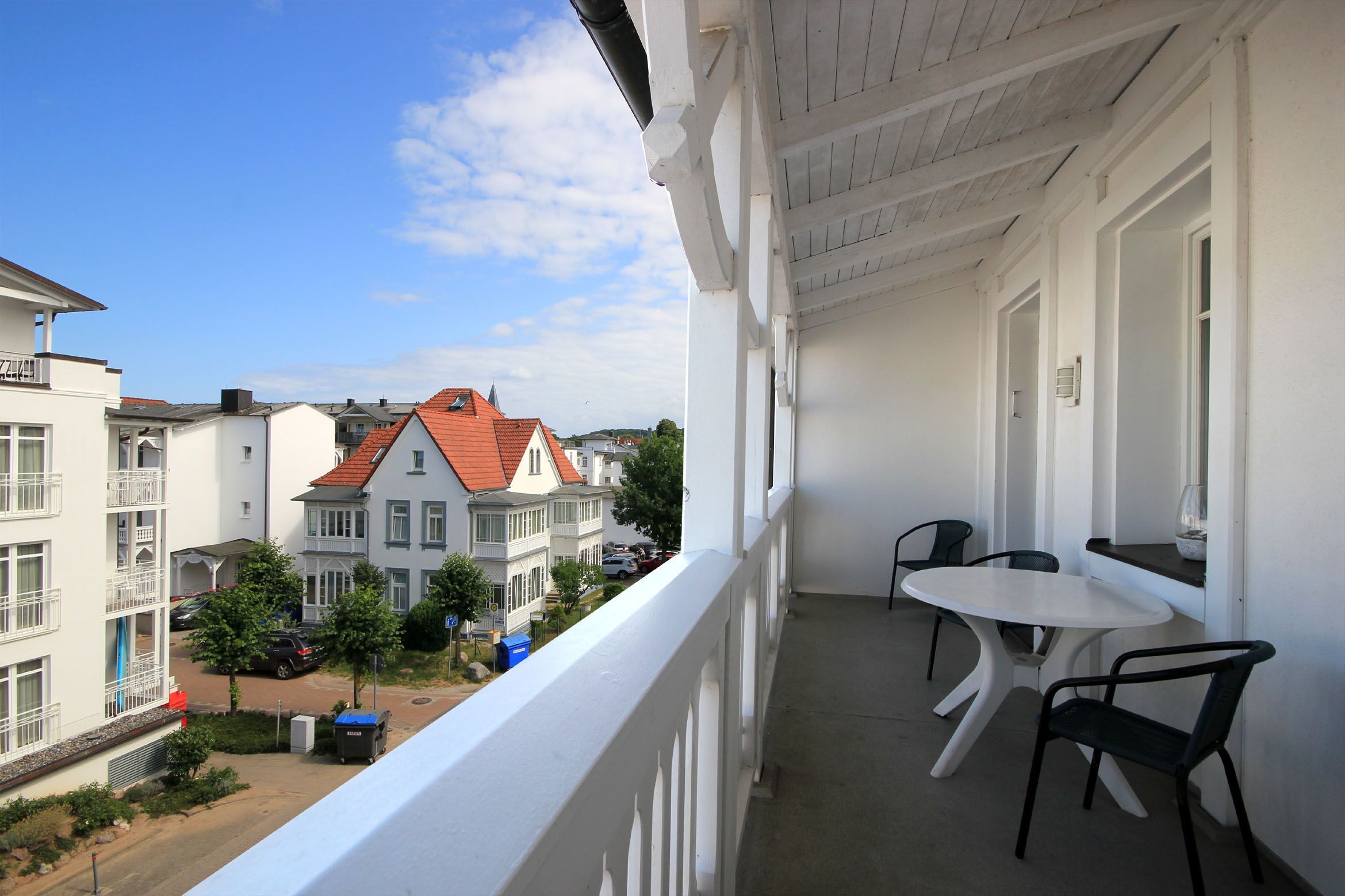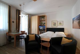 Ihre Ferienwohnung 1RB9 liegt im 2. Obergeschoss der Villa und hat einen schönen Balkon. Bis zu 3 Personen finden in dieser Wohnung mit einer Größe von 35 qm Ihren Platz. Die Wohnung hat neben dem Wohn-/Schlafraum mit integrierter Kochzeile einen separaten Vorraum mit ausklappbares Schrankbett und ein Badezimmer mit Waschtisch, Dusche und WC. Neben dem modernen Boxspringbrett (160x200) finden Sie auch eine kleine Sitzecke, einen separaten Essplatz, Flachbild-TV, Radio sowie einen kostenfreien WLAN-Zugang. Die Kochzeile ist mit Geschirrspüler, Mikrowelle, Kaffeemaschine und diversen Küchenhelfern komplett ausgestattet. Ein wohnungseigener Parkplatz steht für Sie direkt am Haus zur Verfügung. Ein Münz-Waschtrockner steht Ihnen im Keller des Nachbarhauses zur Verfügung. Den Fahrradabstellraum des Nachbarhauses können Sie ebenfalls nutzen.