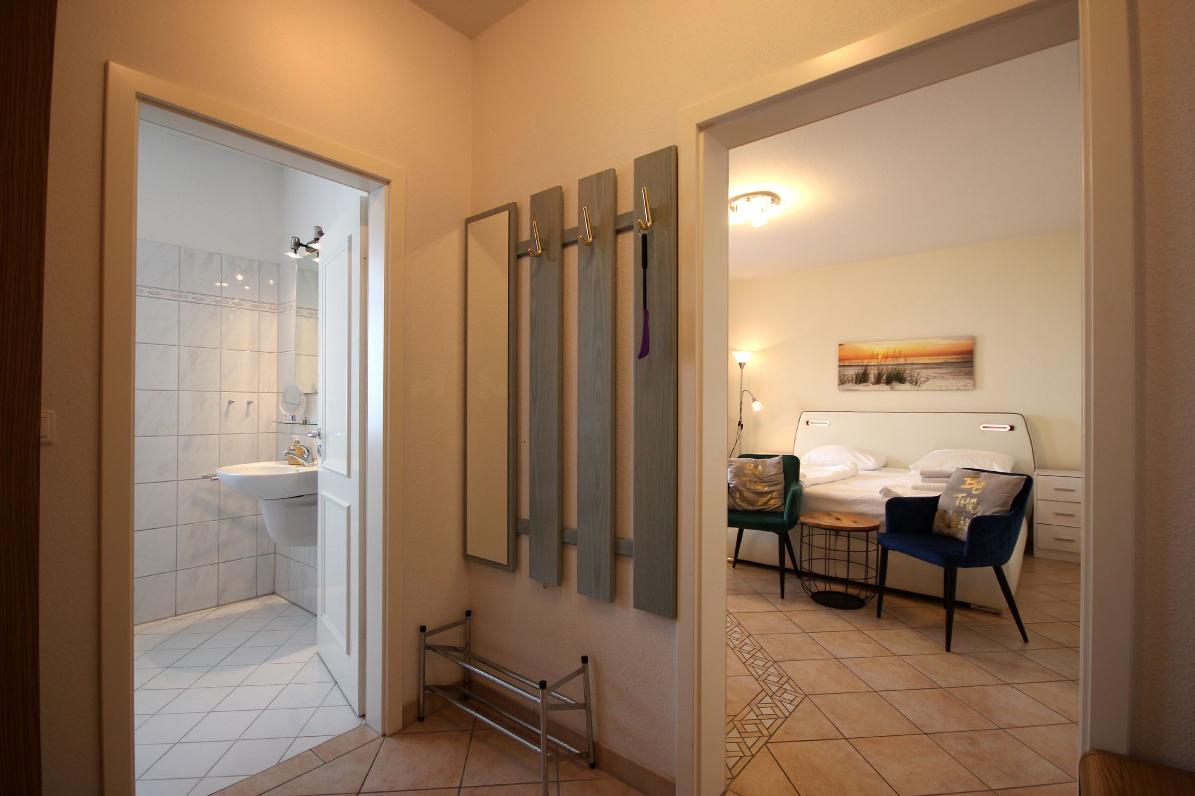 Ihre Ferienwohnung 1RB5 liegt im 1. Obergeschoss der Villa und hat einen schönen Balkon. Mit einer Größe von 35 qm ist die Wohnung ideal für zwei Personen geeignet. Das Appartement hat neben dem Wohn-/Schlafraum mit integrierter Kochzeile, einen separaten Vorraum und ein Badezimmer mit Waschtisch, Dusche und WC. Im Wohn-/Schlafraum finden Sie ein bequemes Doppelbett, eine Sitzecke, Flachbild-TV, Radio sowie einen separaten Essplatz. Die Kochzeile ist mit Kühlschrank, 2-Plattenherd, Kaffeemaschine, Toaster, Wasserkocher und anderen Küchenhelfern komplett ausgestattet.